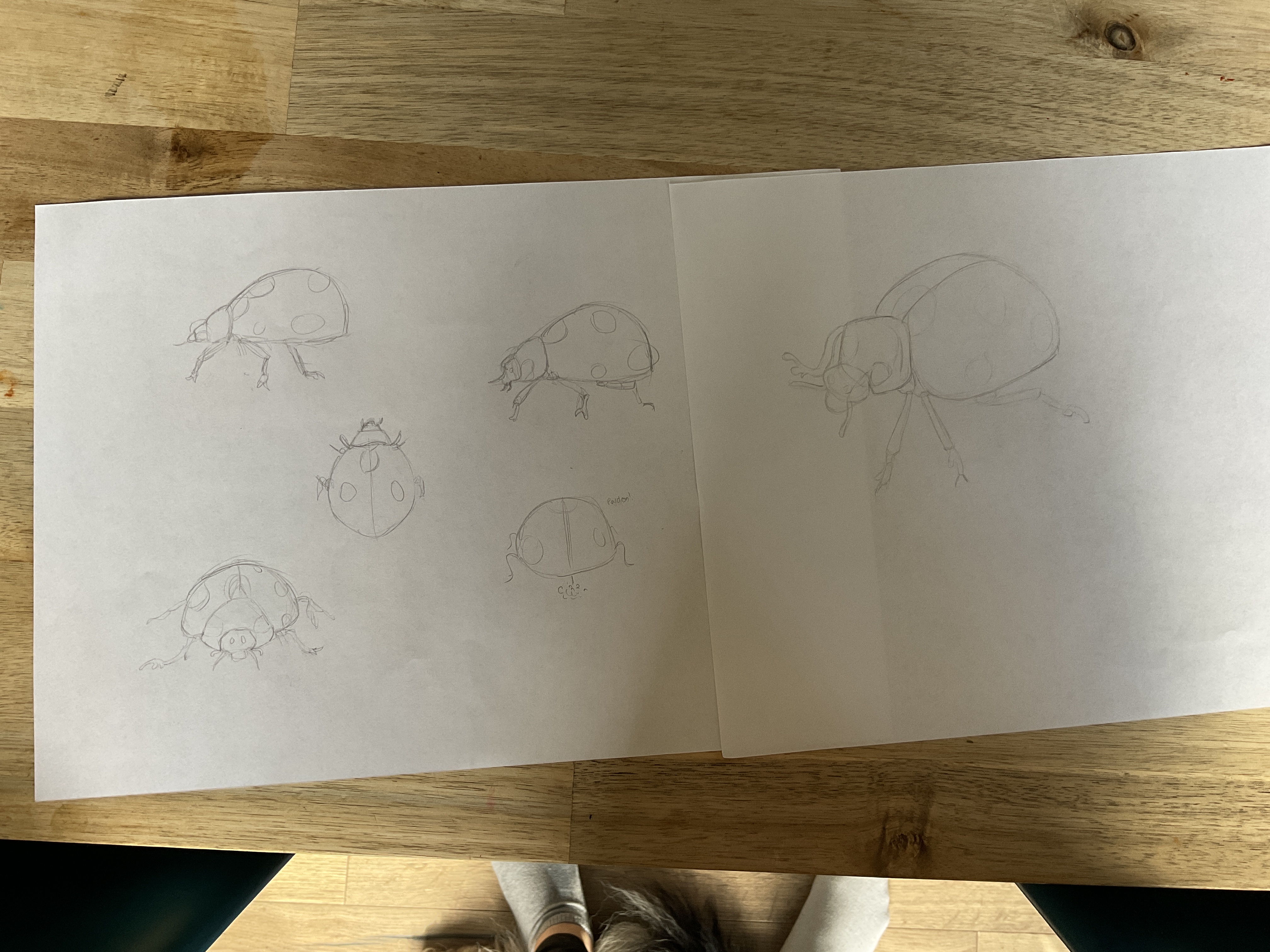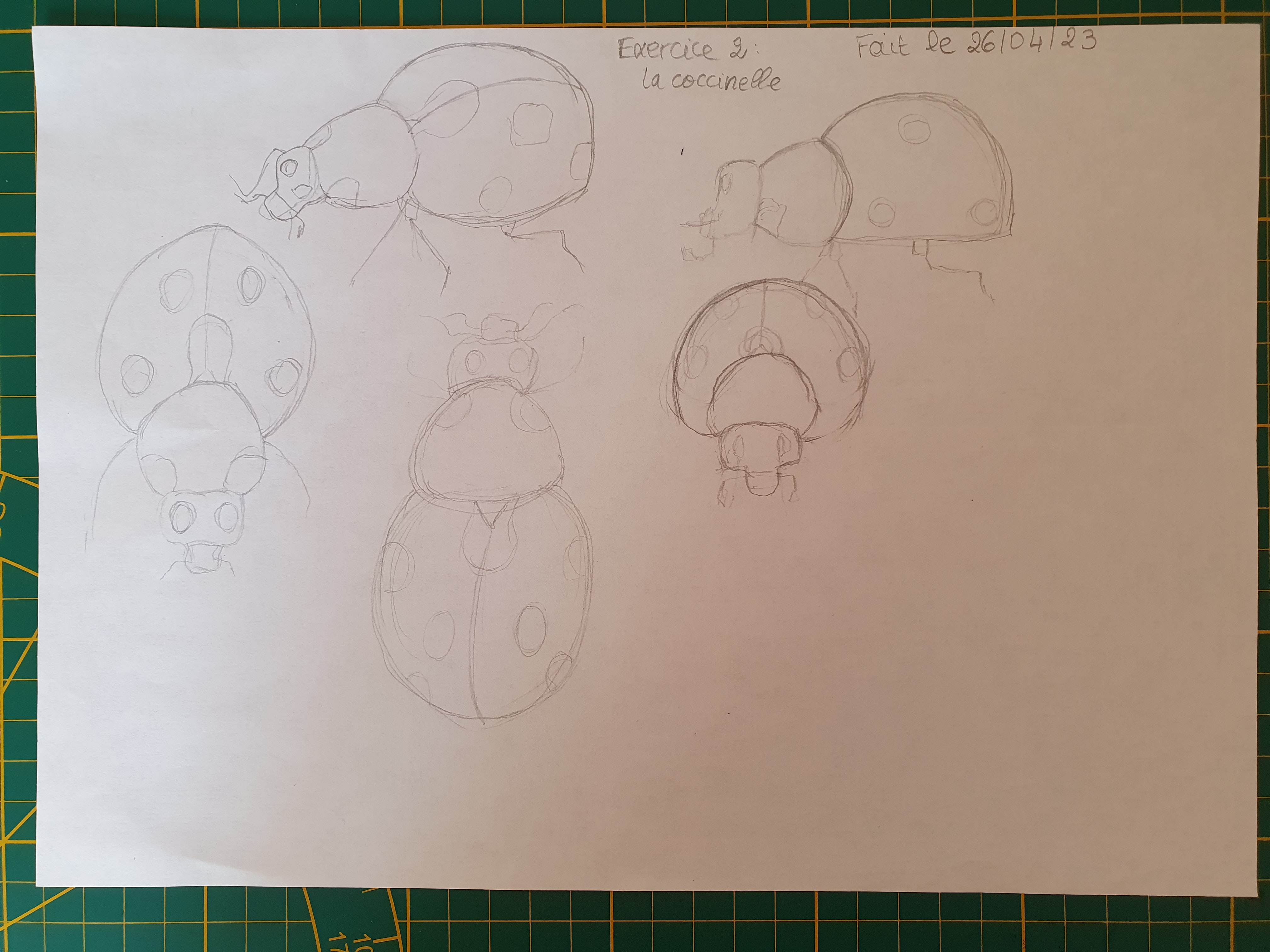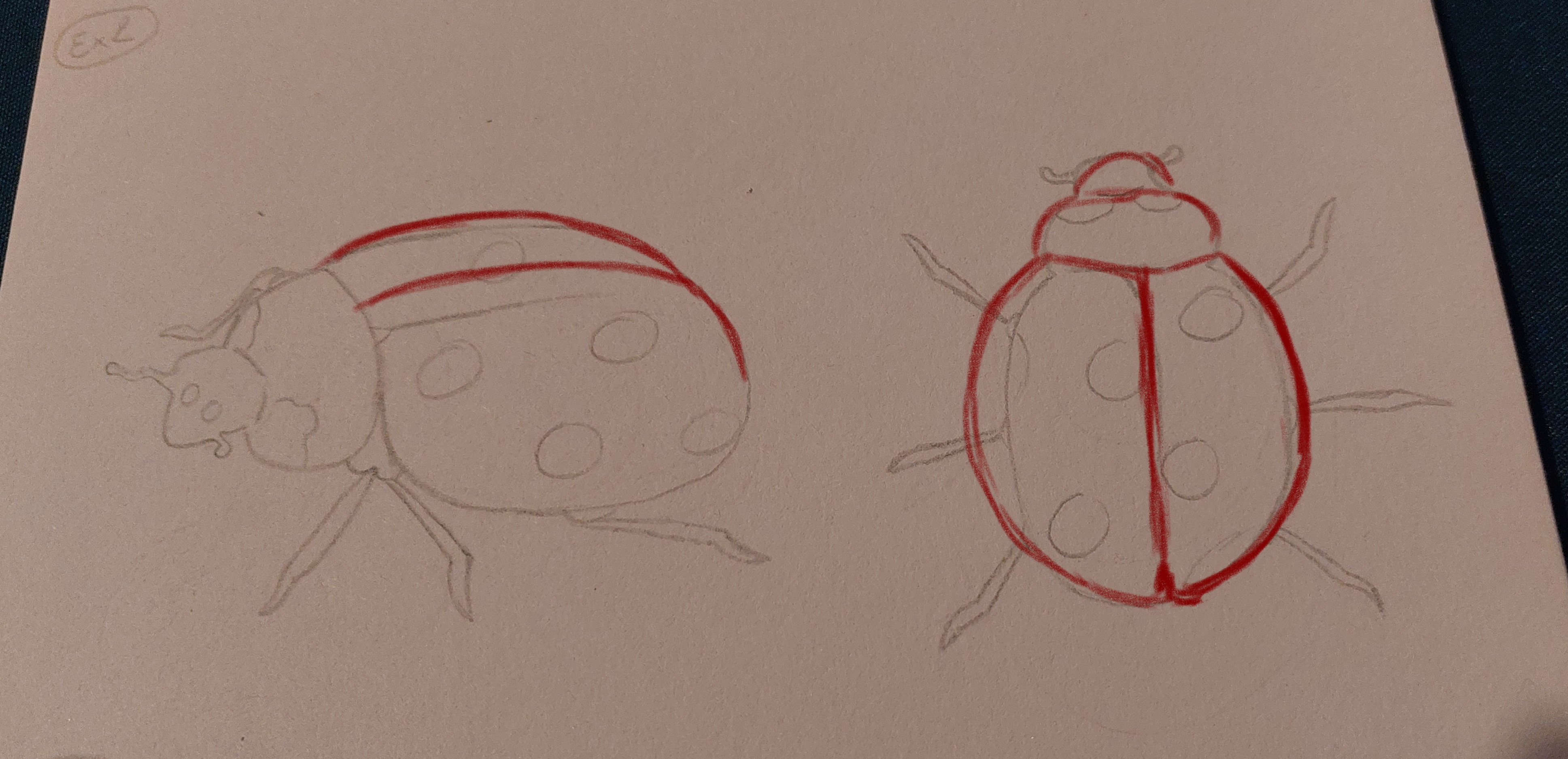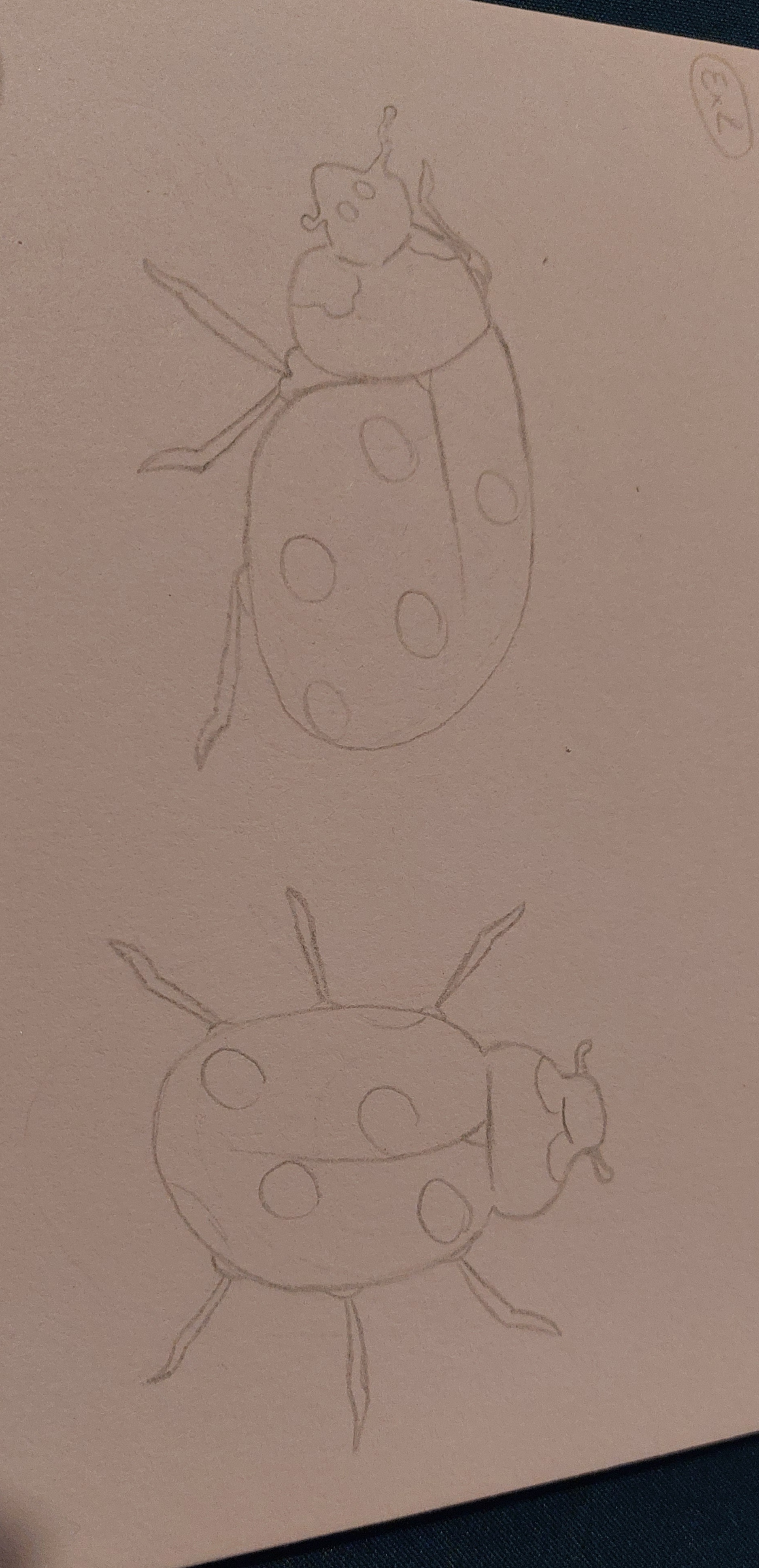 Fais attention au volume du corps de ta coccinelle, globalement, il devrait être plus gros, plus large sur les côtés, et plus bombé sur le dessus. Sur tes dessins, la partie tête a tendance à être trop grosse par rapport au corps, sur le premier dessin on peut même dire que la tête est prersqu'aussi grosse que le corps. Quand tu décomposes ton sujet, divise les différentes parties en essayant de respecter autant que possible leur forme et leur taille les unes par rapport aux autres.