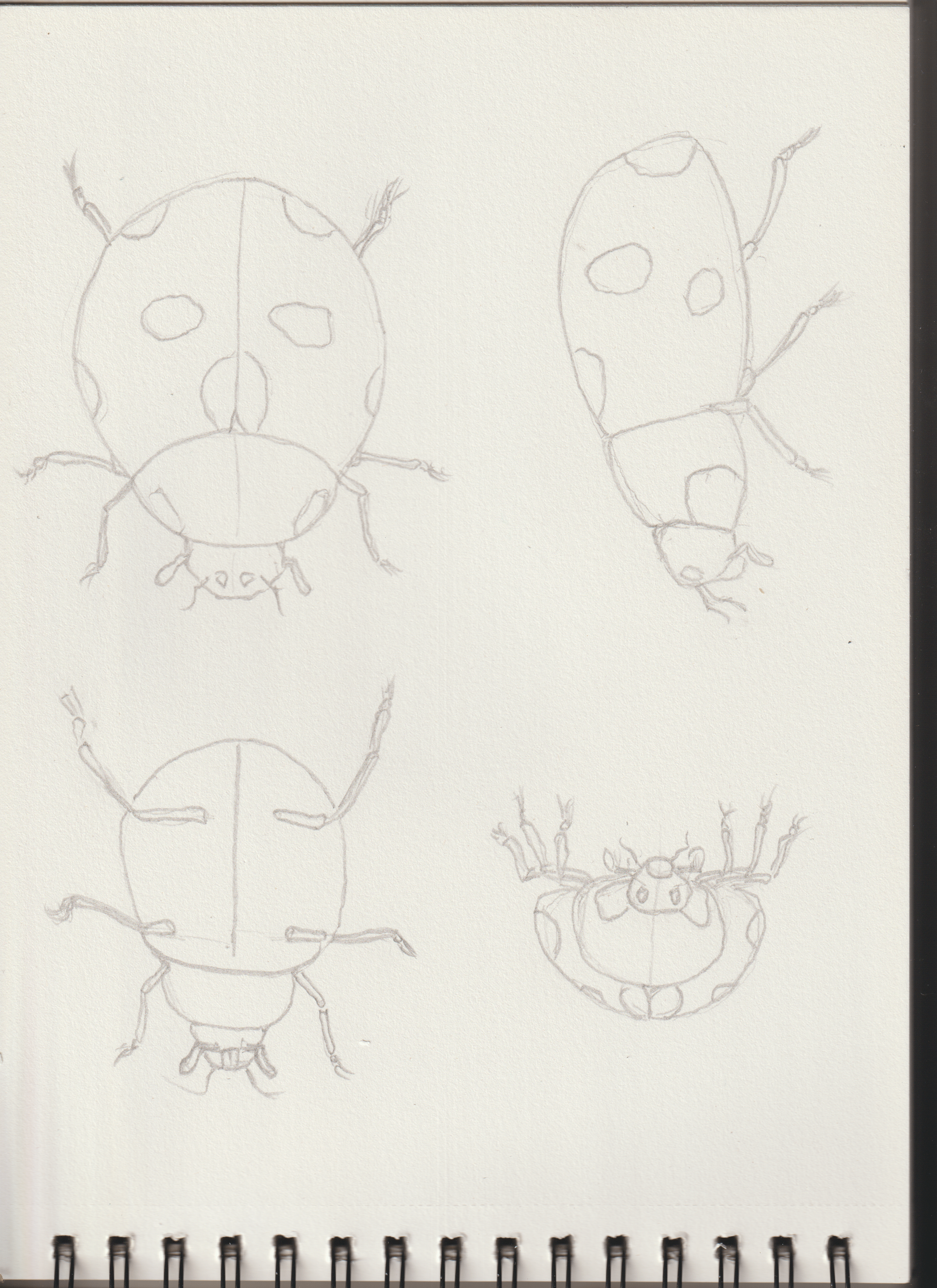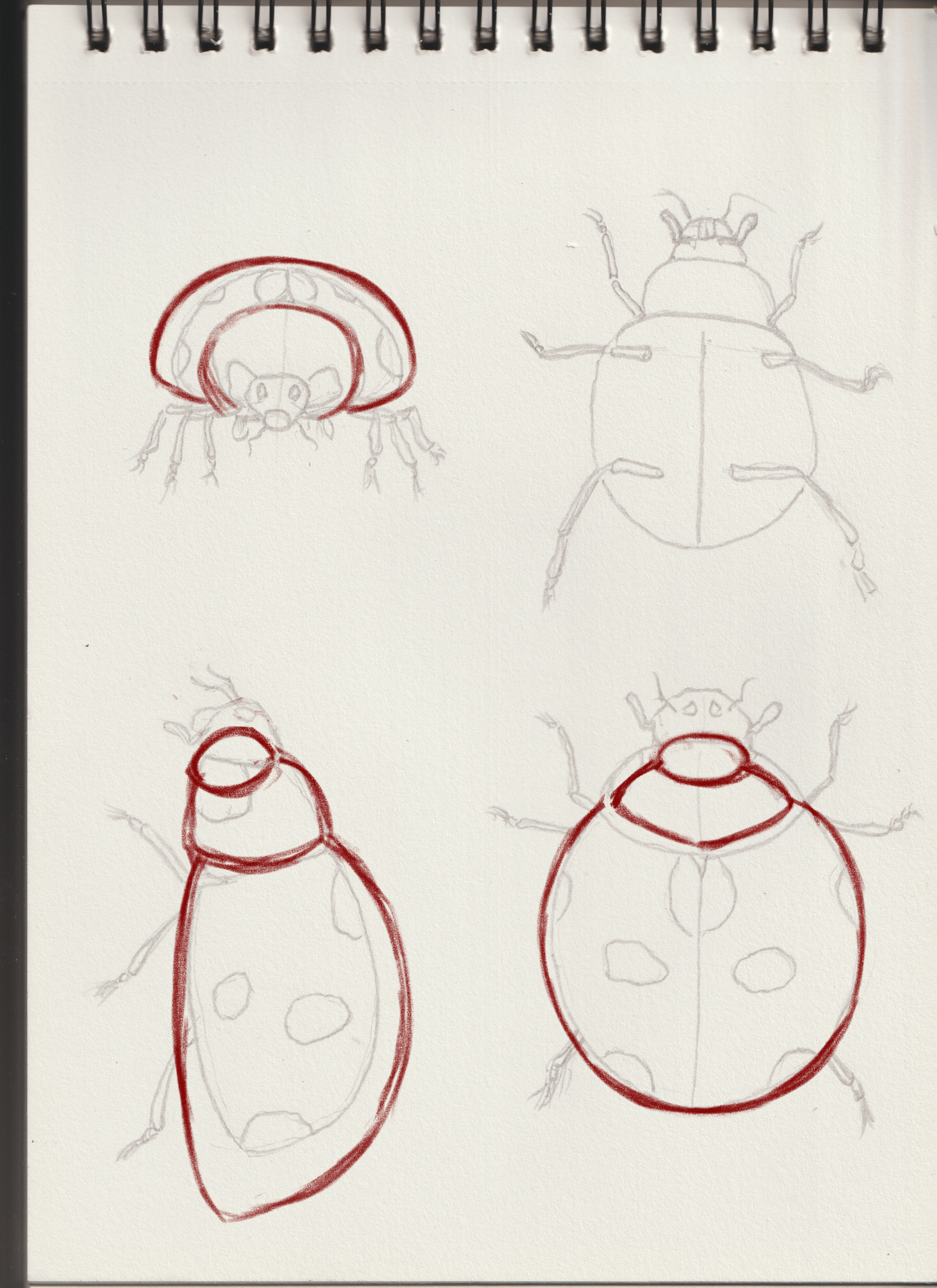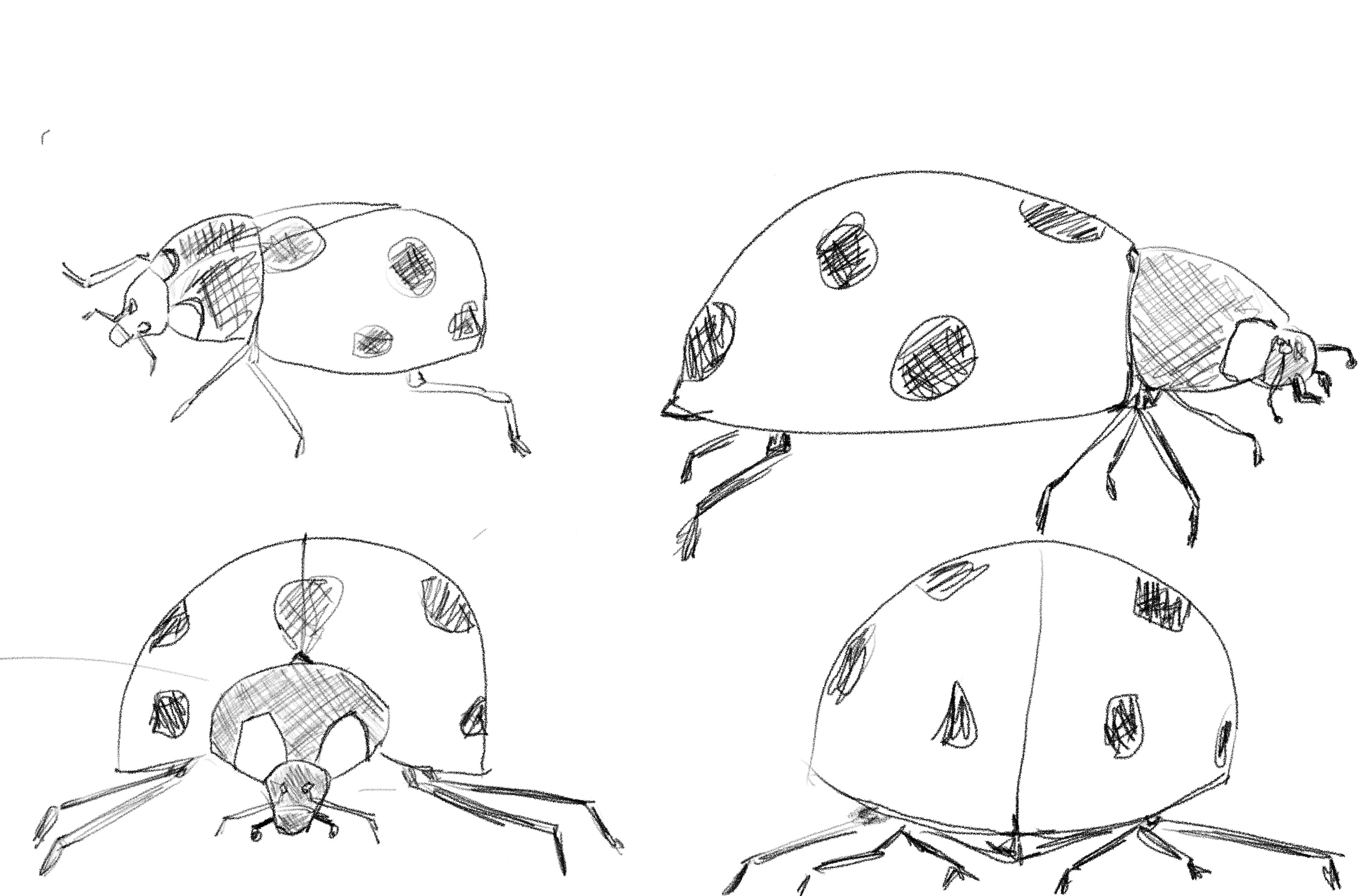 Hello Nouswel, c'est bien tout ça! Attention sur ta vue de haut, la partie tête est un peu trop grande et part trop vers l'avant! Sinon, pour les autres vues, de face et de dos, tu peux voir le corps de la coccinelle comme un simple demi-cercle bien bombé sur le dessus! ;)