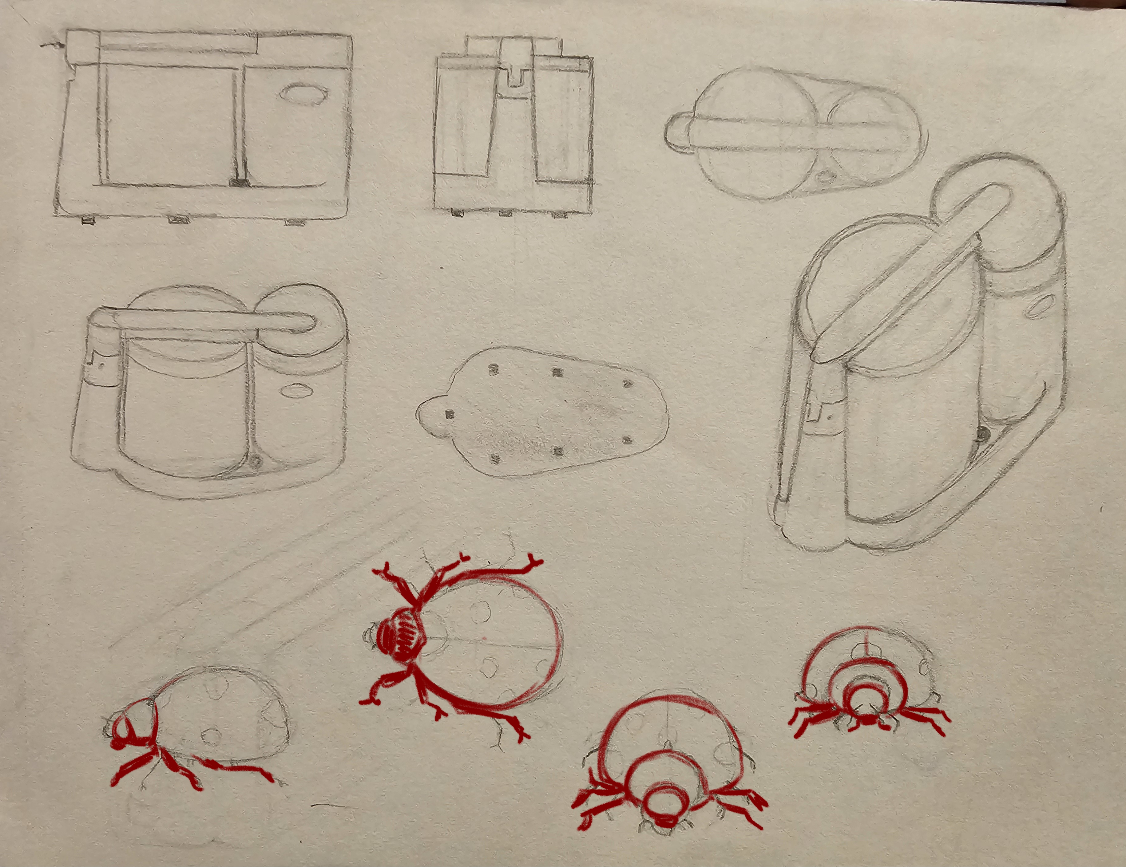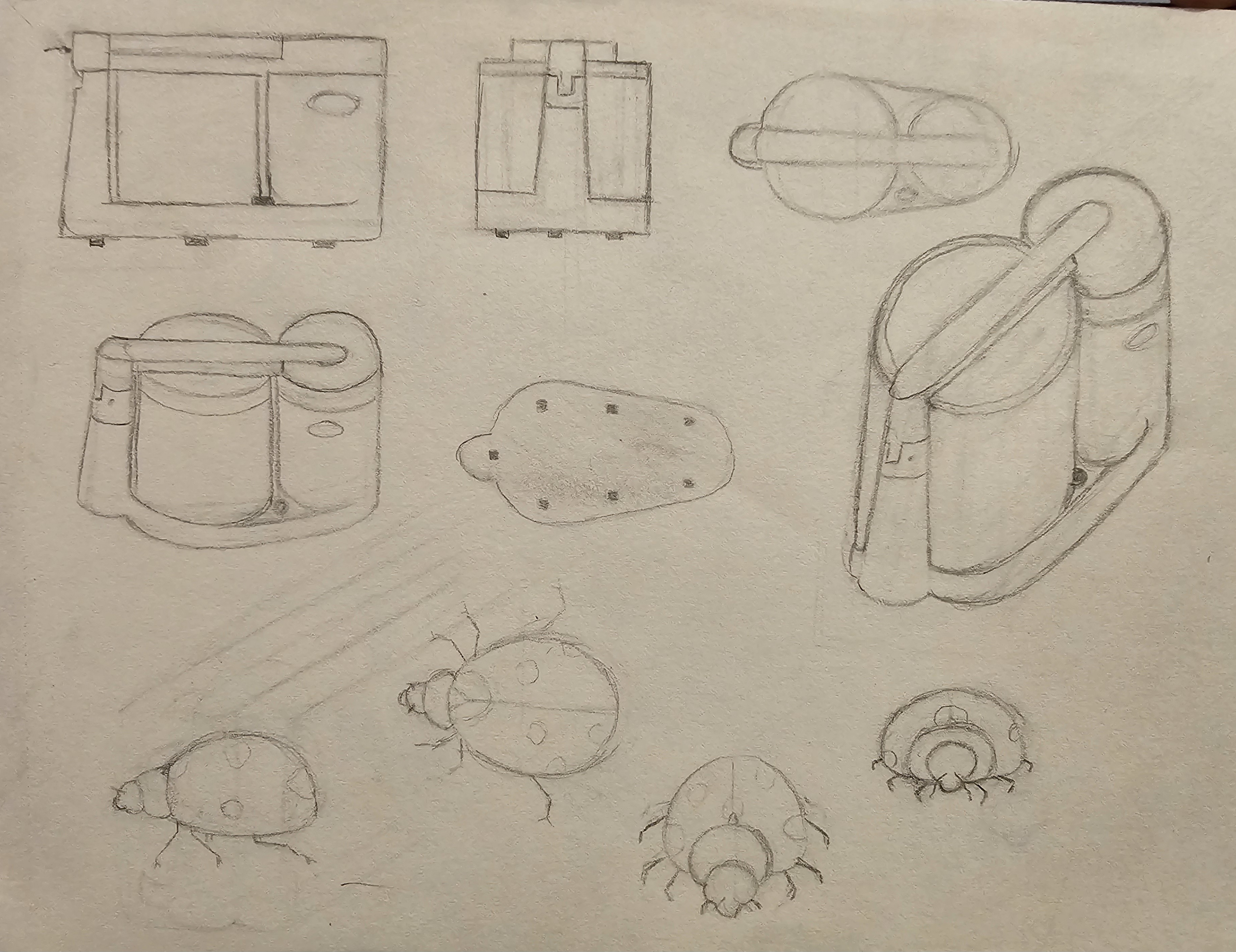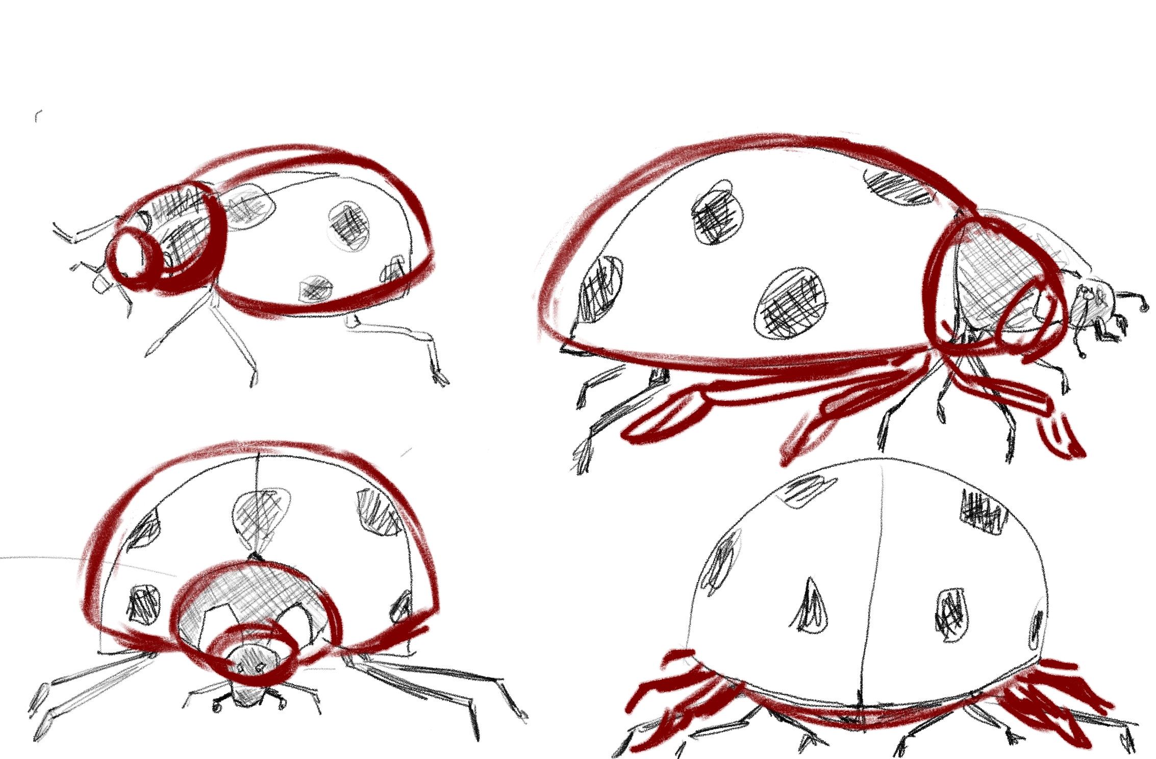 Hello Nouswel, c'est bien tout ça! Attention sur ta vue de haut, la partie tête est un peu trop grande et part trop vers l'avant! Sinon, pour les autres vues, de face et de dos, tu peux voir le corps de la coccinelle comme un simple demi-cercle bien bombé sur le dessus! ;)