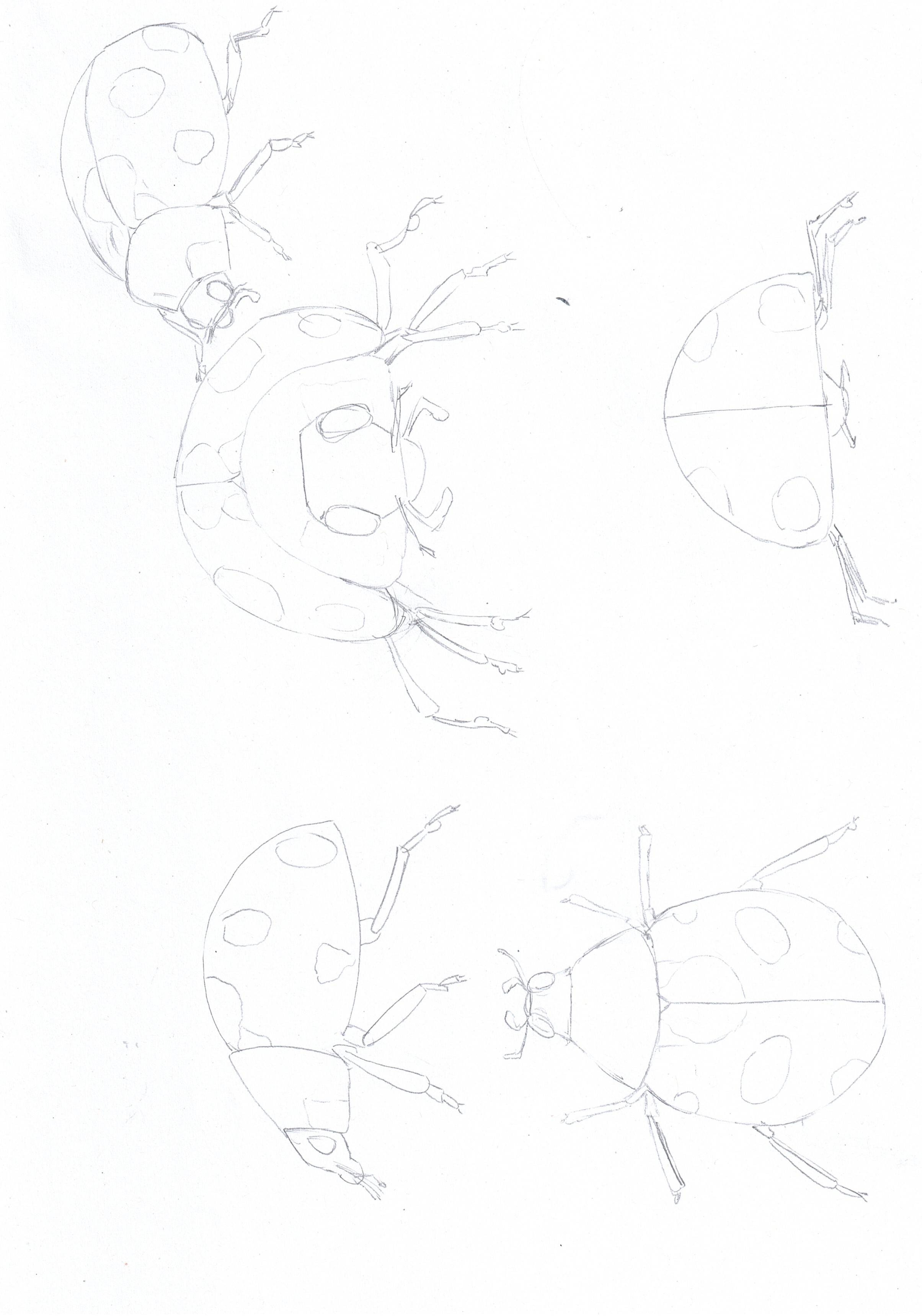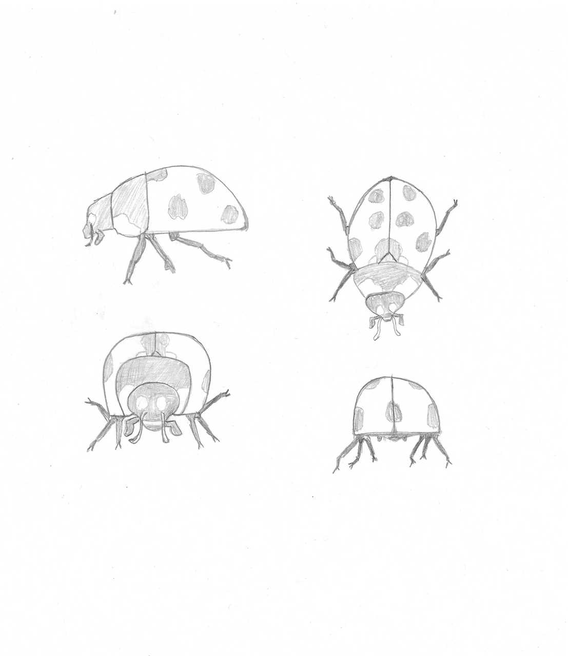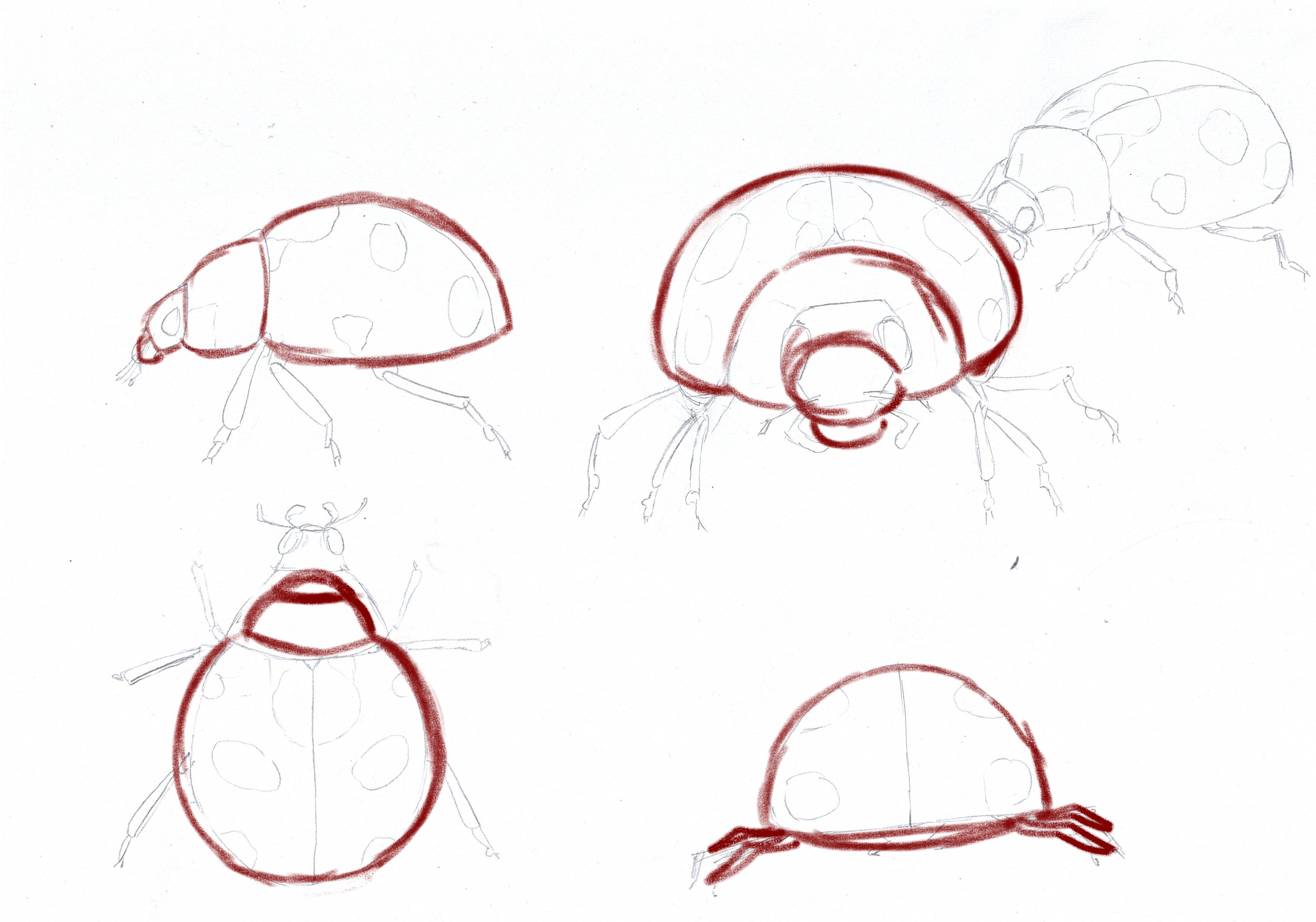 Es ist wahr, dass es zu Beginn der Visualisierung eines Subjekts aus verschiedenen Blickwinkeln aus einem einzelnen Bild nicht einfach ist, sondern genau den Zweck der Übung. Ihr Marienkäfer ist gut, aber seien Sie vorsichtig mit Proportionen: Der Körper ist sehr groß und der Kopf viel kleiner und "aufgenommen" gegen den Körper. Sie geht nicht so viel nach vorne wie in Ihrer Profilansicht.