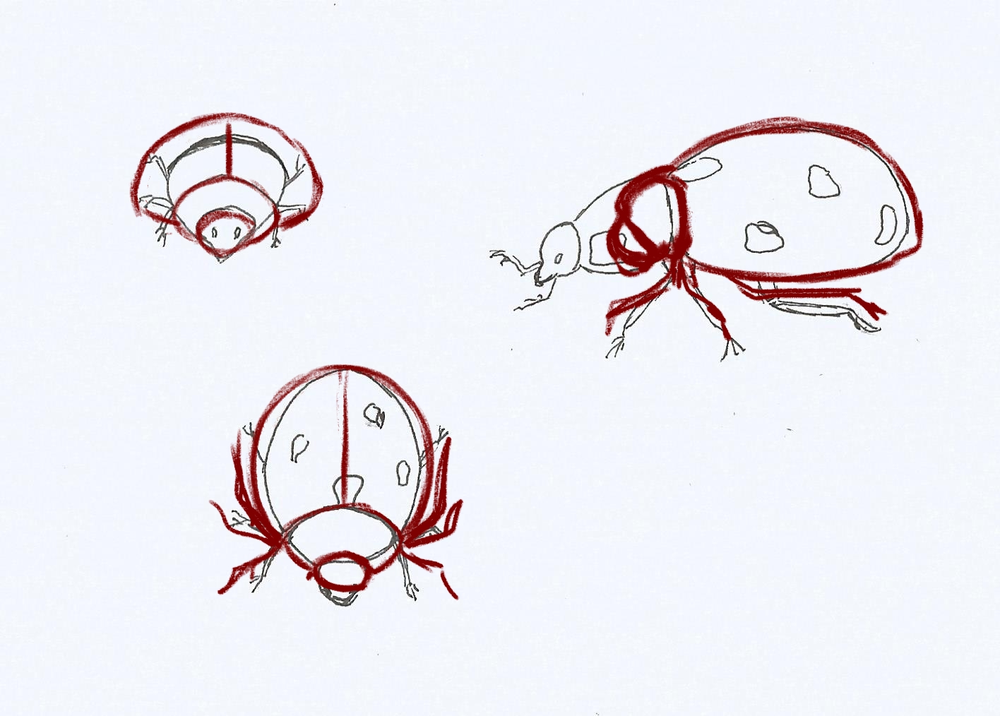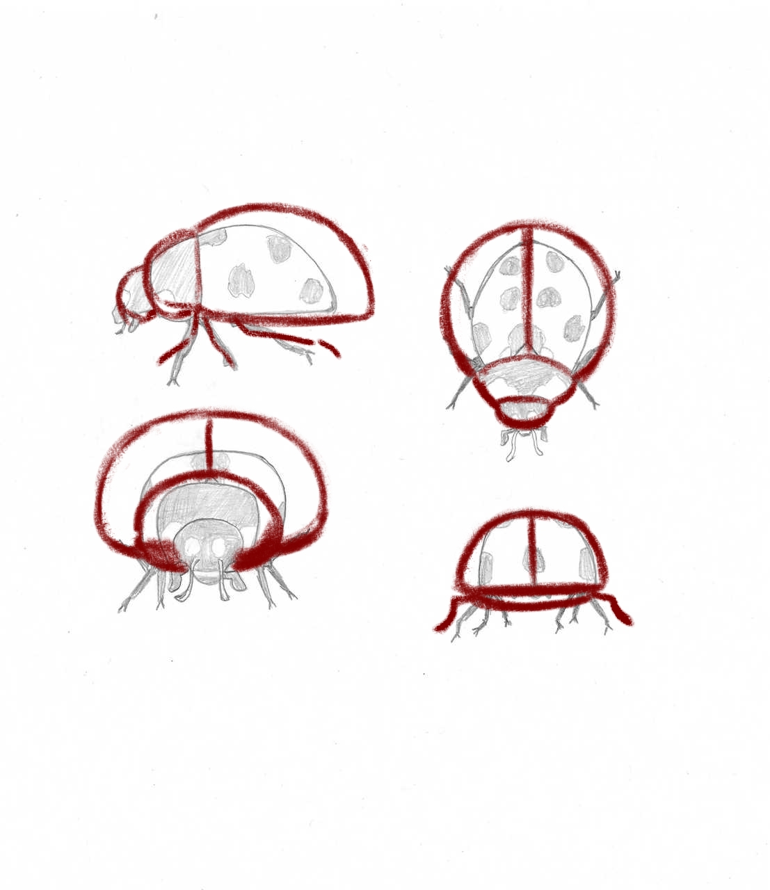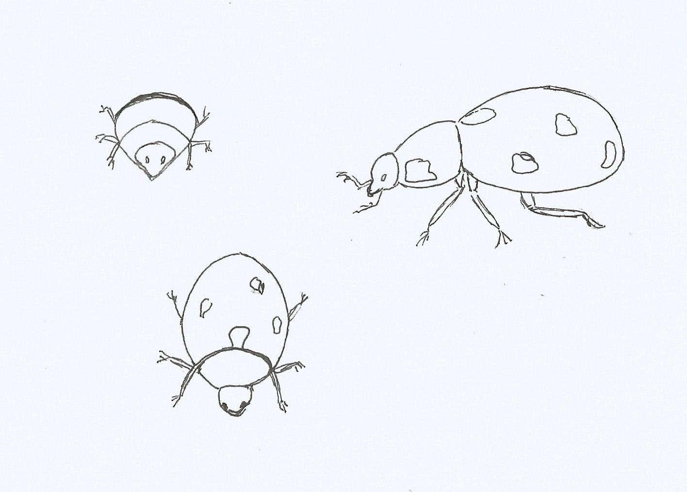 Es ist wahr, dass es zu Beginn der Visualisierung eines Subjekts aus verschiedenen Blickwinkeln aus einem einzelnen Bild nicht einfach ist, sondern genau den Zweck der Übung. Ihr Marienkäfer ist gut, aber seien Sie vorsichtig mit Proportionen: Der Körper ist sehr groß und der Kopf viel kleiner und "aufgenommen" gegen den Körper. Sie geht nicht so viel nach vorne wie in Ihrer Profilansicht.