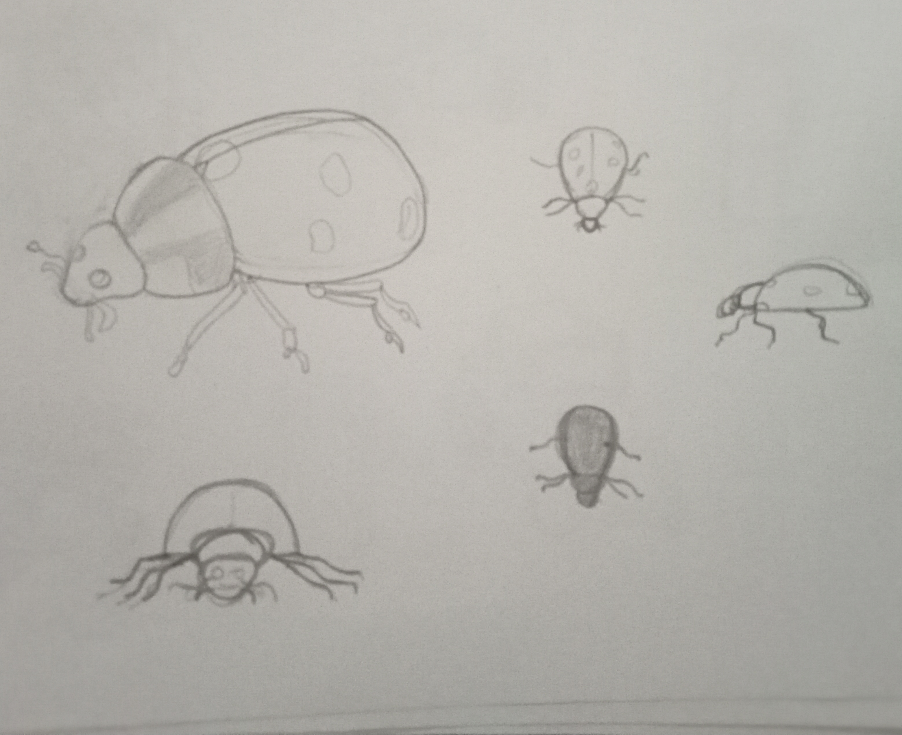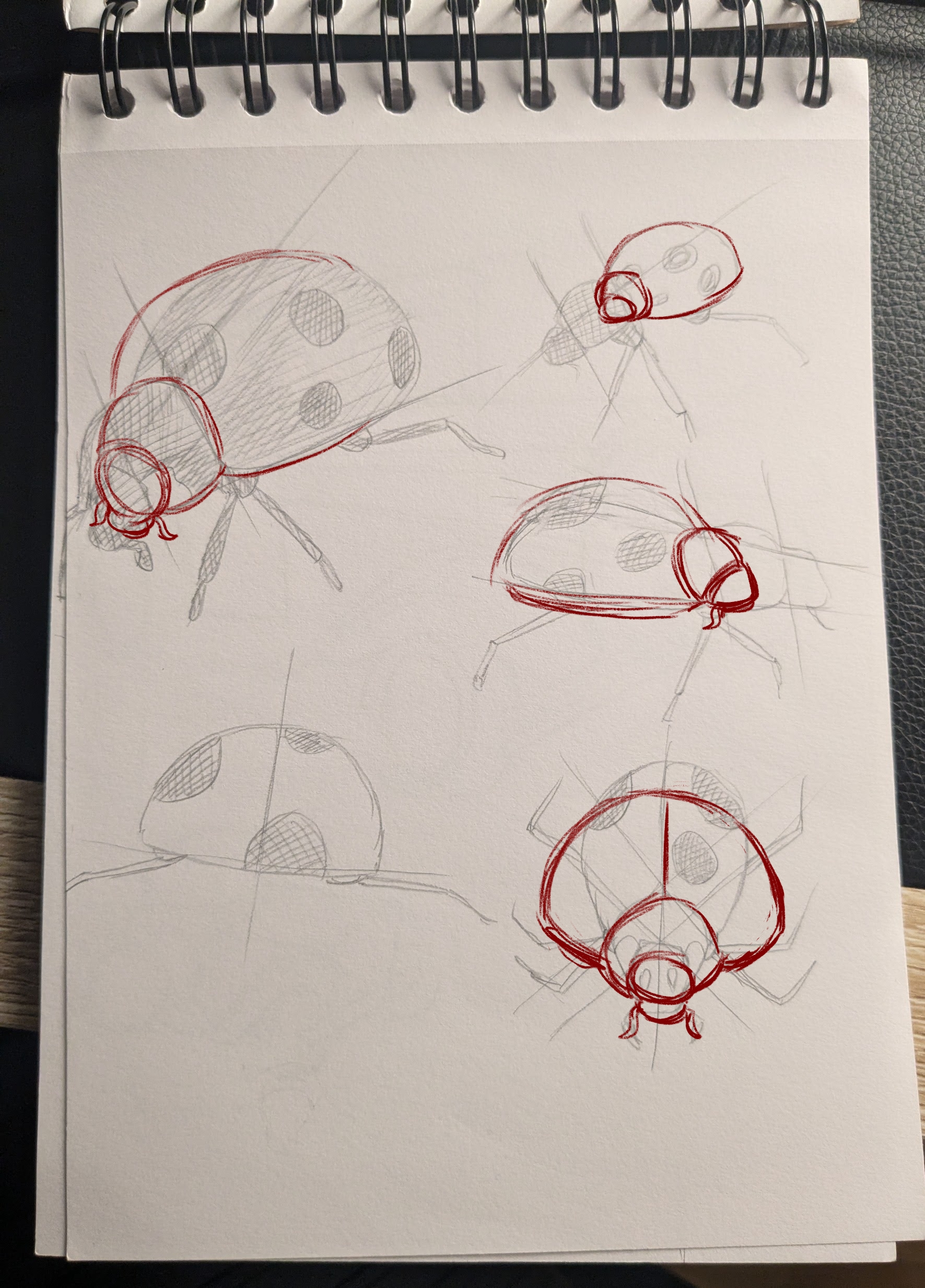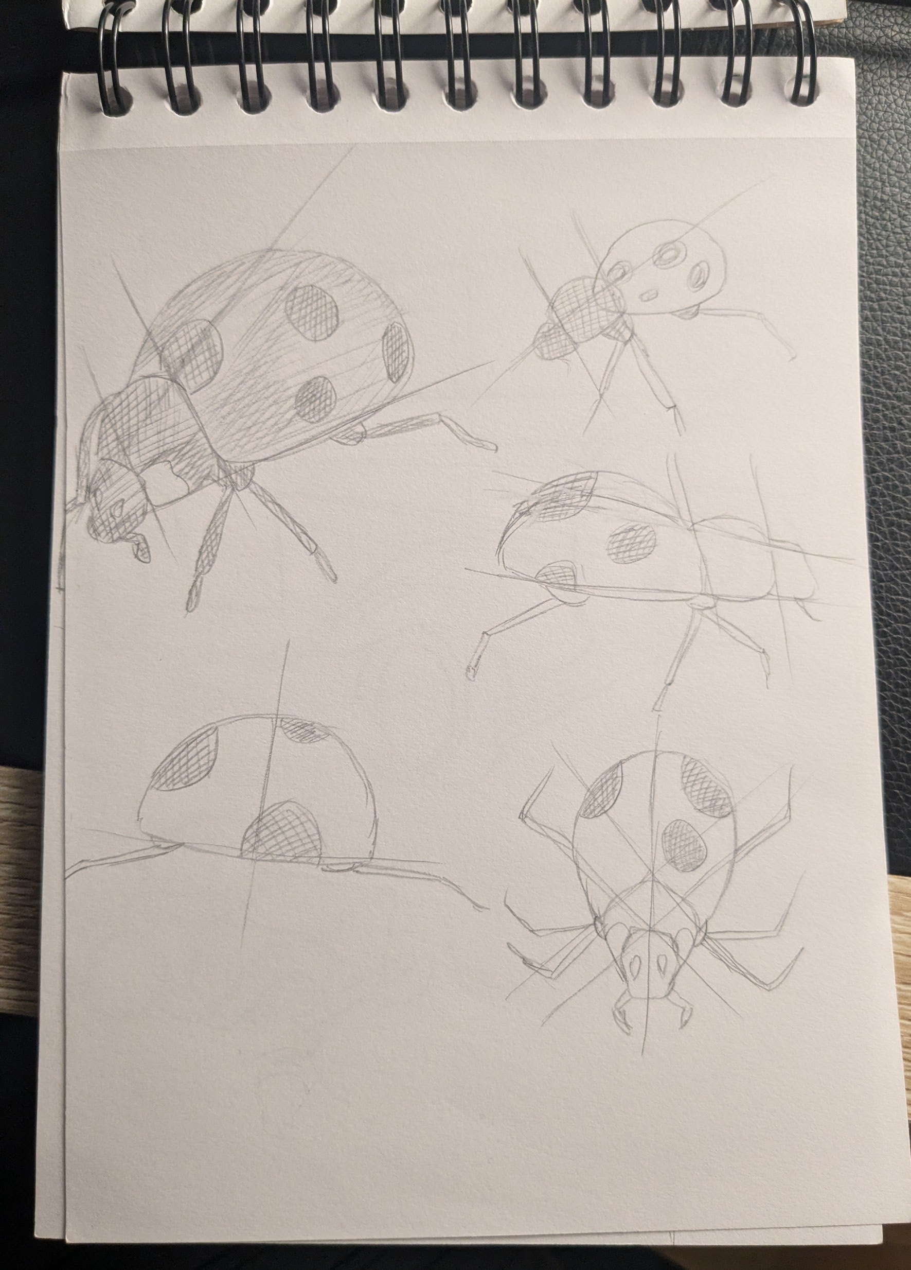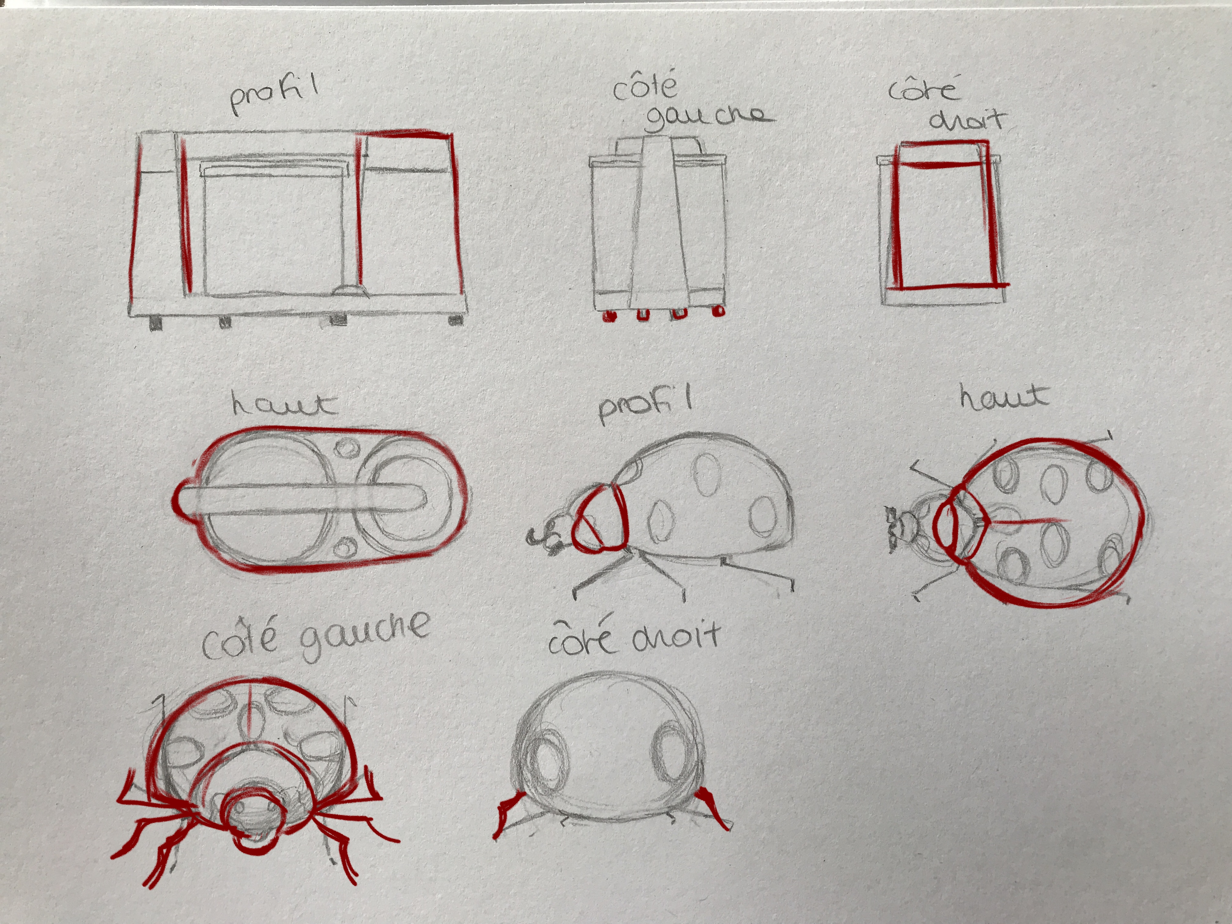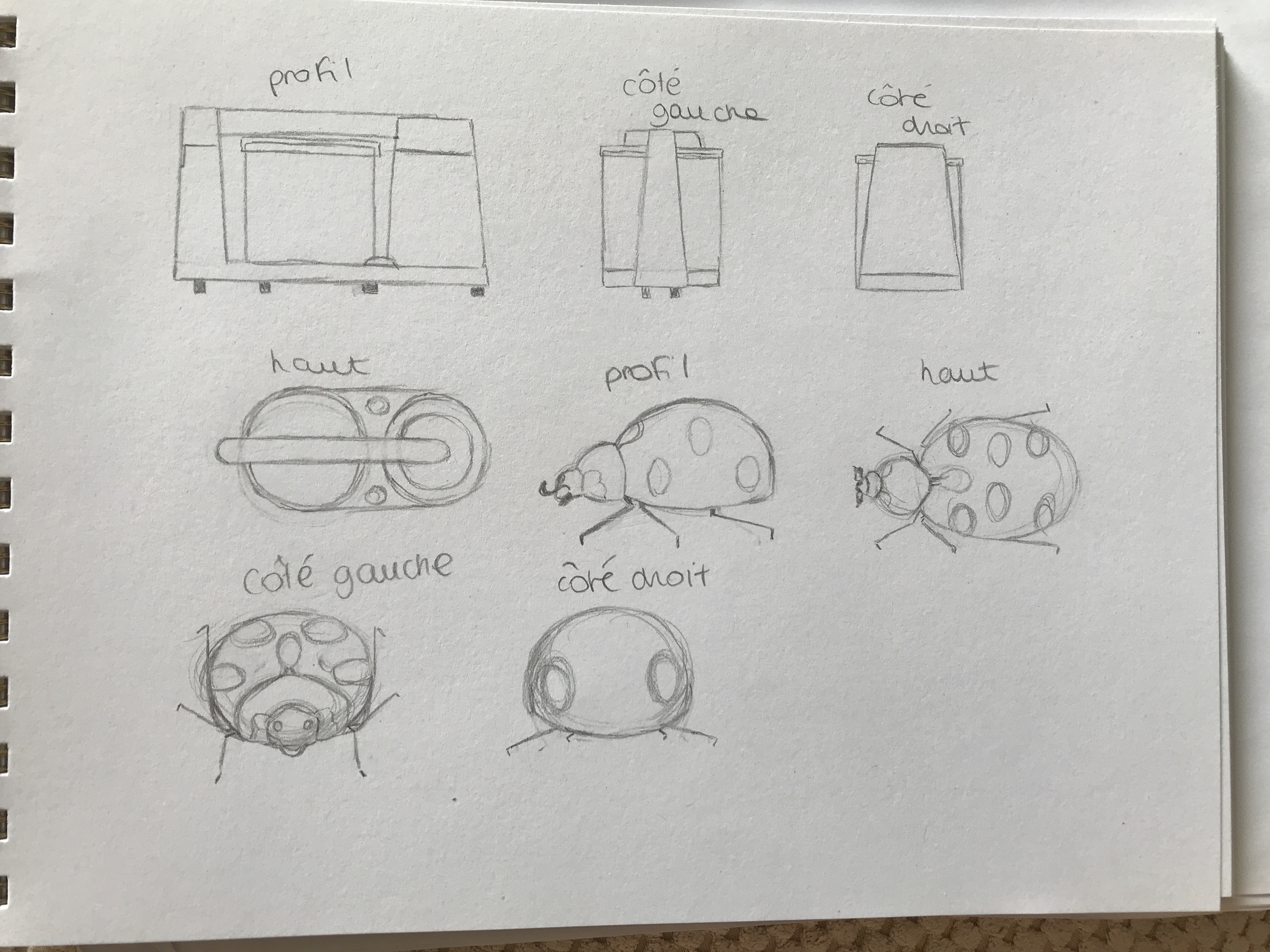 Hello Chatcitron, c'est très bien! Ça se voit que tu prends plaisir sur tes dessins! Fais attention malgré tout aux proportions des différentes parties de la coccinelle, tu as fais le corps trop petit, particulièrement sur la vue de face) À part ça, c'est du beau boulot! 😉
