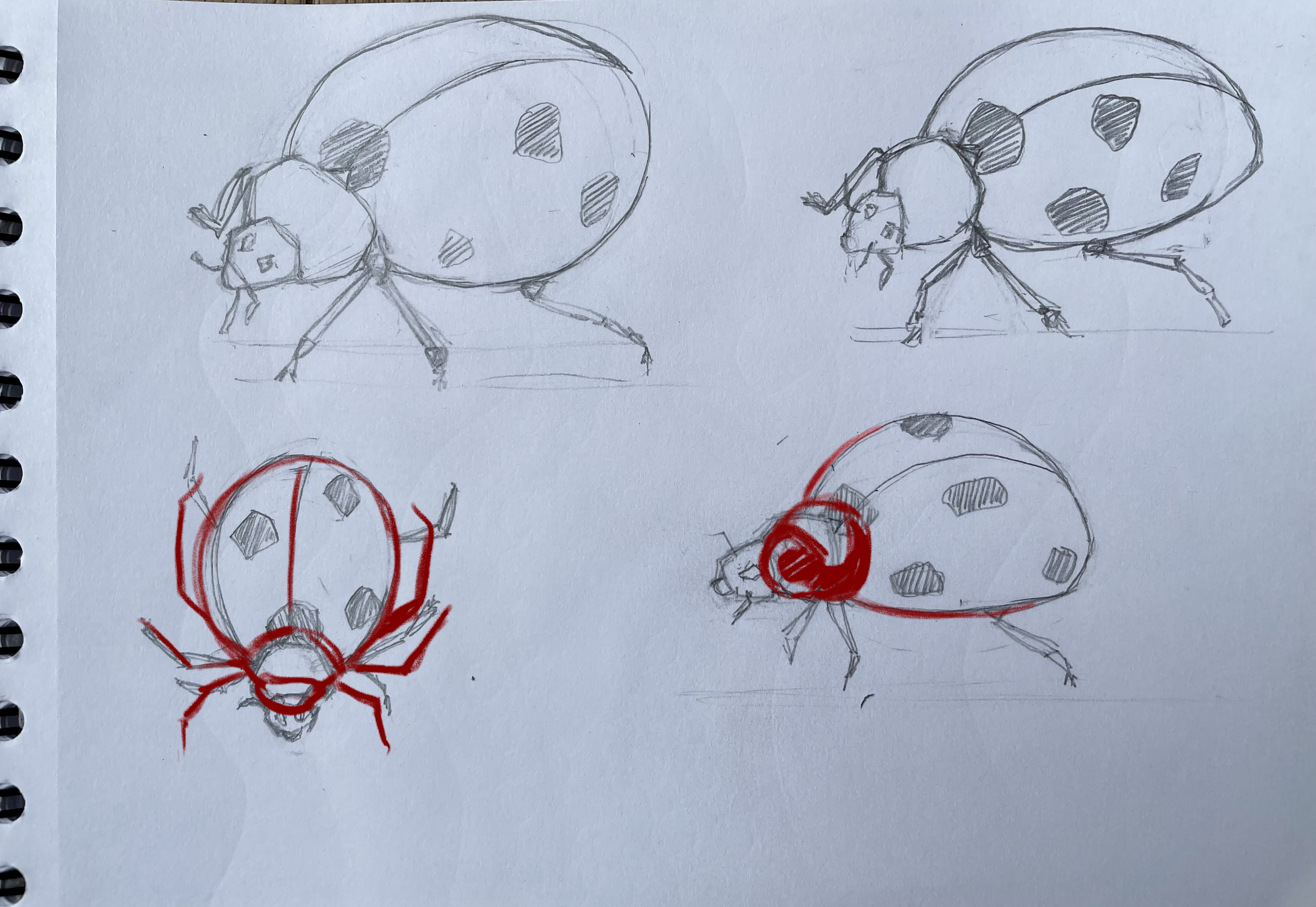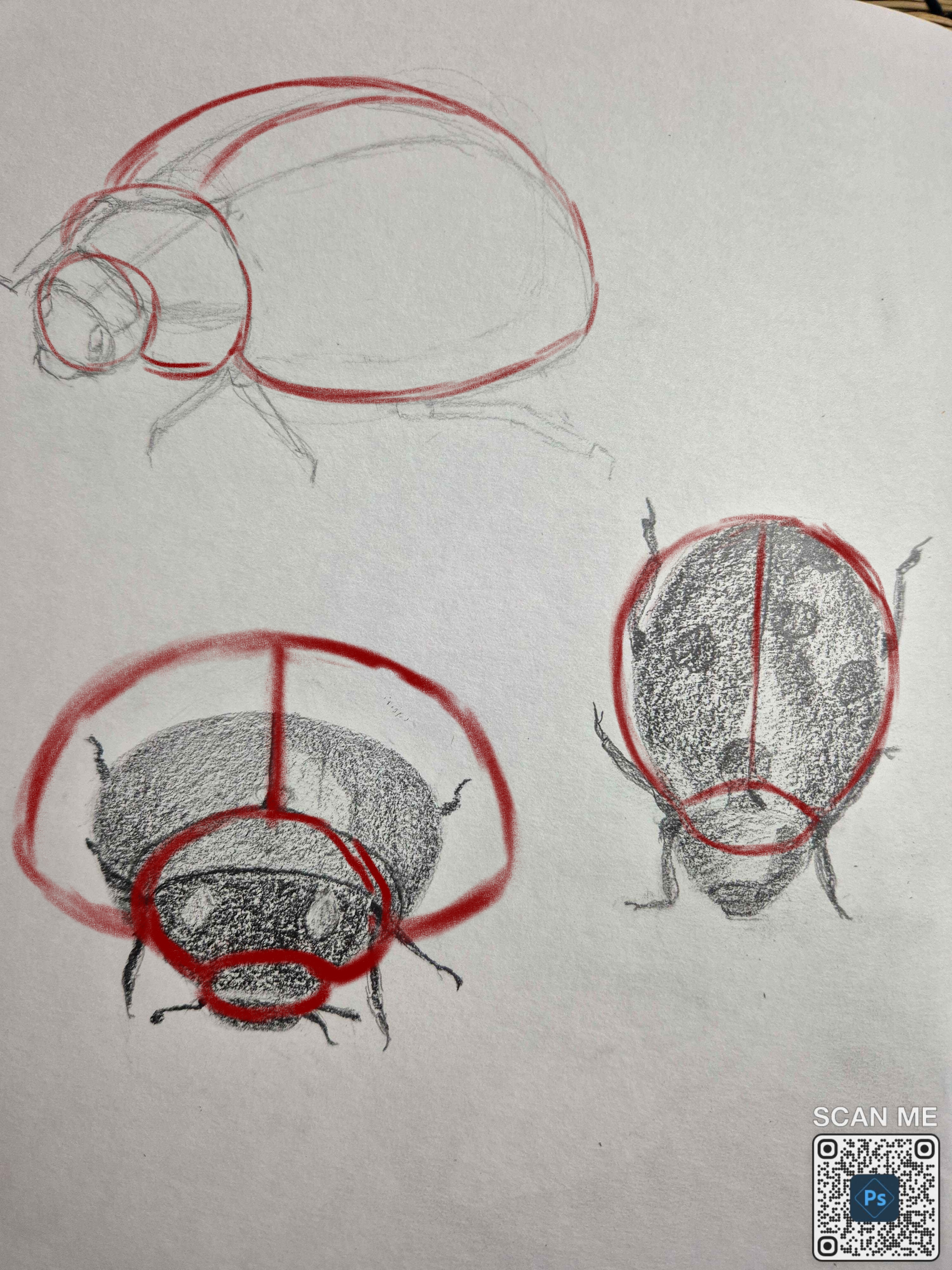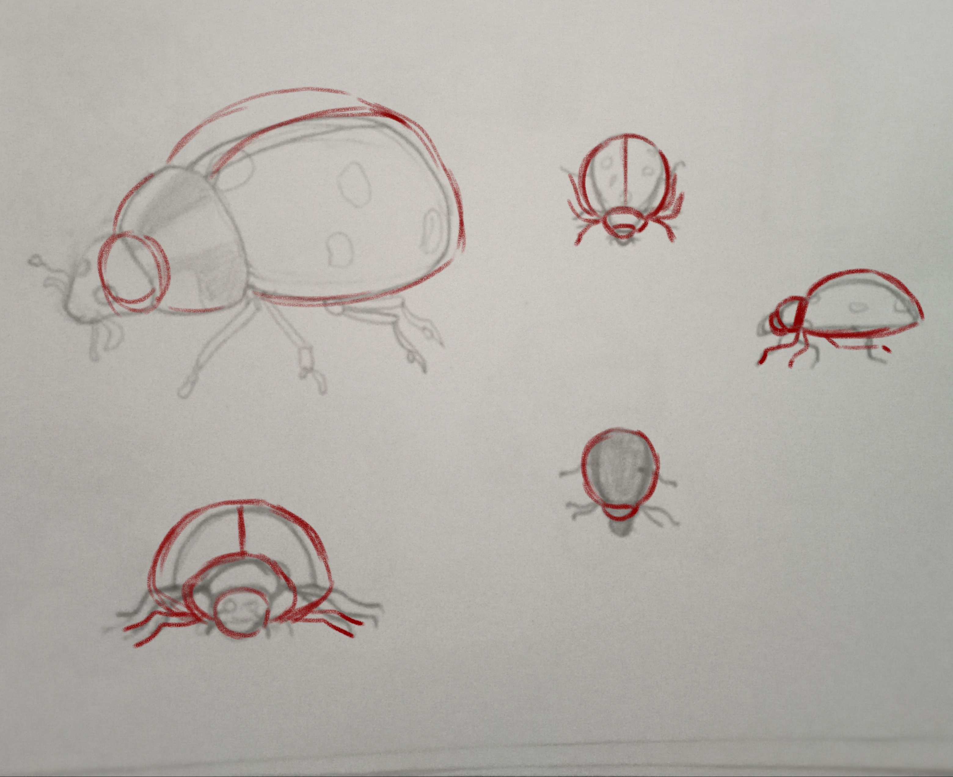 BOnsoir Asturias, c'est très bien, mais attention à la taille de la tête qui doit être plus petite et plus tassée contre le corps. Pour la vue de devant, essaie de bien bomber le corps de la coccinelle sur le haut, et de bien l'élargie sur les côtés. :)