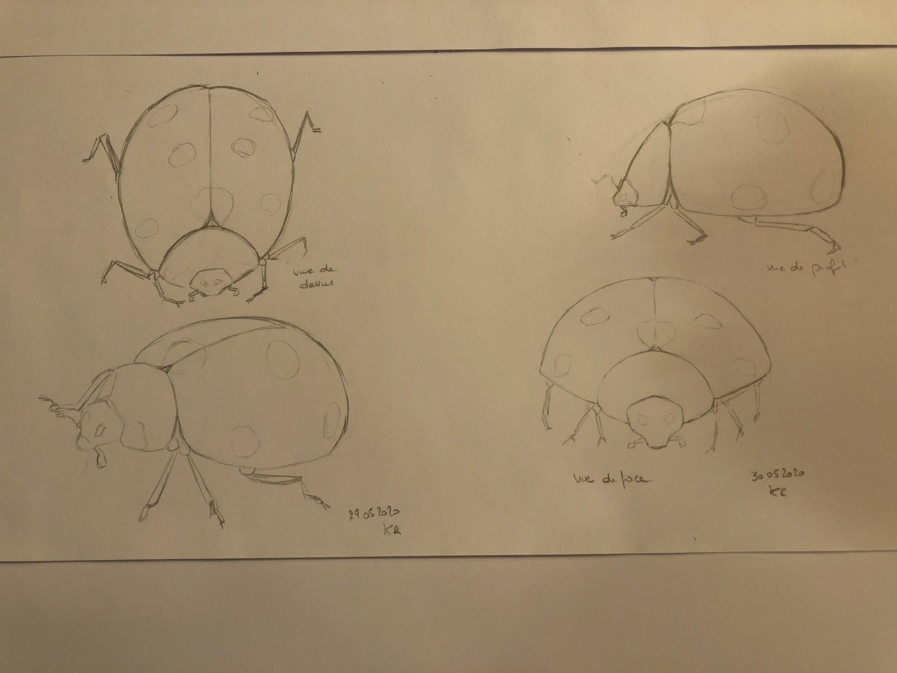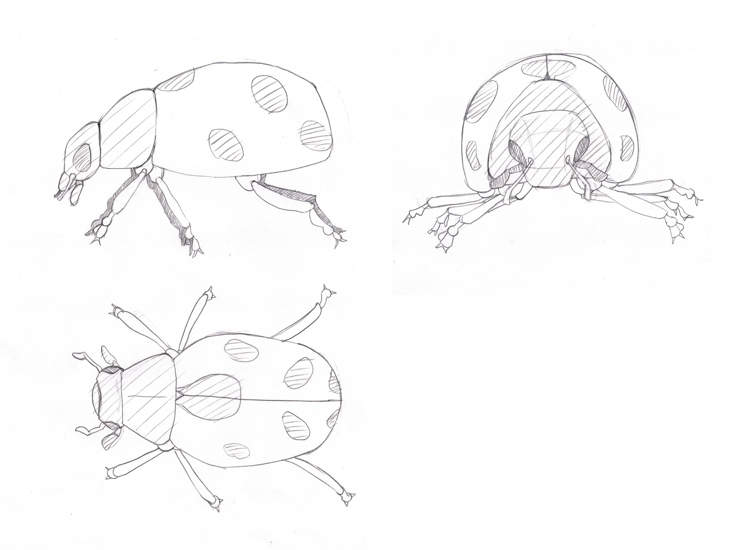 La vue de 3/4 et de face sont pour moi bonnes, tu n'as pas eu de souci, bravo! Là où ça coince un peu c'est pour la vue de profil et de dessus, notamment avec la taille de la tête qui sous ses angles, paraît très petite! Observe bien la tête de la coccinelle sur la vue de 3/4 et tente de conserver cette taille pour celle de profil et fais pareil avec la vue de face et de dessus! Pour la vue de dessus comme de profil tu as eu tendance à l'"enfoncer" dans le cou, et la rendre ronde alors qu'elle a une forme un légèrement en pointe!