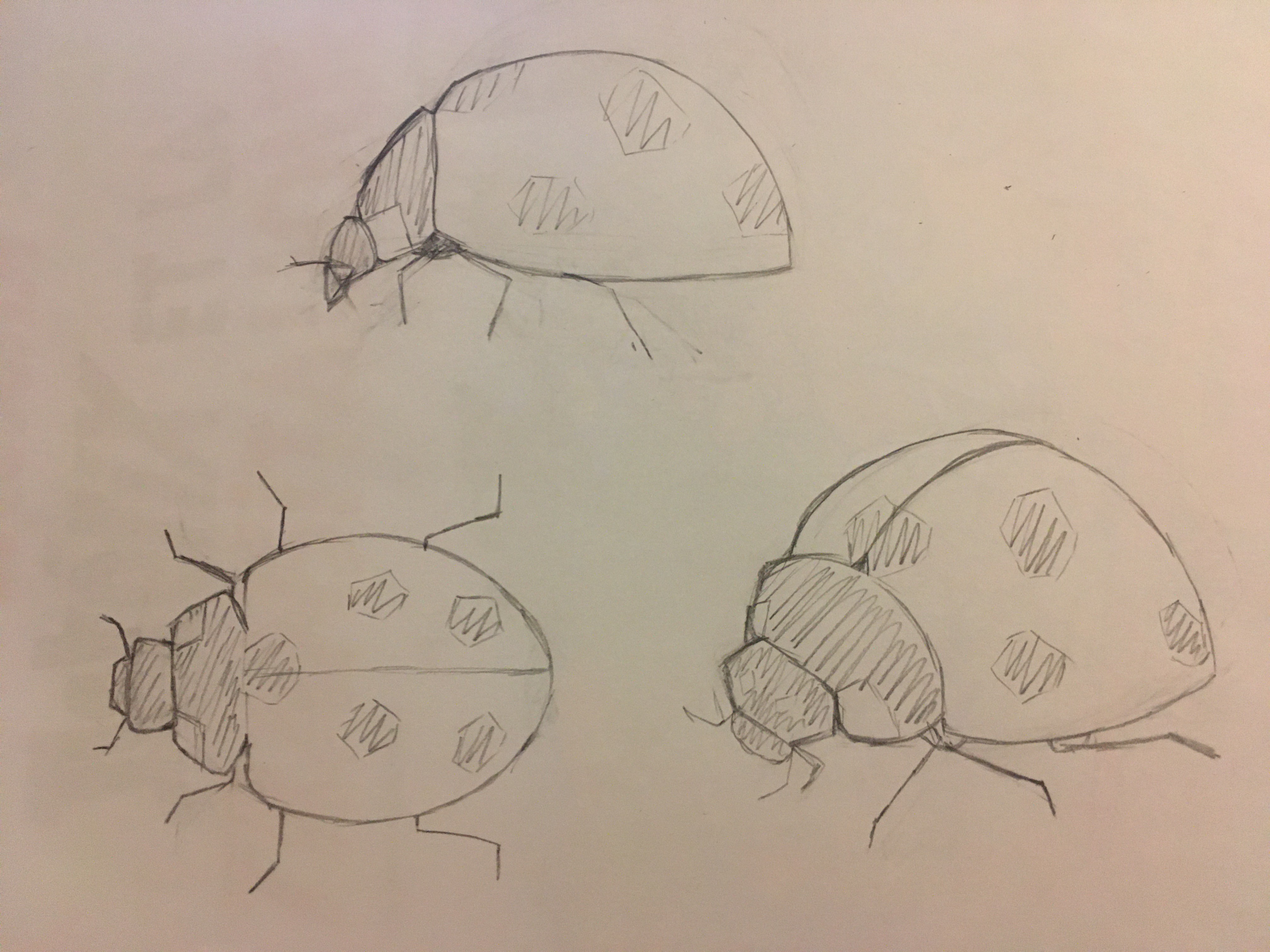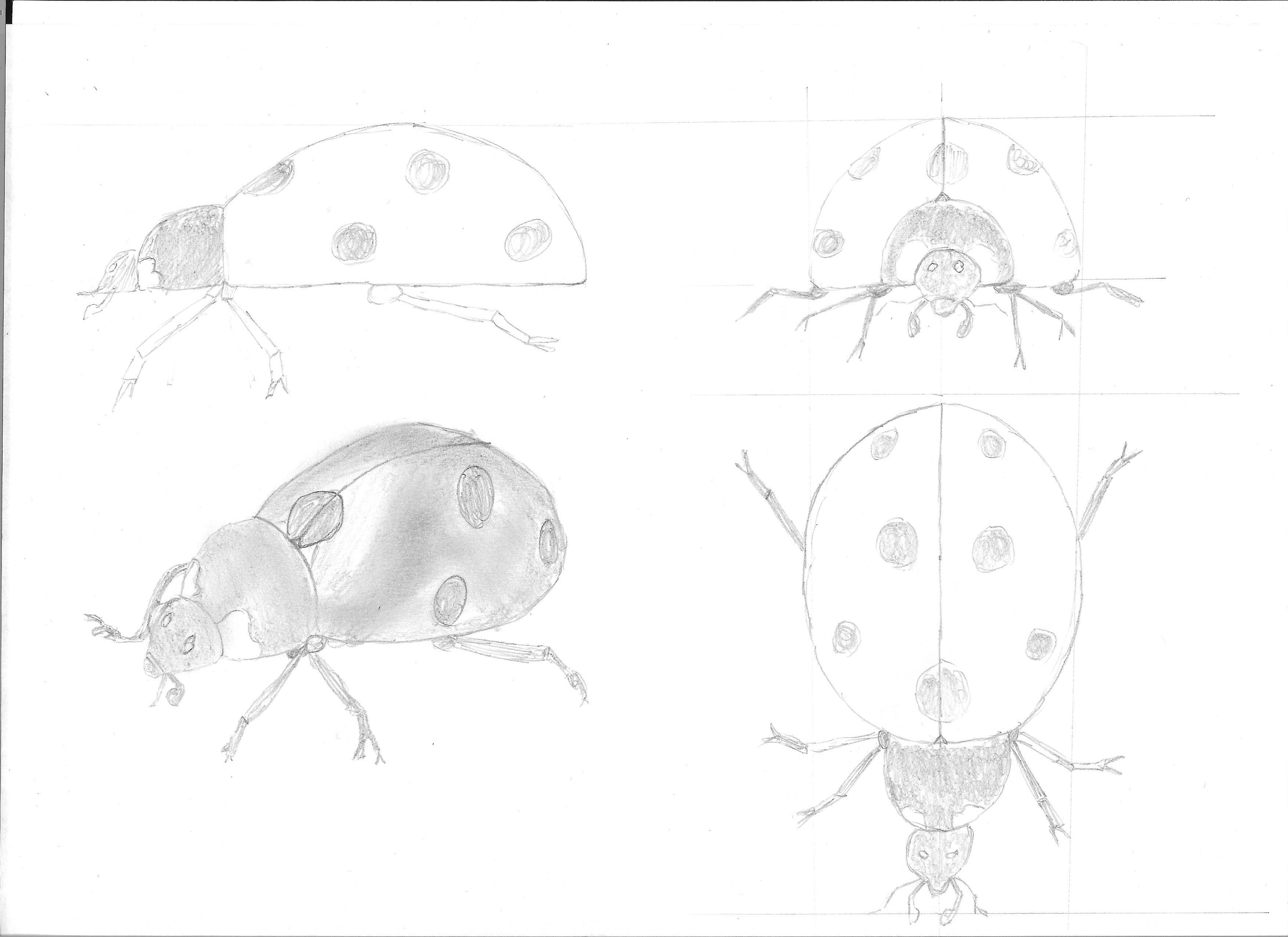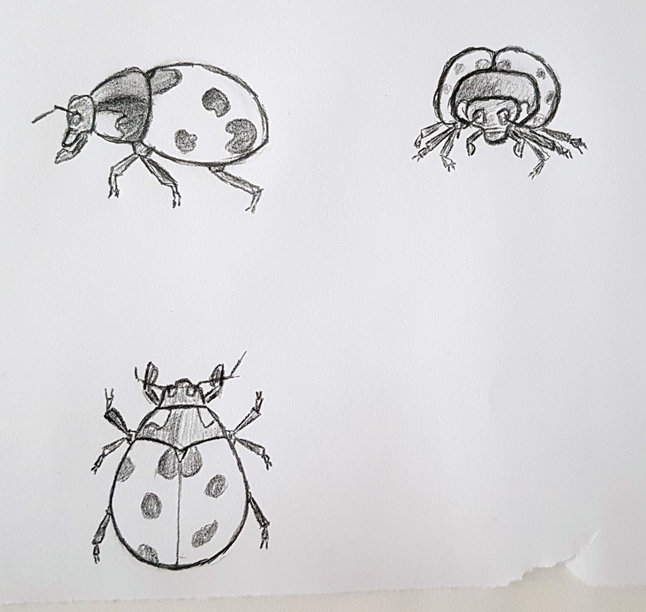 Ihre Marienkäfer sind sehr gut gemacht! Für die Profilansicht wäre es nur notwendig, die hinteren Beine zu verlängern, auf Ihrer Zeichnung sind sie etwas kurz!