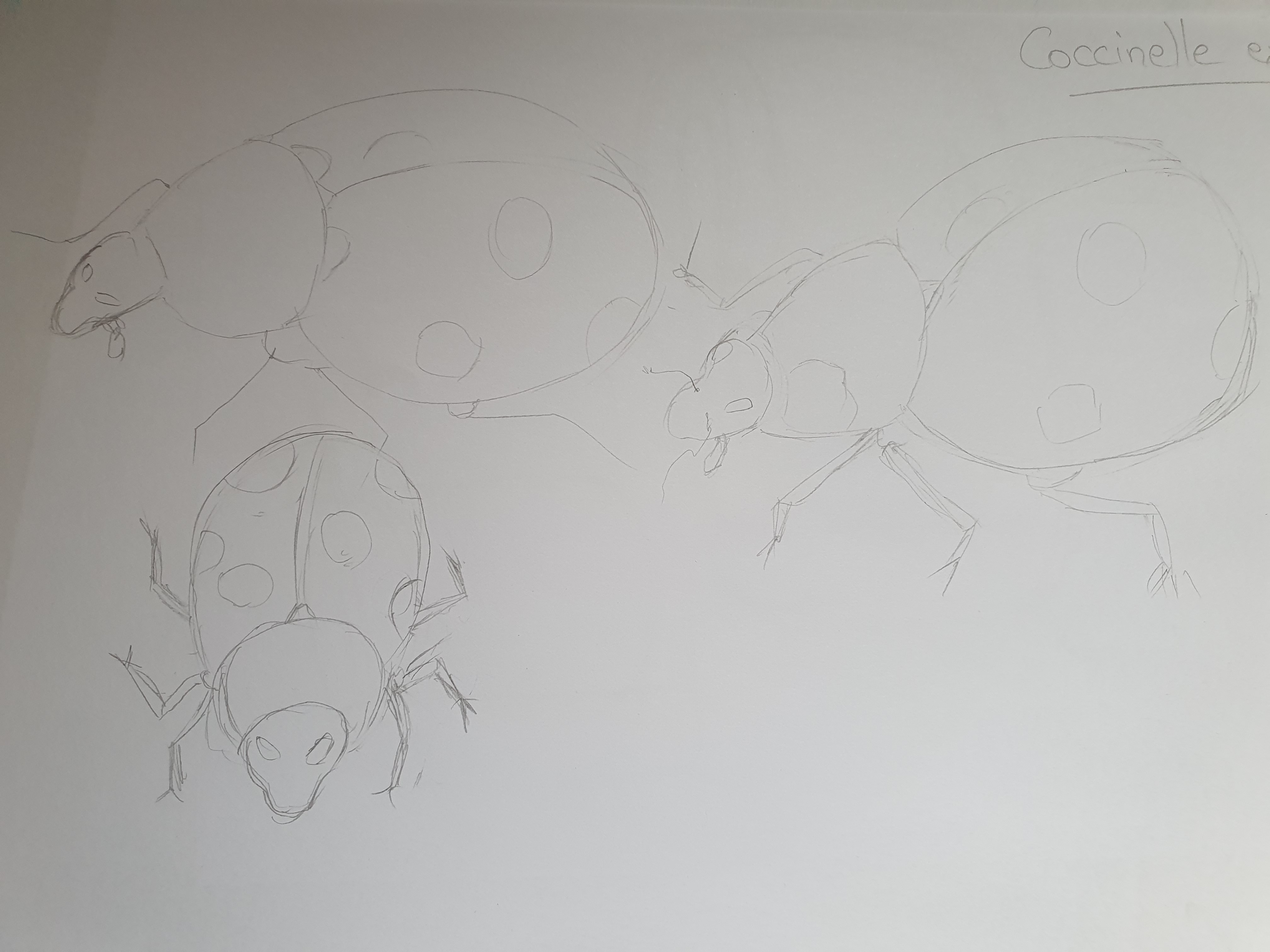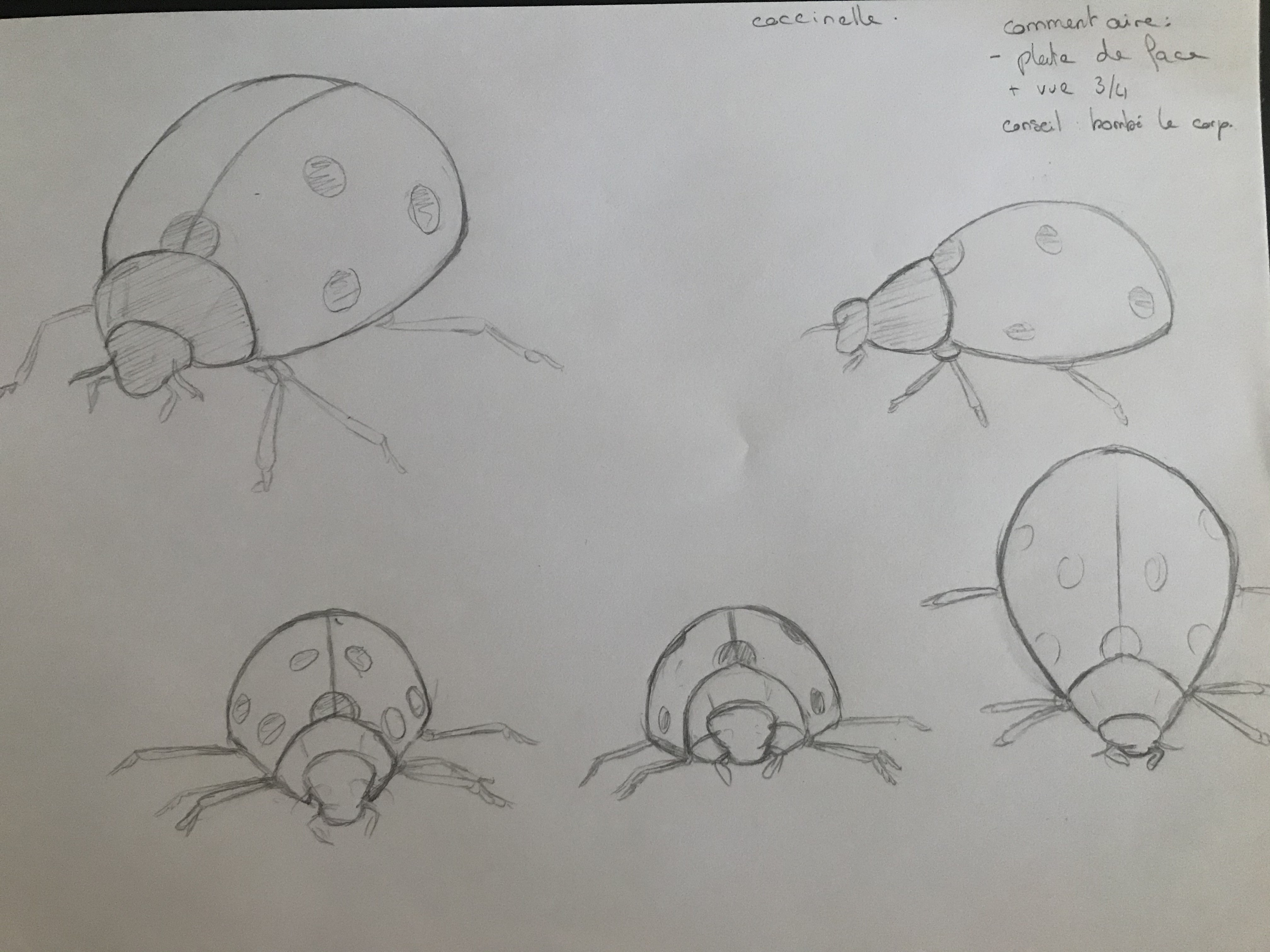 Beau travail, les vues de profil et de dessus me paraissent très bien :) Je suis un peu plus confuse par celle de face, qui semble très ronde avec certaines pattes qui n'ont pas l'air de toucher le sol, on dirait même qu'elle est un peu vue de dessus. Je te joins un croquis correctif où j'ai modifié ton dessin pour que la coccinelle soit plus de face , plus plate sur le dessous et avec les pattes au sol (les gribouillis sont pour cacher les pattes arrières que j'ai redessinées). Demande moi si il y a quelque chose que tu ne comprends pas ^^