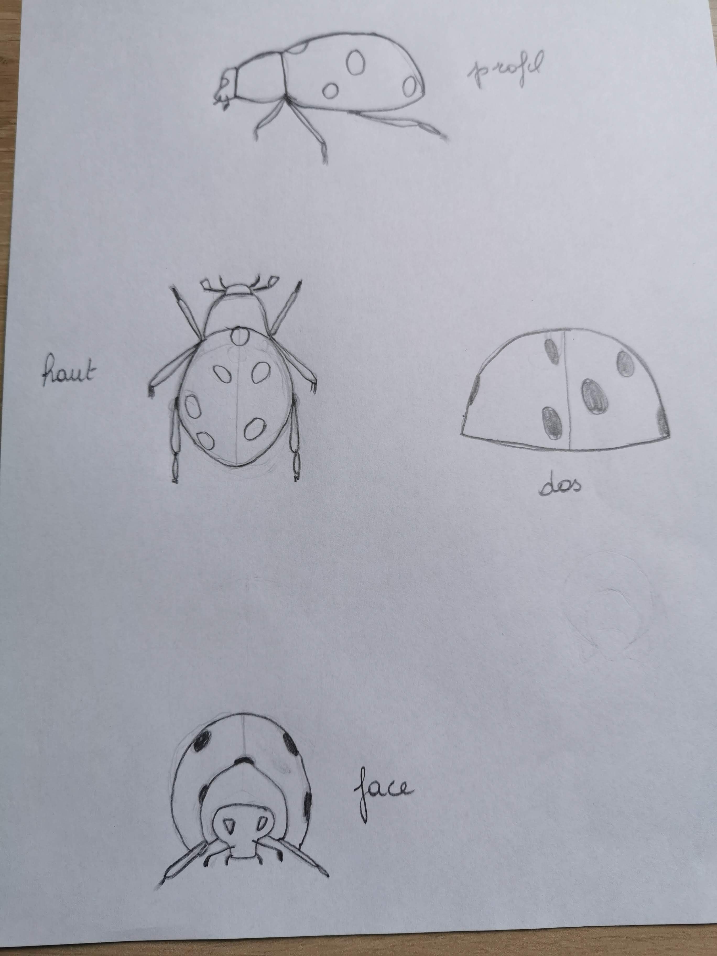 Tes coccinelles sont très bien réalisées! Pour la vue de profil il faudrait juste que tu rallonger les pattes arrières, sur ton dessin elles sont un peu courtes!