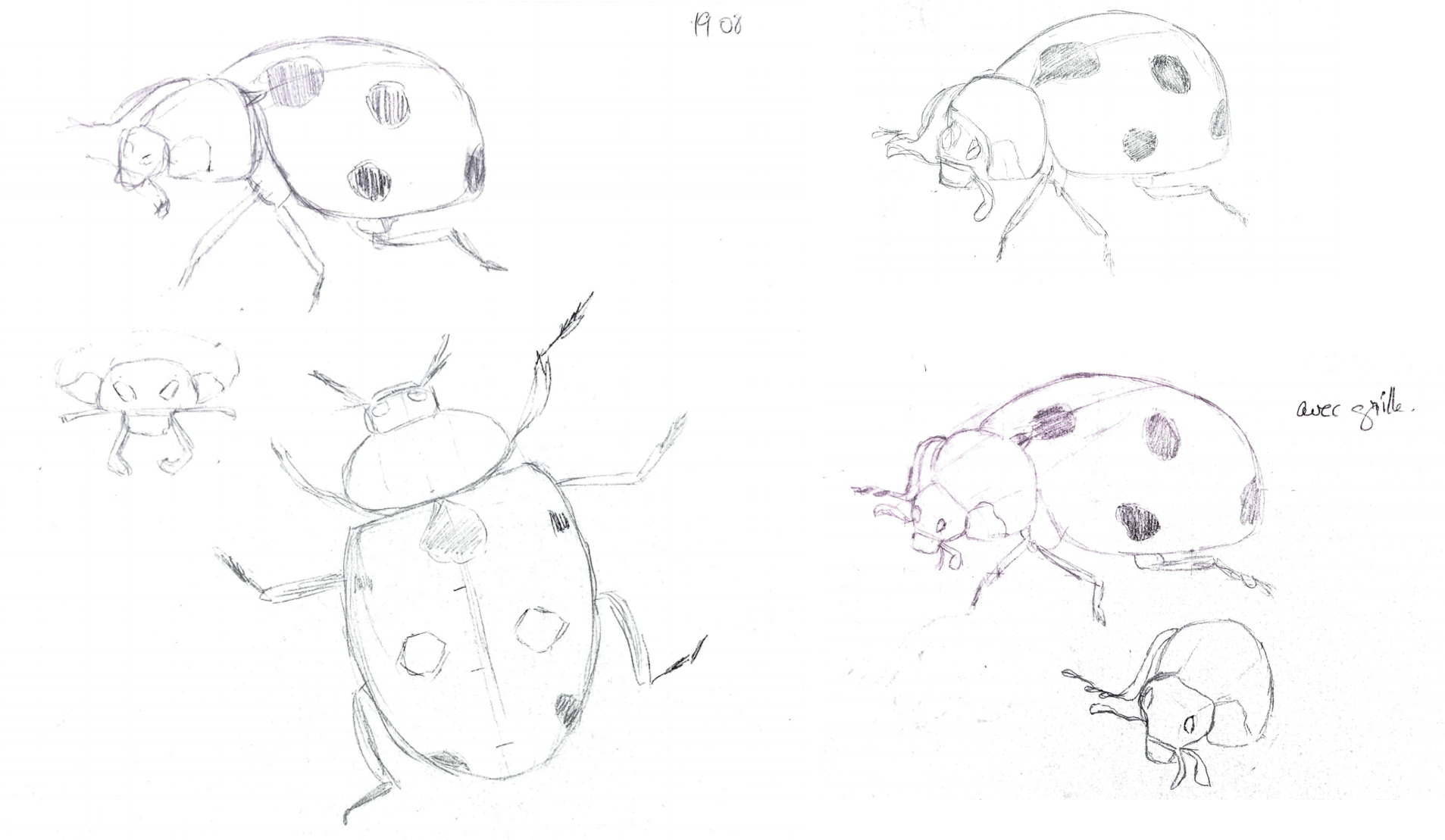 Für den Marienkäfer finde ich, dass der 3/4 -Marienkäfer mit '' Grille 'das erfolgreichste und gut gemachteste ist! Wir sehen, dass Sie die Übung verstanden haben. Möglicherweise verbessern Sie möglicherweise Ihre Funktionen, so dass sie für die Beine oder den Körper der Marienkäfer auf Ihren anderen Zeichnungen "weniger chaotisch" ist. Fahren Sie beispielsweise so weiter! 😉