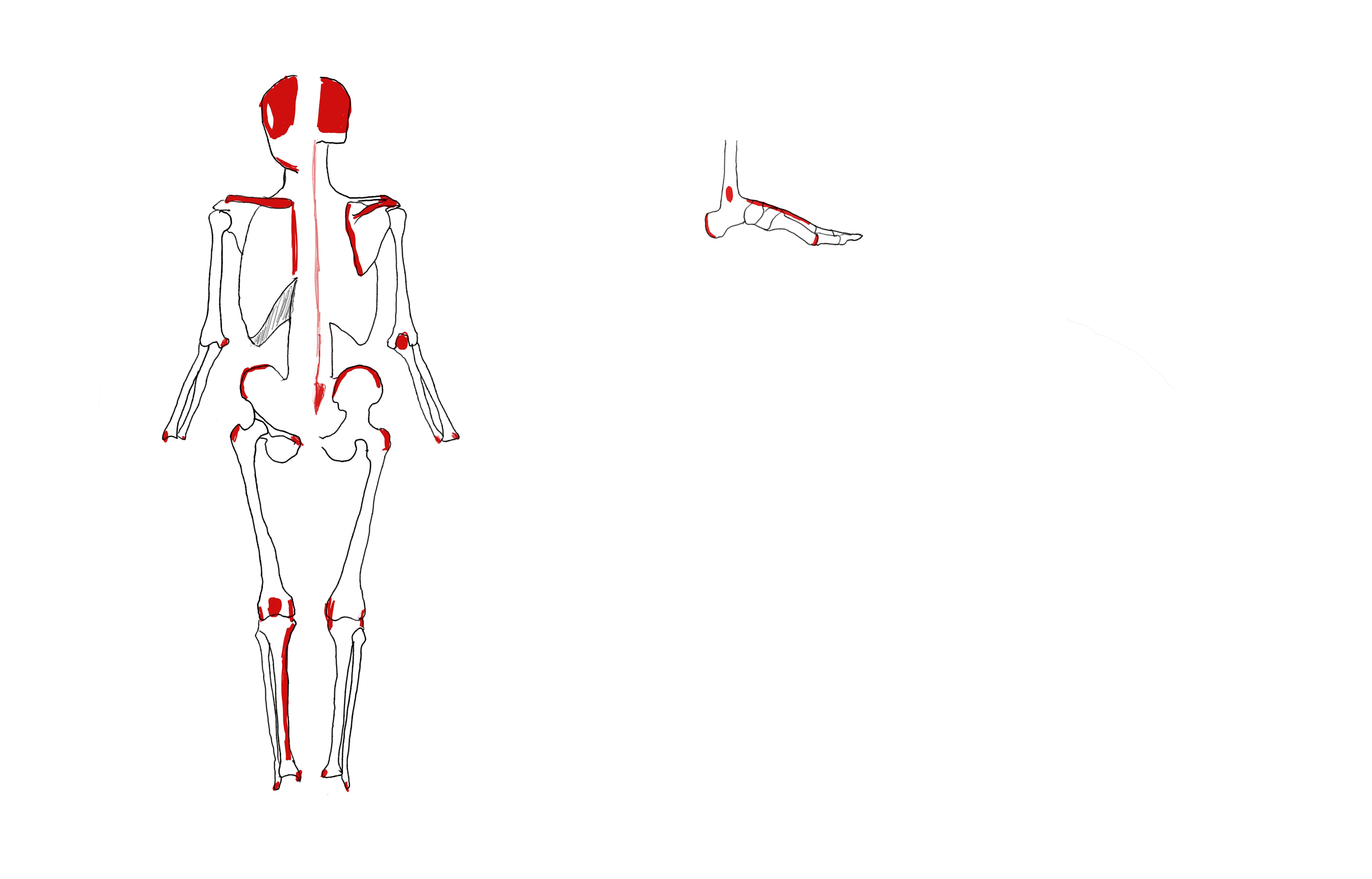 Voici le résultat. J'ai dimplifié le squelette par rapport aux précédents transmis et indiqué les points de contact osseux.