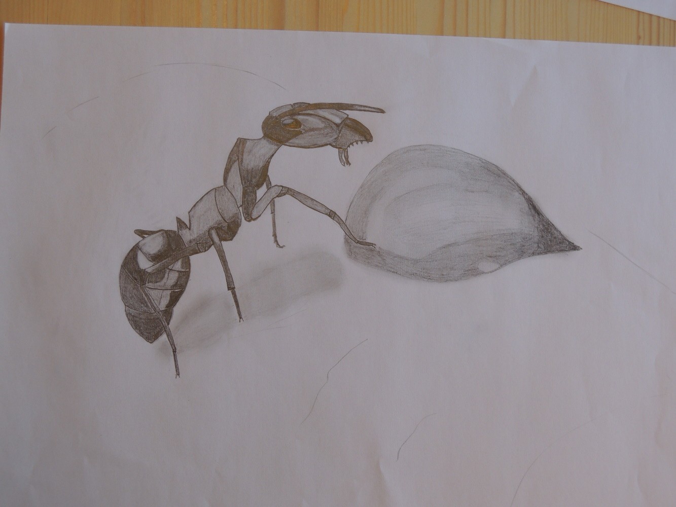 2 : je suis tombé sur le tuto de la fourmi qui m'a beaucoup plus. peut être quelque imprécisions de proportion sur certaines parties de la forme de la fourmi. ensuite j'ai fais une première expérience de valeur et de valeurs de traits en mode "à l'arrache". j'ai aussi fais un essai d'estompe au doigt sur la bulle à coté de la fourmi (là aussi complètement improvisé).