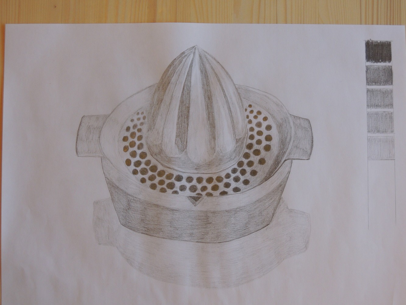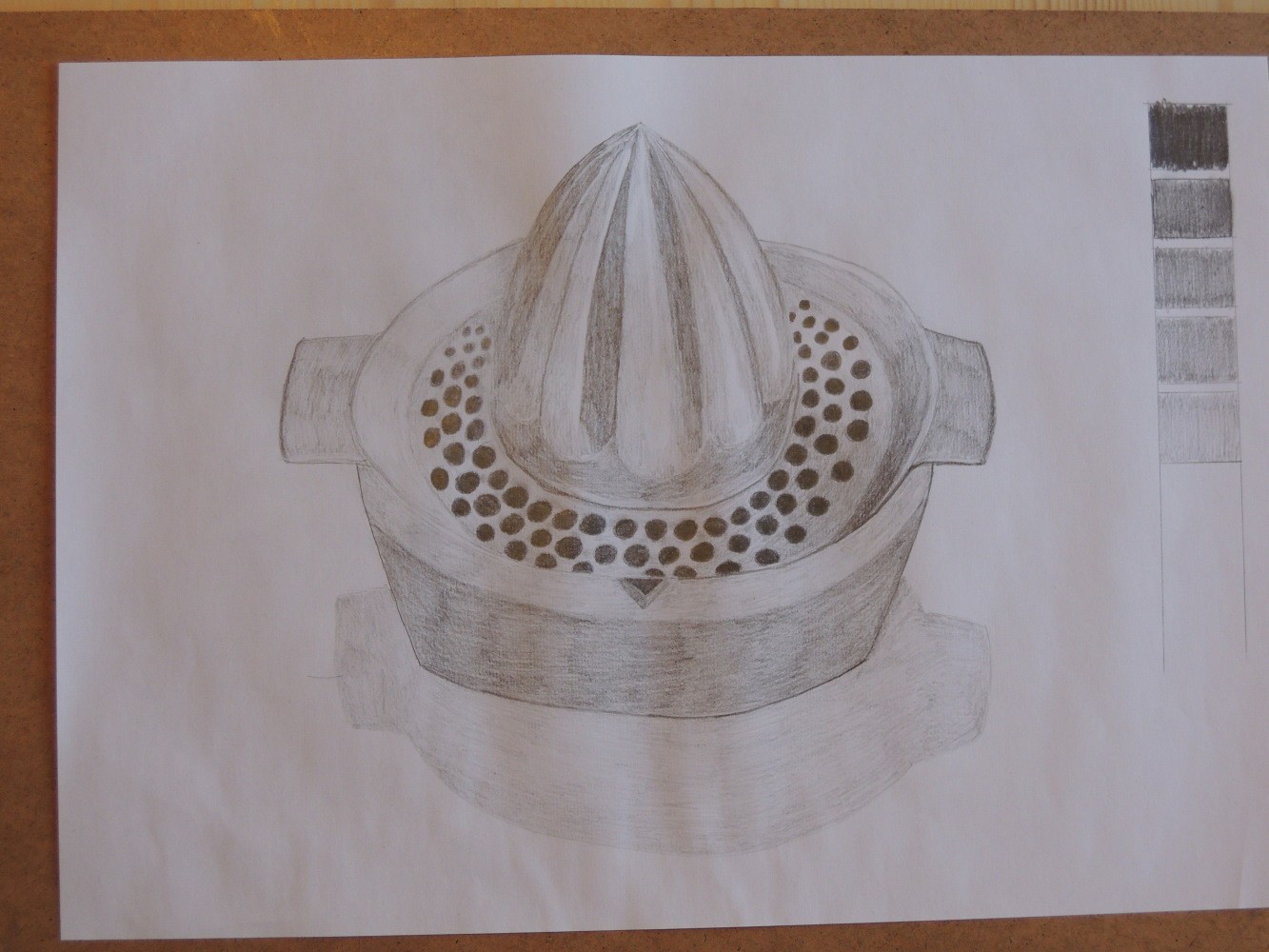 3 : j'ai voulu continuer sur les valeurs en essayant de travailler une forme ronde en perspective. et j'ai bien galéré avec mon presse-agrume en inox. j'avais pourtant fait une planche d'étude et tout mais j'ai vraiment du mal avec les formes courbes (et les ellipses donc). j'ai aussi bien souffert avec les trous noirs. j'ai du m'y reprendre plusieurs fois, j'ai cru que j'allais traverser la feuille avec la gomme.