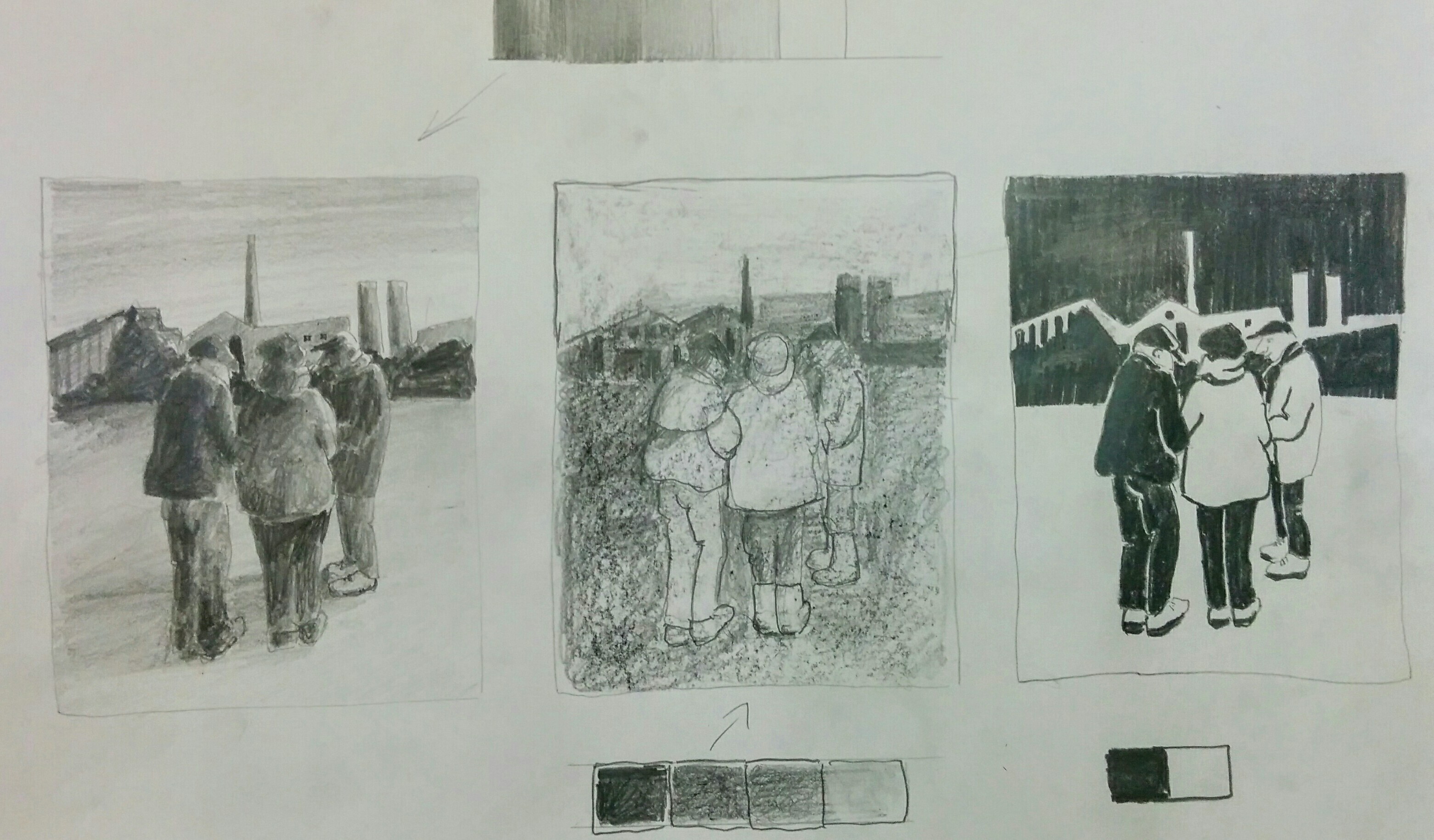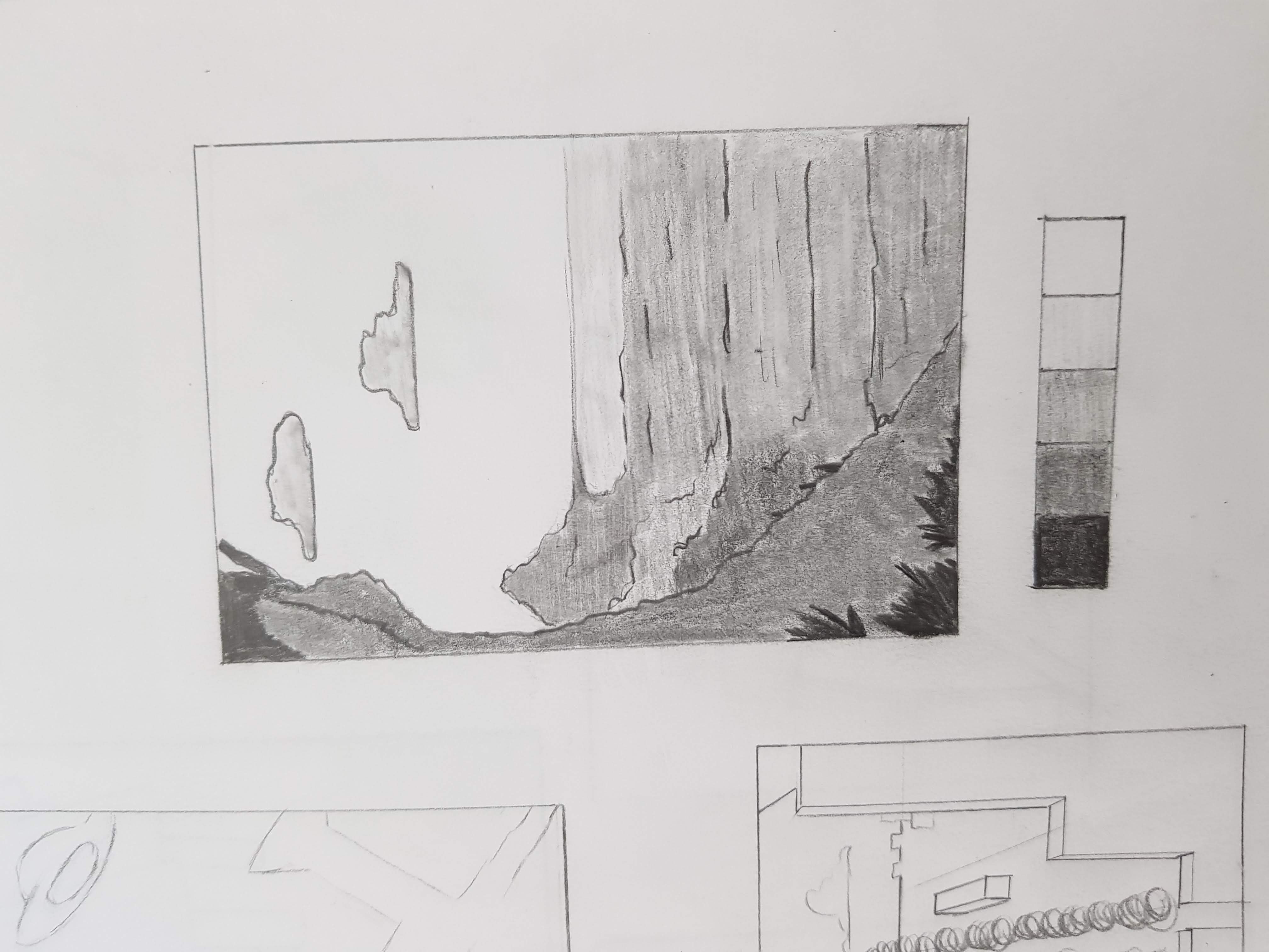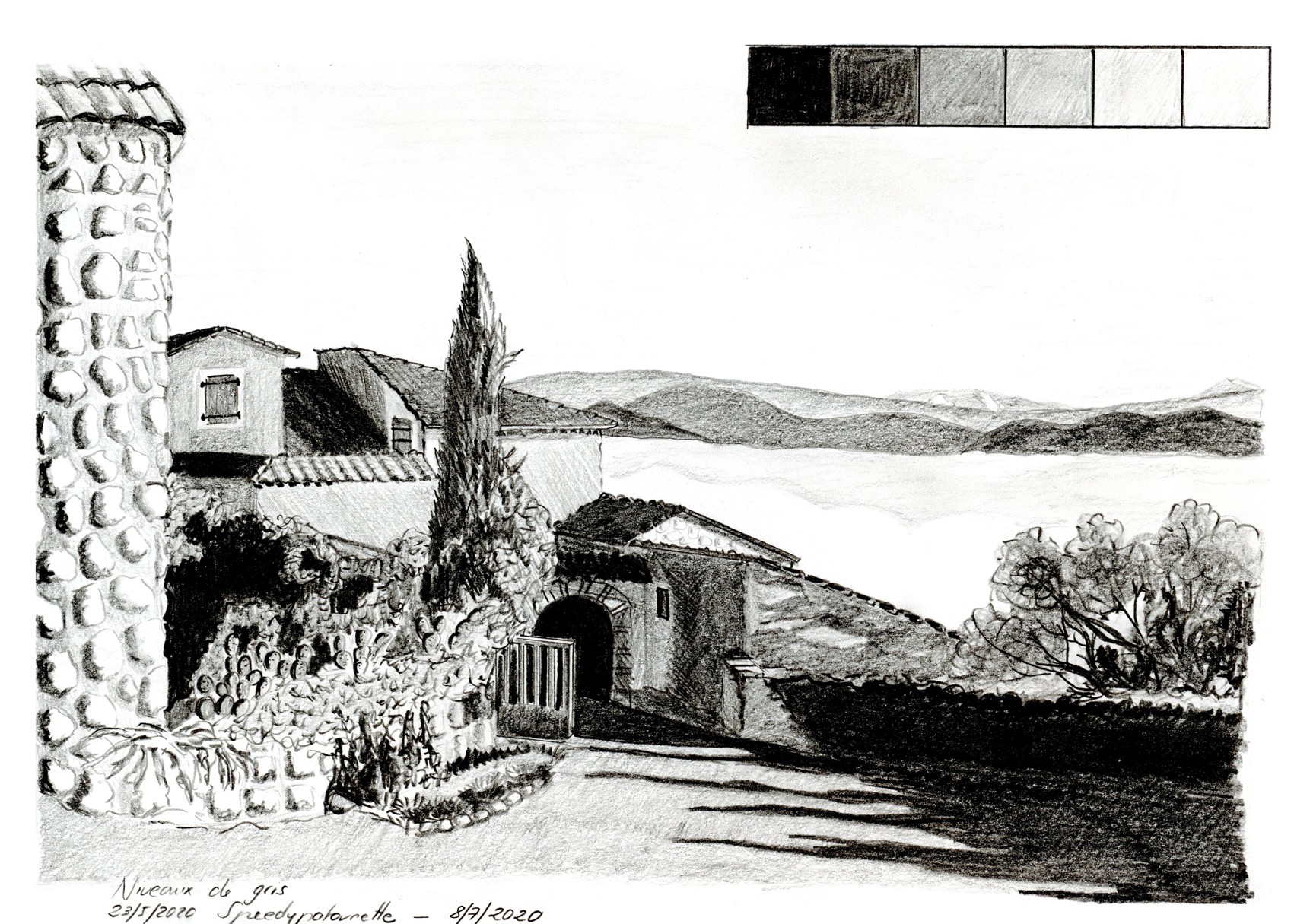 bonjour, photo grise parce que le graphite brillait sur la photo alors j'ai diminué le contraste, Mais ça ne change rien, jamais travaillé en valeurs de gris consciemment. Très intéressant. Merci pour les conseils, j'ai beaucoup de mal à faire les choix. Je continue à travailler mais je suppose qu'on envoie pas tout!