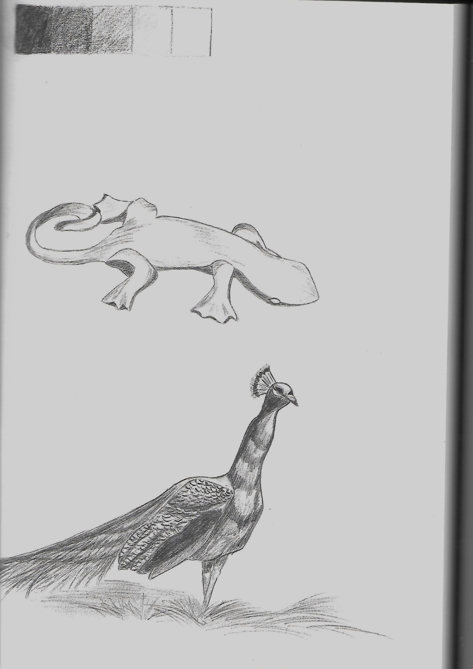 Ich kann Ihre unterschiedlichen Grautöne sehen, was eine gute Sache ist: D hingegen müssen Sie noch arbeiten und studieren, um die Schatten auf kohärentere Weise zu platzieren. Hier haben Sie Bereiche, die flach erscheinen (zum Beispiel die Flügel des Pfaues). Aber es ist sowieso ein guter Anfang. 👍