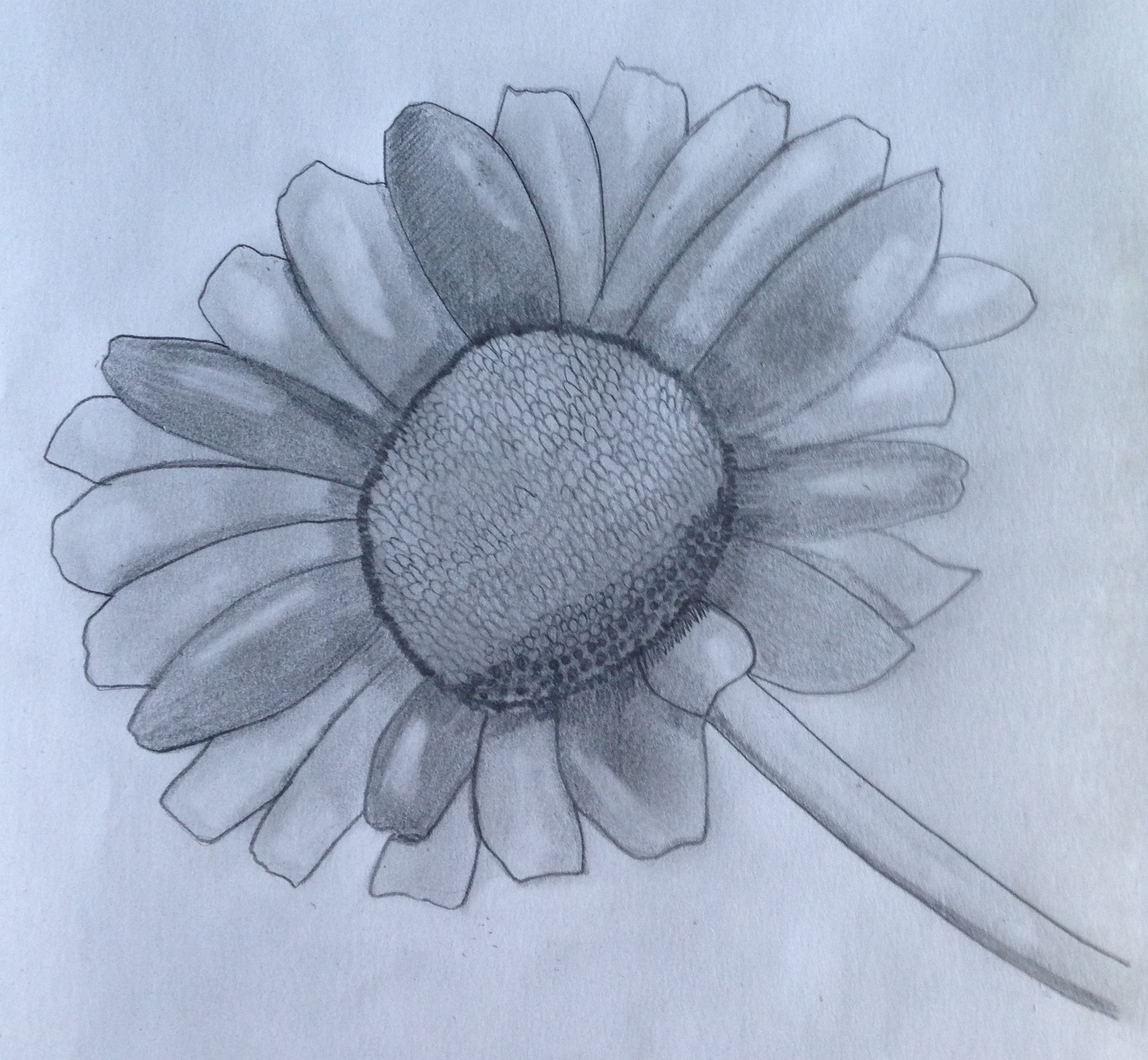 Voici deux pochades avec les nuances de gris et la marguerite à suivre. J'avoue que j'ai du mal à savoir où mettre les différentes nuances de gris. Pour les pochades j'ai essayé de faire comme s'il y avait de la lumière qui arrivait un peu dans le dos. Et pour la fleur, j'ai fait un peu au pif ... Si tu as des conseils notamment pour créer du volume, je suis preneuse.