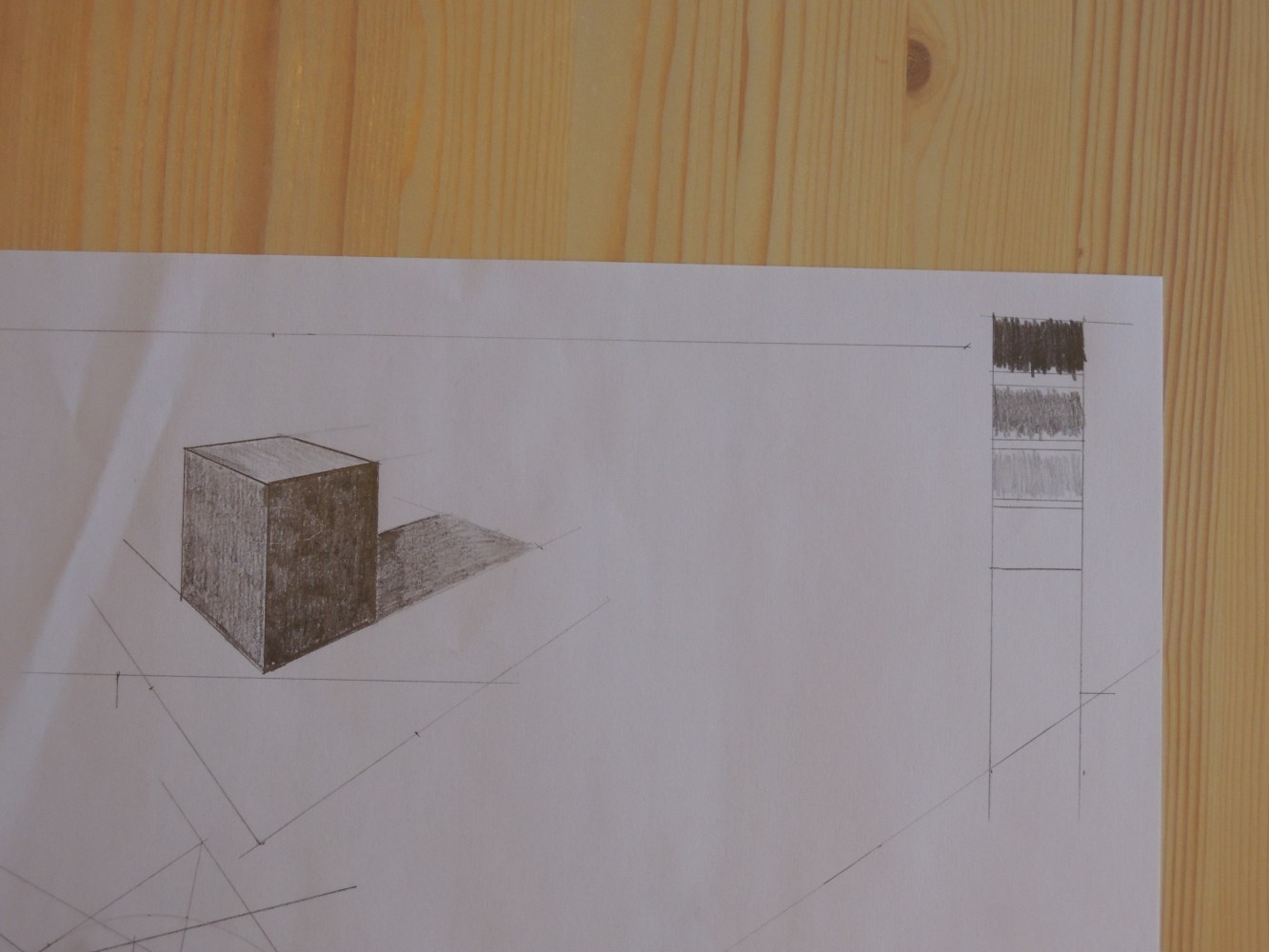 1: ein Würfel. Ich wollte die Perspektive der Zeichnung vertiefen. Ich fragte mich, wie man einen "echten" Würfel in der Perspektive zeichnet. Hier ist ein sehr vereinfachter Fall: Ich habe aus einer Planansicht angefangen und den Standpunkt mit der niedrigen Ecke des Platzes im Plan verwirrt. Dann verwirrte ich die Erdlinie und die Horizontlinie. Dann machte ich eine vereinfachte Planung, um meinen Platz in der Perspektive zu erhöhen. Ich nutzte die Gelegenheit, um einen ersten Werttest durchzuführen (mit einem Modell und einer hausgemachten Beleuchtung).