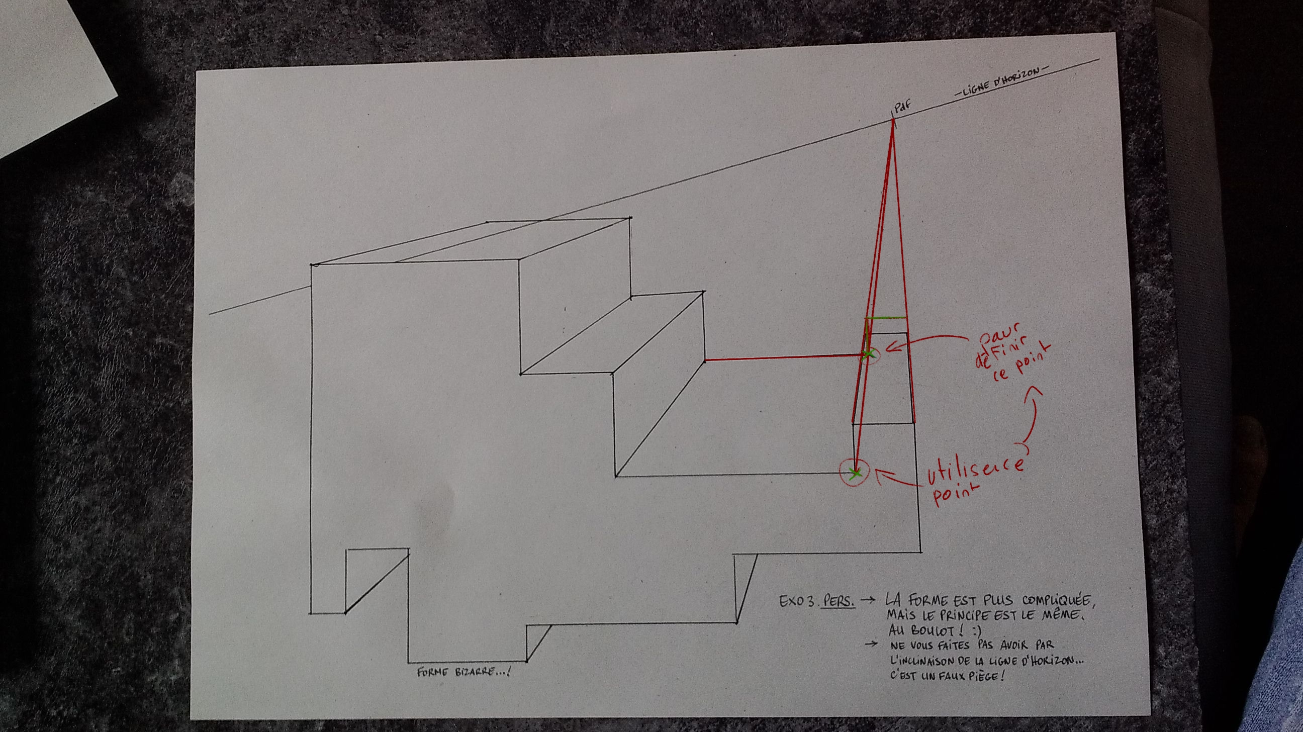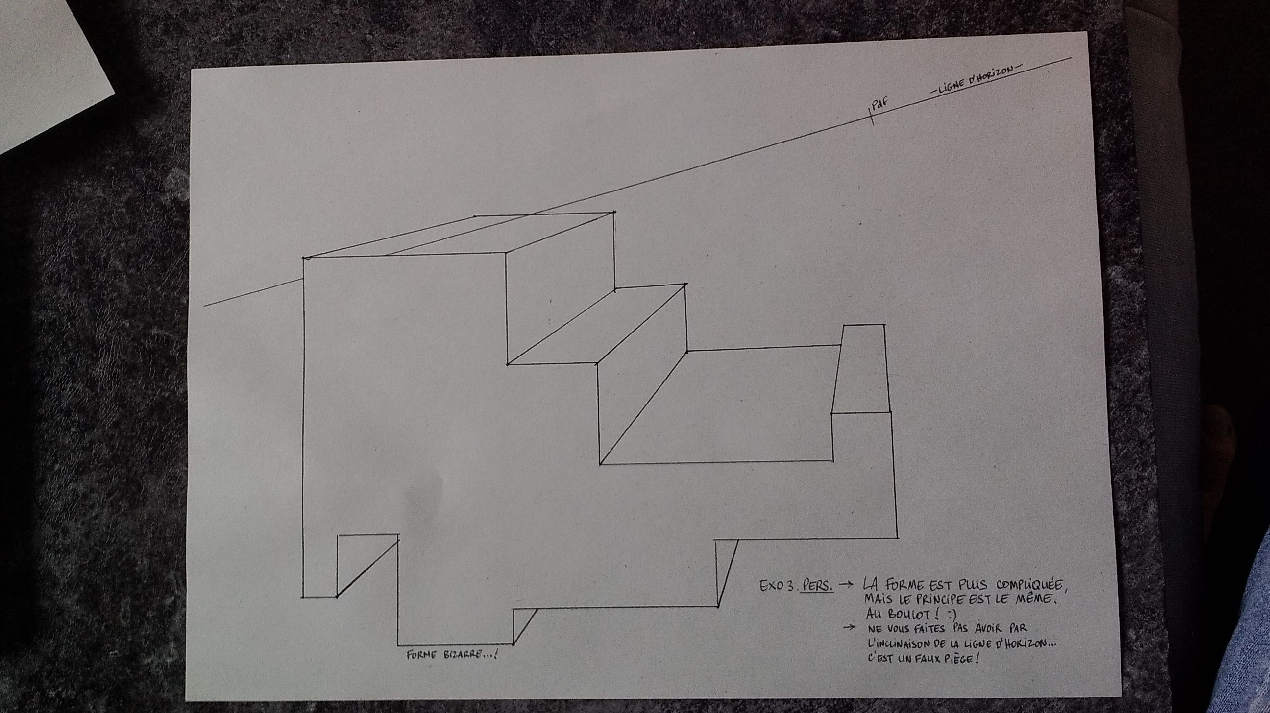Hello PaaCman. C'est bien, mais fait attention à ce que tes lignes soient bien parallèle (attention avec les traits à main levé dans les exercices de perspectives). Tu perds en précision sinon...