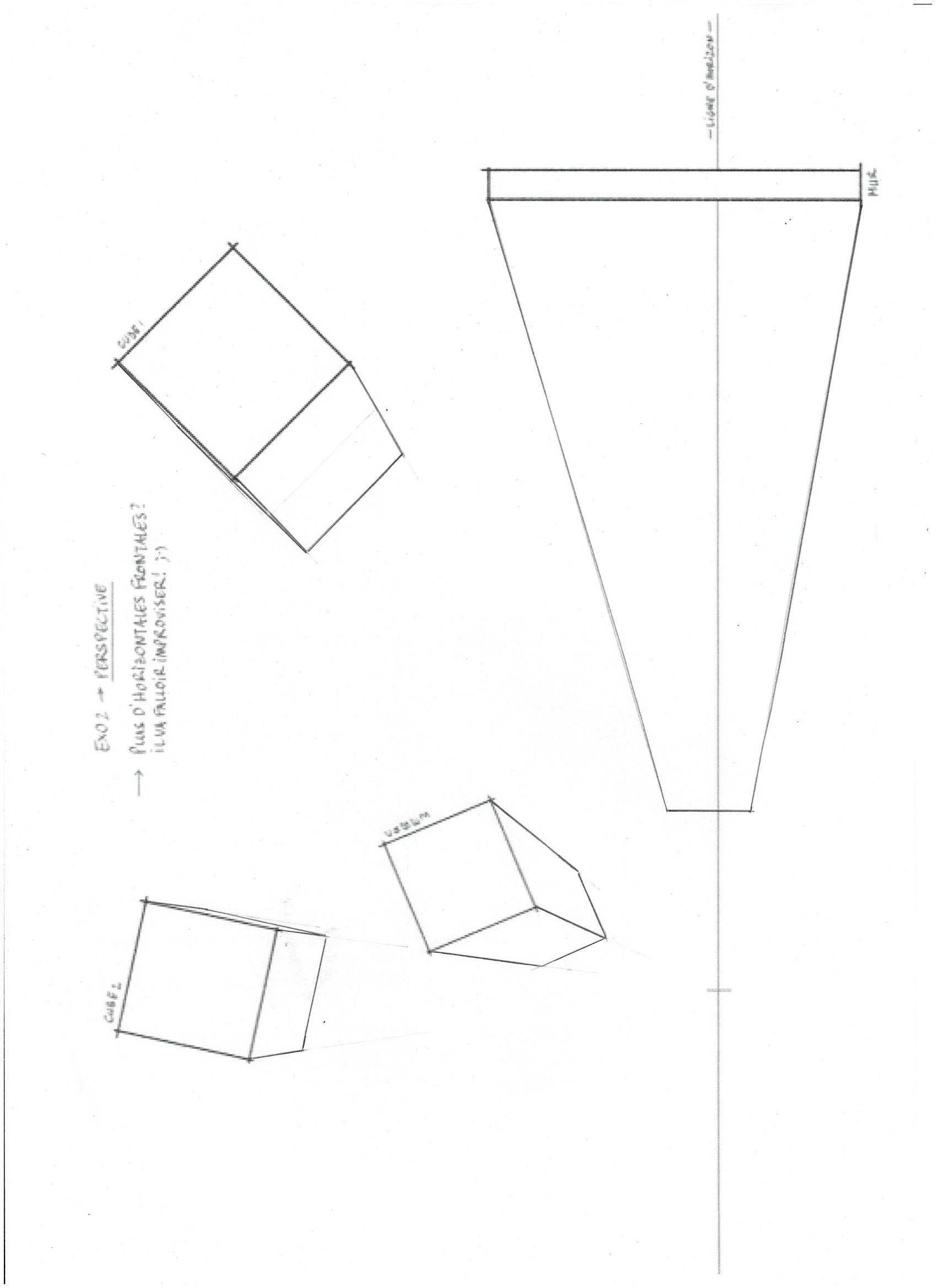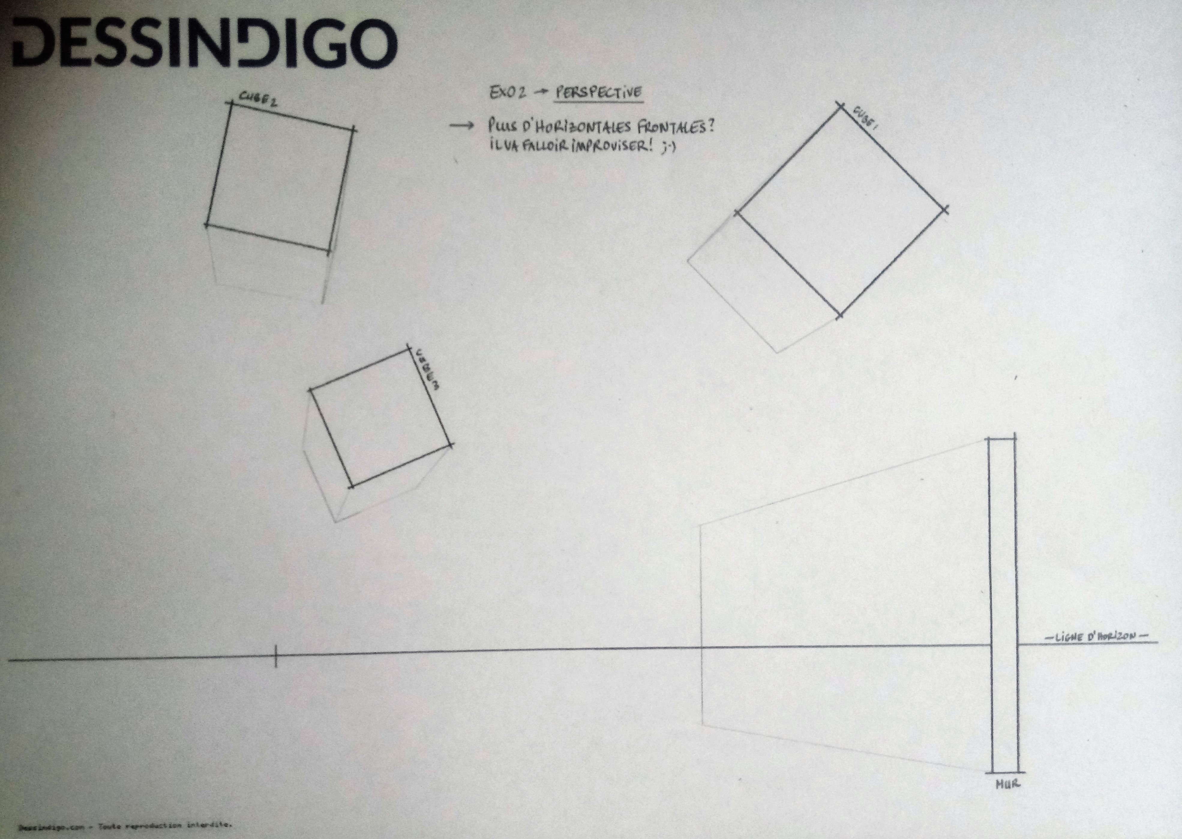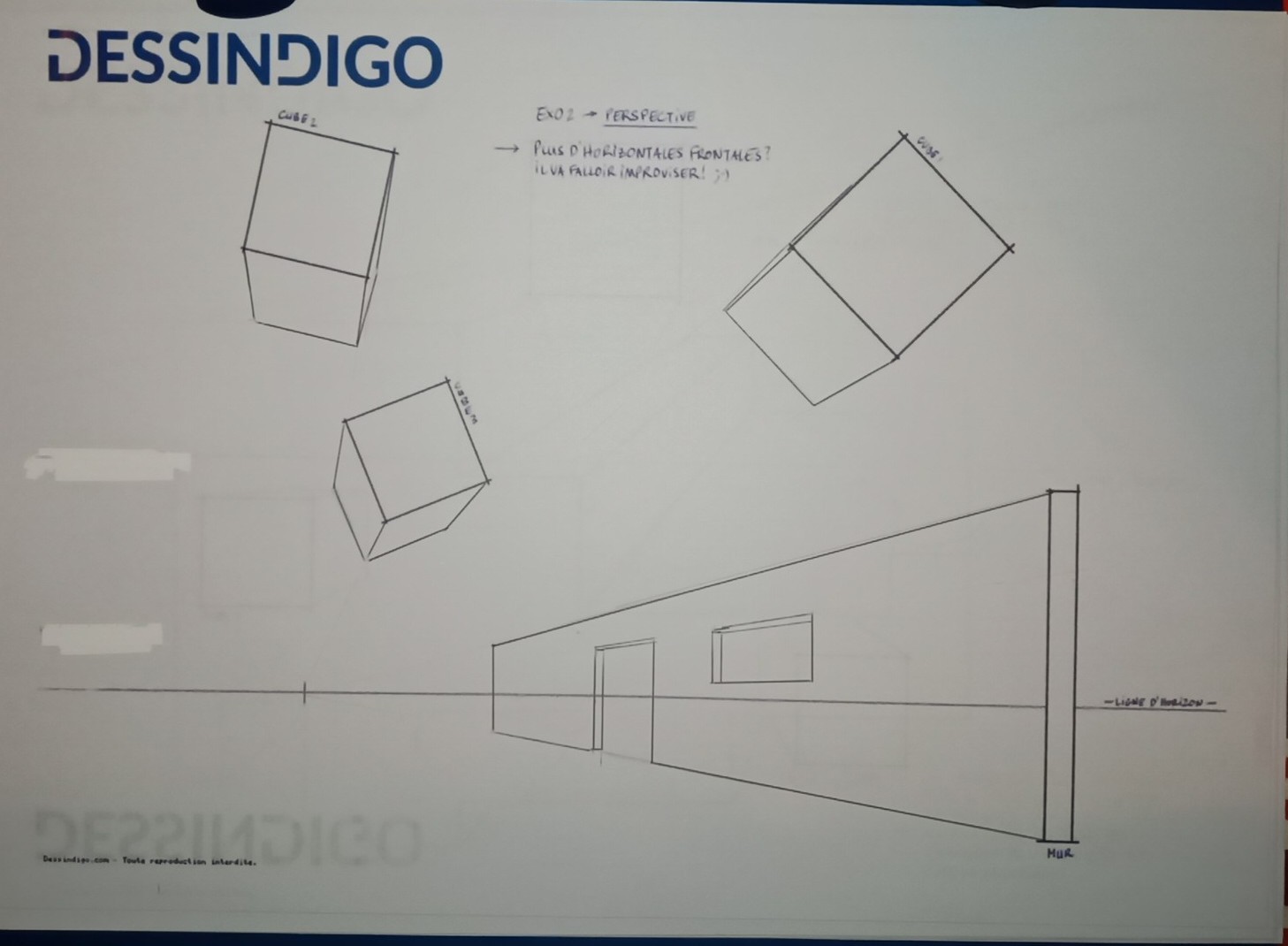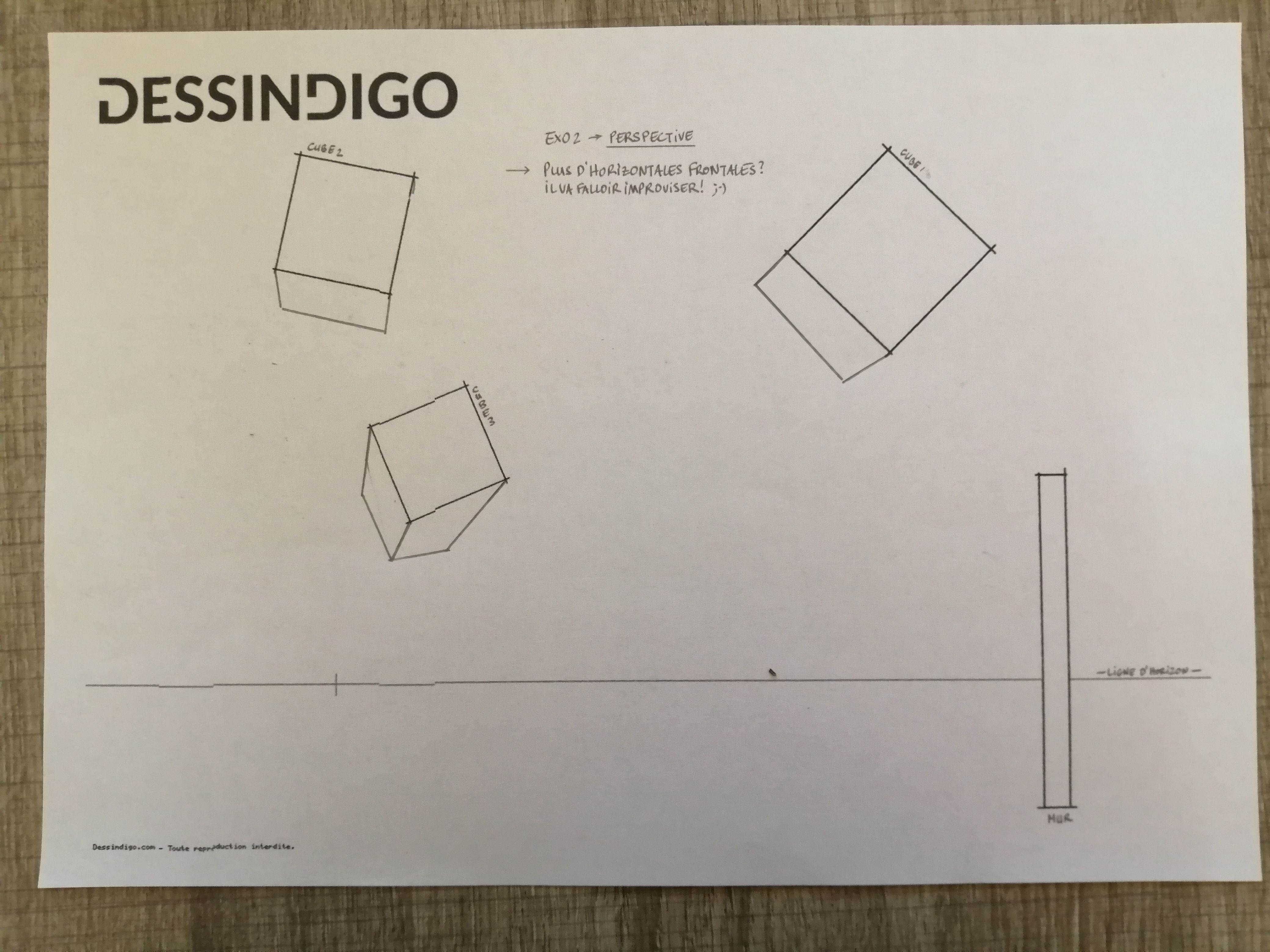 Tu as bien compris le premier exercice, mais attention à tes lignes qui ne vont pas vers le point de perspective ! Elles doivent bien être parallèles entre elles 😉