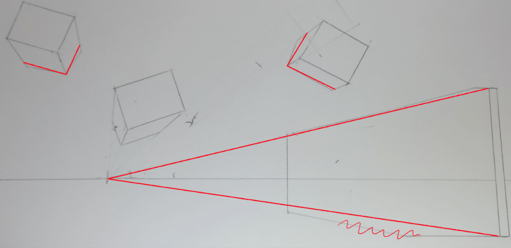 Sie haben die erste Übung gut verstanden, aber achten Sie auf Ihre Zeilen, die nicht in den Punkt der Perspektive geraten! Sie müssen parallel zueinander sein 😉