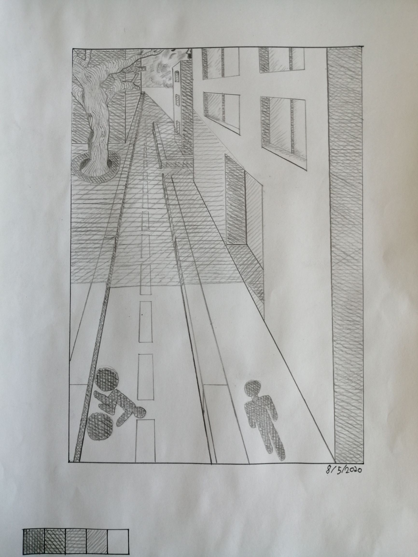Mais tes hachures sont trop présentes sur celui-ci, elles attirent l'attention plutôt que de mettre en valeur ton dessin et le parasitent. Je pense que c'est parce que tes hachures sont grandes.Tu as essayé de les faire coller aux zones (le trottoir, la route, etc.) et on voit que tu n'as pas fait toutes tes valeurs dans le même sens (c'est ce qui parasite). Celles du sol sont horizontales, celles des murs en biais, mais parfois vers la droite et parfois vers la gauche. Et l'arbre a des hachures qui suivent son volume. En fait tu utilises différentes techniques de hachures ensemble, ce qui fait que ça ne fonctionne pas. Il faut que tu choisisses ce que tu veux faire : est-ce que tu veux des hachures qui suivent le volume sur lequel elles se trouvent (l'arbre / le sol), ou des hachures "d'habillage" si je puis dire. Mais dans ce cas-là, il faut qu'elles soient toujours toutes dans le même sens. Ici j'ai grosso modo le même gris sur la paroi à droite qu'au sol et au mur de l'immeuble du fond, mais les hachures n'ont pas le même >> pas logique).