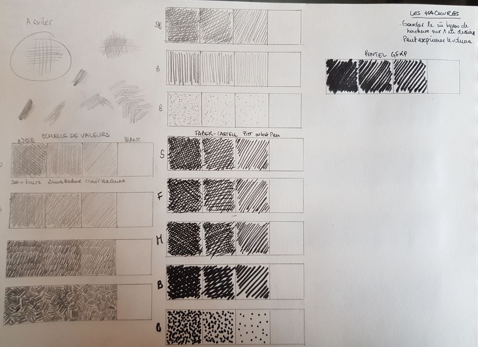 Pour les teintes claires, il faut appuyer peu et si tu as besoin de dégrader vers le blanc, tu peux espacer tes traits (toujours de manière égale, attention). Si tu écartes tes traits = valeur plus claire, si tu les rapproche = valeur plus foncée :)