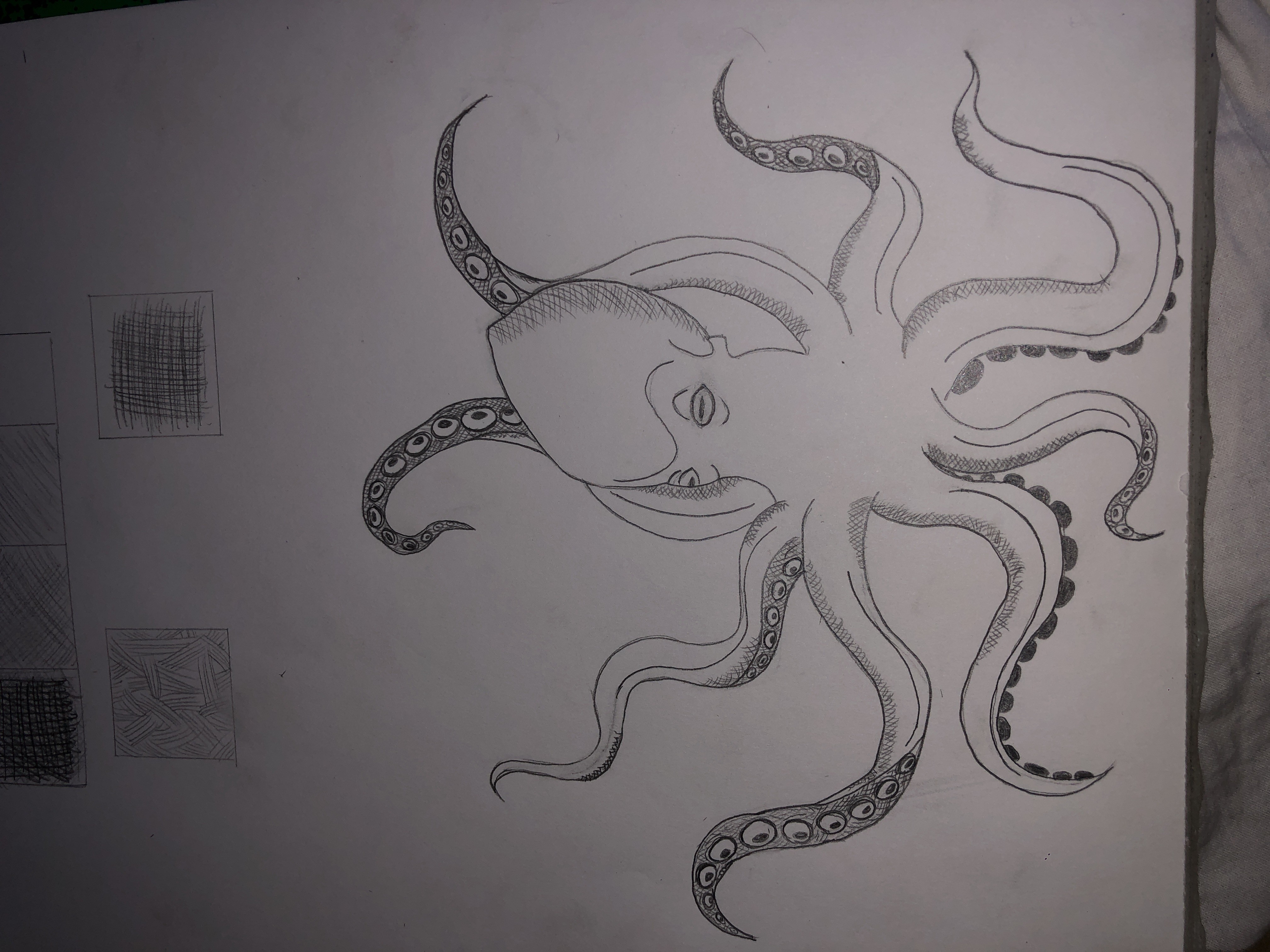 Ici, je vais rester sur ce que tu avais commencé à faire : donner des informations de volume. Ces informations sont indépendantes de la source lumineuse (tu as placé des ombres par rapport à la forme des tentacules, sans te dire, j'ai une source de lumière à cet endroit à peu près : je le vois car tu as des ombres sur la droite, sur la gauche, sur le dessus et le dessous). Je te joins une image dans le message suivant avec ce que tu aurais pu faire pour donner des informations de volume : où est-ce bombé, où est-creux, etc ?