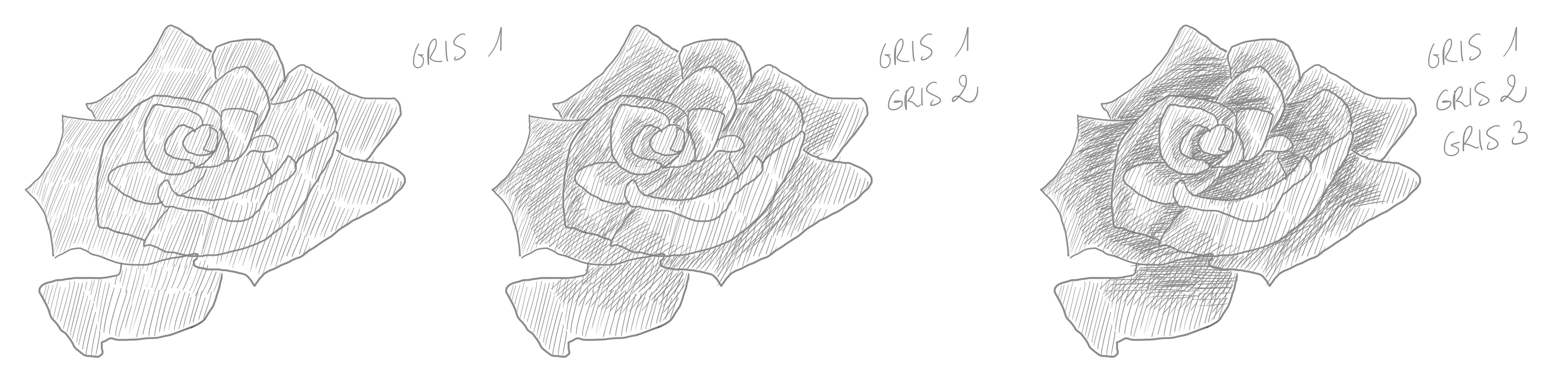 Ensuite, je te conseille de travailler par couches. C'est-à-dire que tu appliques partout le gris 1 (sauf aux endroits que tu veux laisser en blanc bien sûr).