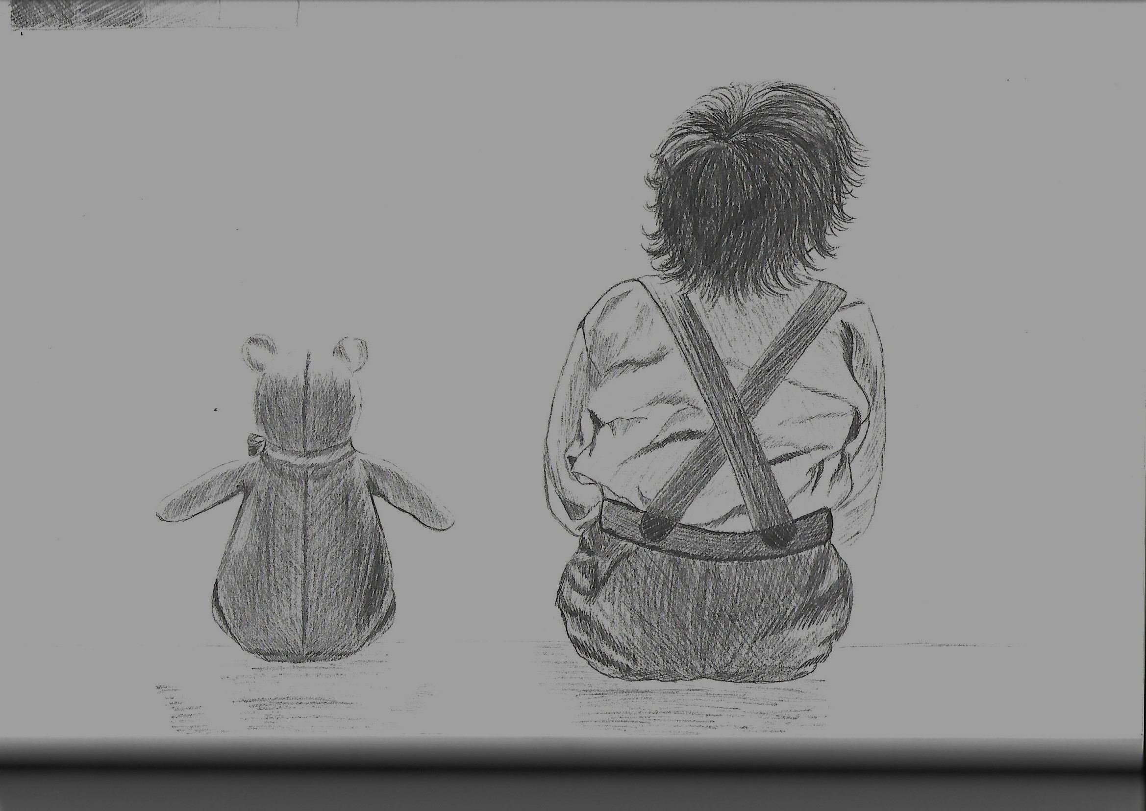 Ihre Arbeit ist schön in Bezug auf das Zeichnen in Bezug auf Grauwerte, aber ich habe einen kleinen Nachteil. In Ihren Werten haben Sie den "farbenfrohen" Wert der Elemente angegeben und die Volumeninformationen (die Hustenhusten) angegeben. Sie haben bestimmte Lichtinformationen über den Teddybären angegeben. Ich habe mich auf die Korrektur gestützt. Abhängig von den Nachrichten, die ich auf dem Bären habe, ist das Licht in der Höhe gegenüber der Höhe, plötzlich das Hemd des Kindes, auch wenn es weiß ist, es wird im Schatten weniger weiß sein. Das Gleiche gilt für die Overalls, die dunkler sein werden, außer auf den von Licht getroffenen Bereichen. Ich füge Ihnen eine schnelle Mini -Korrektur an ^^