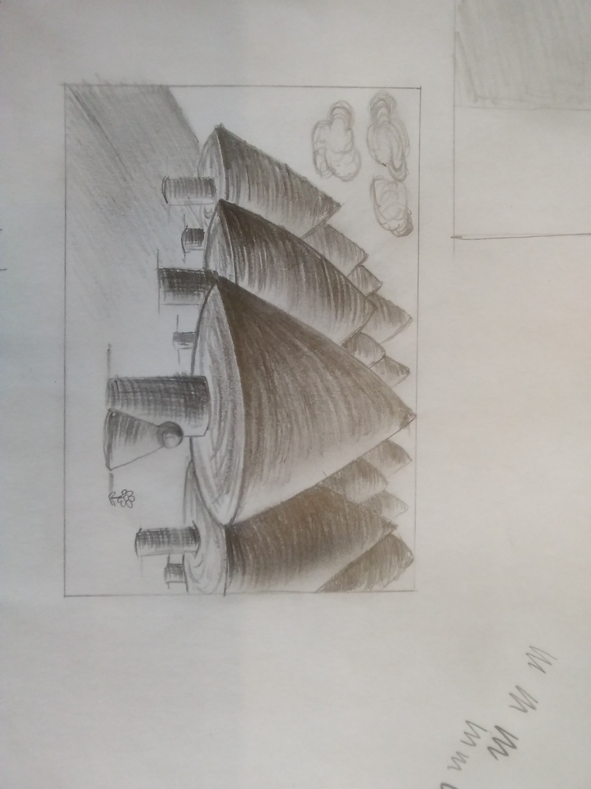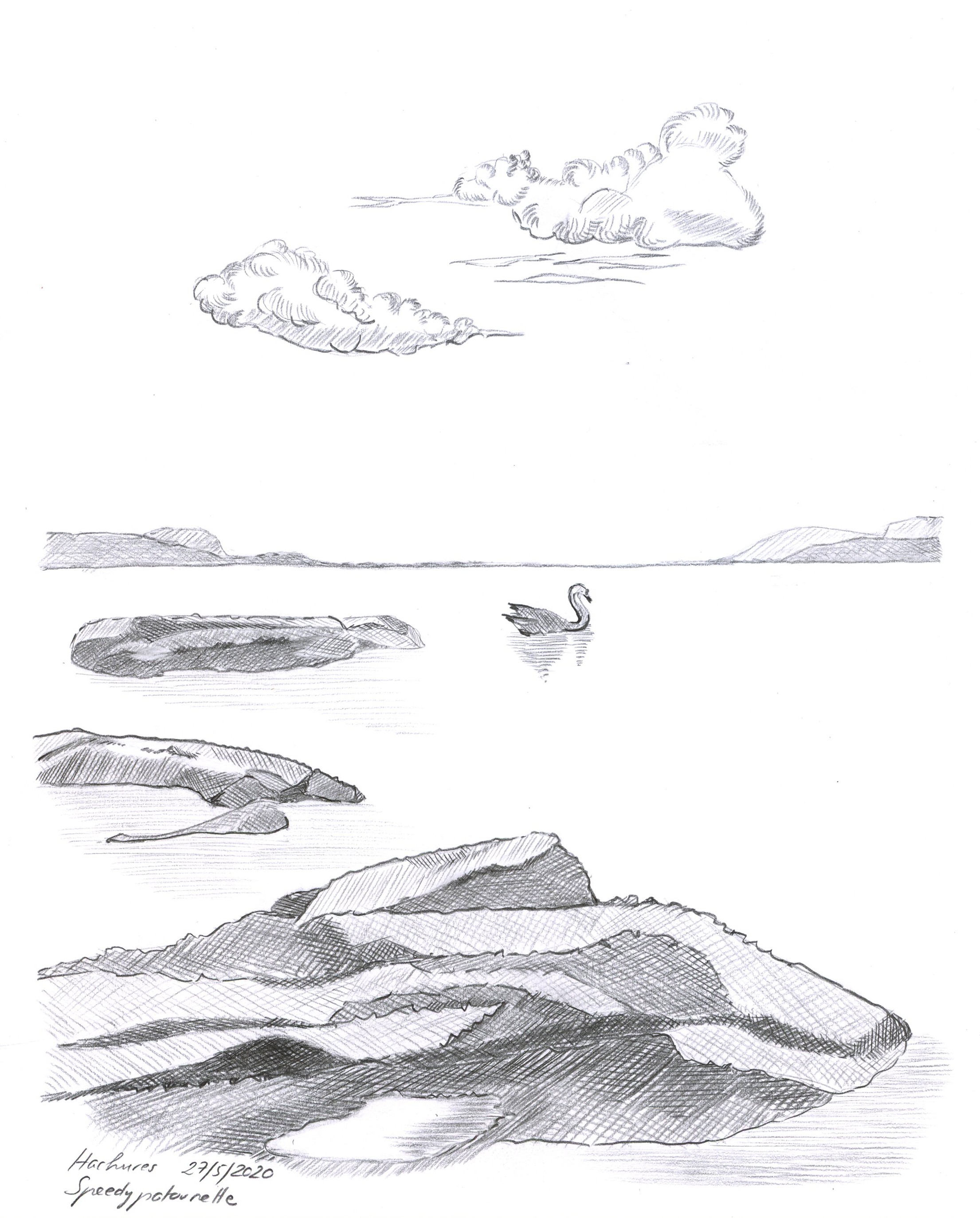 Pour l'exercice numéro 2 donc, il faut que tu restes cohérente sur ton traitement des hachures. Ici tu as fait des hachures par facettes sur tes rochers (ce qui est une très bonne idée, c'est comme ça que je fais quand je dois aller vite aussi), mais des traits arrondis qui suivent le volume pour les nuages.