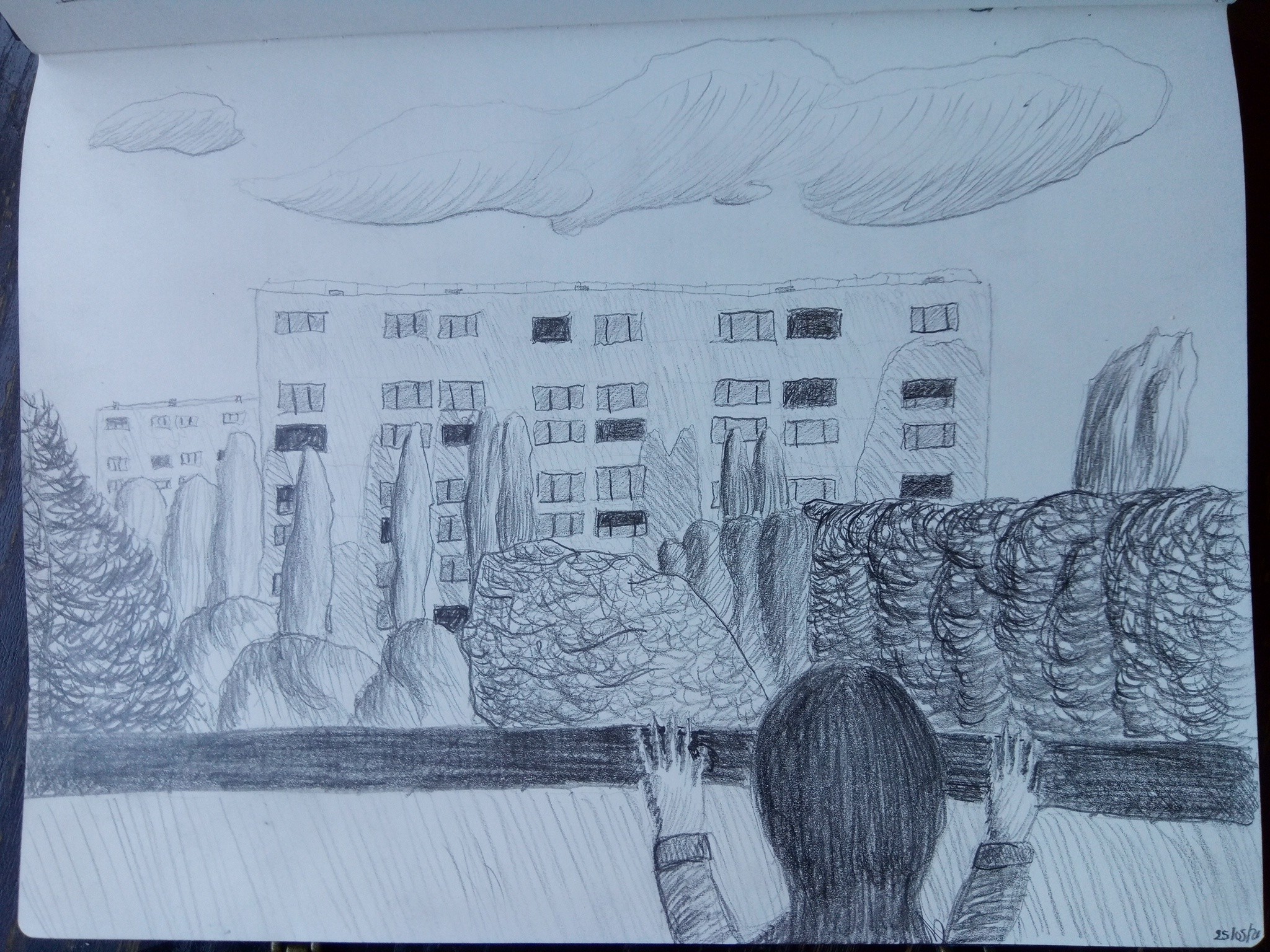 Voici une deuxième tentative. Le défi fût de mettre des hachures dans les nuages, dans les rocher du premier plan.