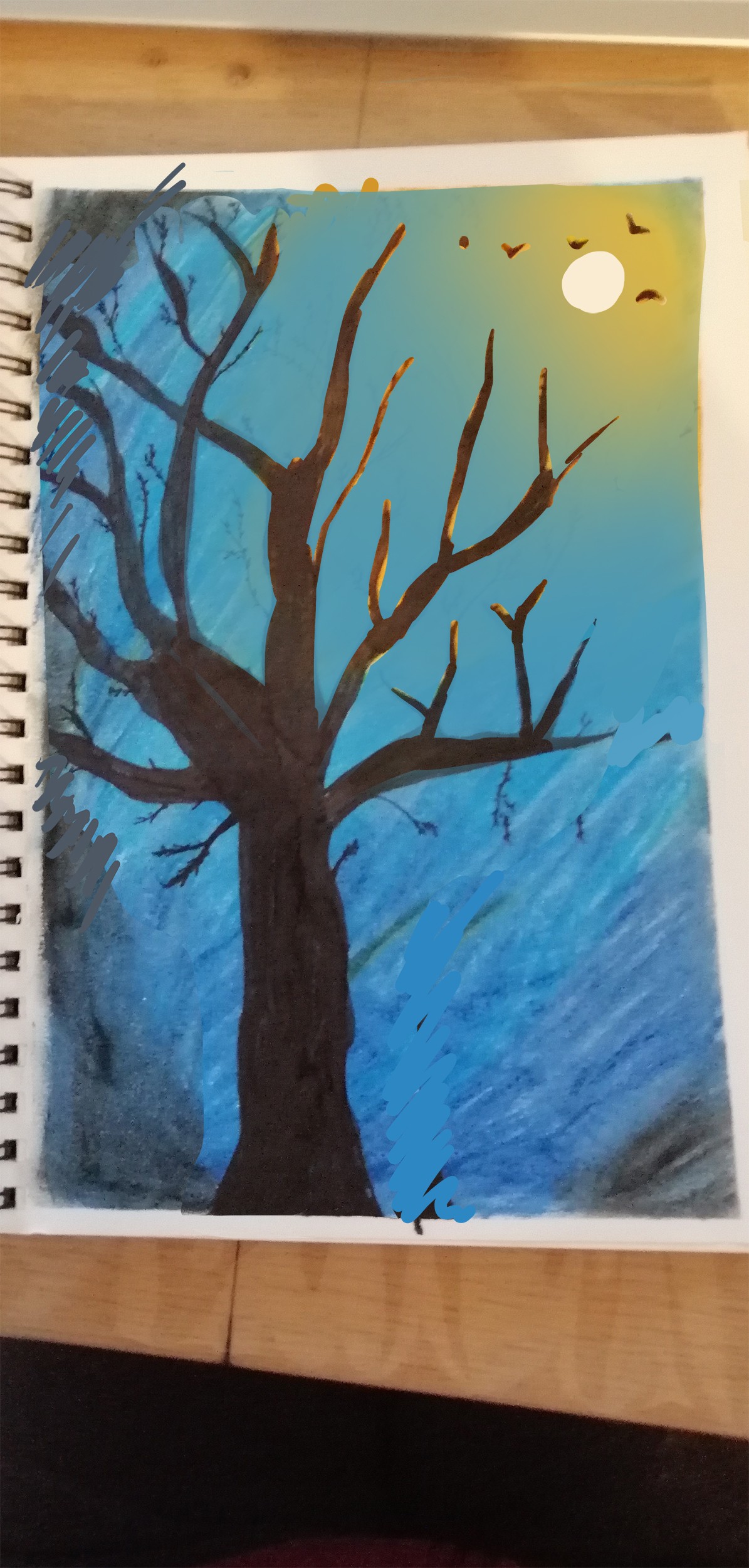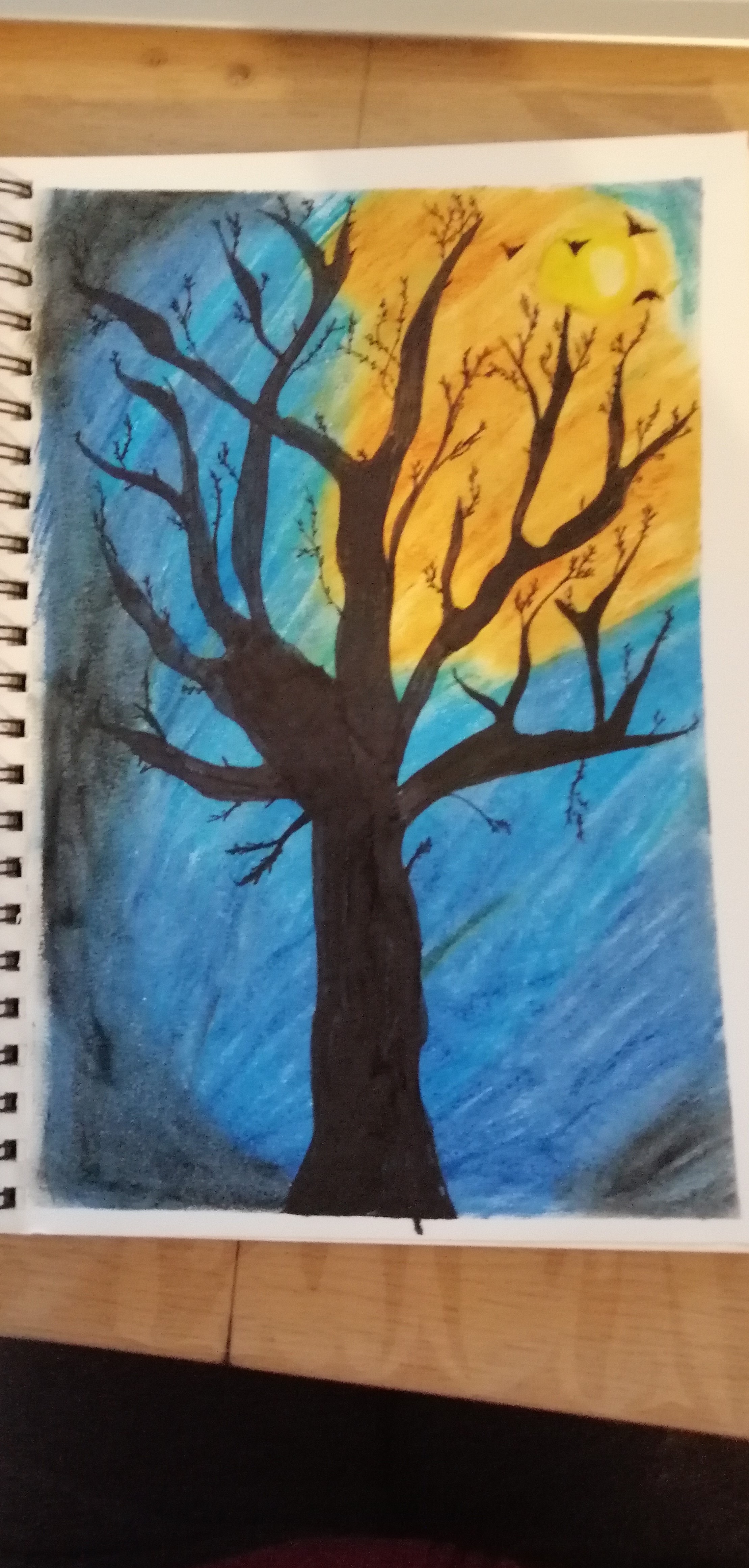 Concernant ton dessin, on a le regard un peu attiré vers la zone chaude effectivement, mais le regard revient toujours vers l'élément principale et central : l'arbre. Ceci dit, bravo pour avoir ajouté la difficulté couleur en plus sur ton image, tu as spontanément utilisé une teinte chaude qui effectivement attire pas mal le regard par rapport au bleu, mais je pense qu'on aurait pu jouer sur les couleur un peu autrement pour ne pas avoir un effet trop tranché dans le ciel qui est étrange.