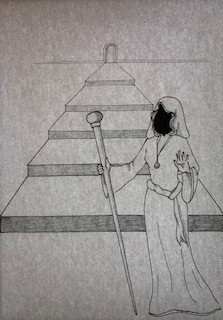 Bon voilà, après petit tips : essaie au maximum d'éviter les tangentes. (C'est à dire qu'un élément frôle un autre) Elles ne sont pas si terribles sur ton dessin mais comme il y a peu d'éléments... Le haut du sceptre qui se confond avec le bord de la marche, la manche qui frôle l'horizontale de la marche du dessous... ce genre de chose. J'aurais aussi déplacé le personnage lééééégèrement plus à gauche pour que le bâton se retrouve moins au centre de ton image et que son visage encapuchonné soit plus "dans" les marches (car là pareil ça frôle un peu). Bon tu es sur papier alors ça c'est tant pis ^^'