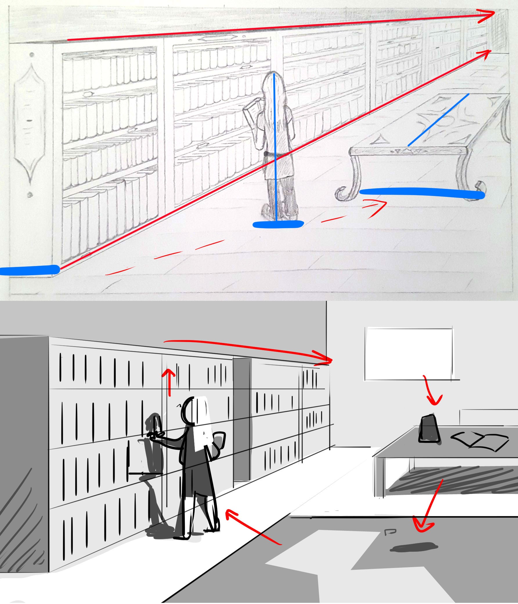 - Ihre Zeichnung ist nicht symmetrisch, aber es gibt eine Art Monotonie, die sich niederlässt, weil sich alles in Richtung Fluchtpunkt flieht. Die Bibliothek ist normal, aber die Füße des Charakters und die Füße des Tisches sind auch in der Ecke oben rechts Crescendo! Das Hinzufügen von etwas unten rechts kann helfen.