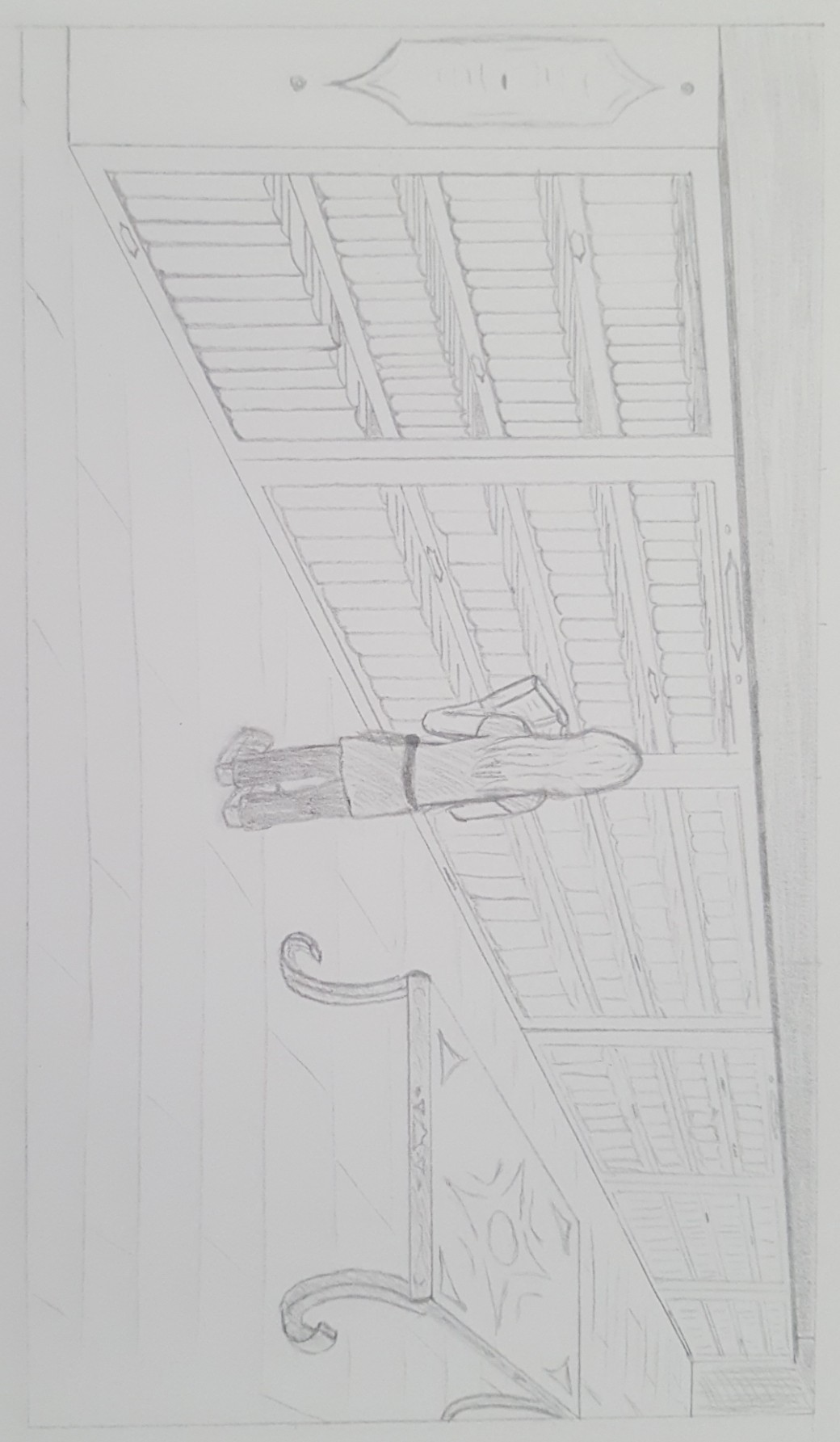 - L'oeil manque un peu de points d'accroche : il y a le personnage au centre mais il est de dos, la table et... une énorme ligne de fuite (la bibliothèque) qui nous demande expressément de sortir de l'image et de passer à autre chose ! (la ligne se terminant littéralement dans le coin supérieur droit de la feuille)... Le but du jeu de la composition en général c'est d'essayer de "piéger" le regard à l'intérieur de ton dessin :)