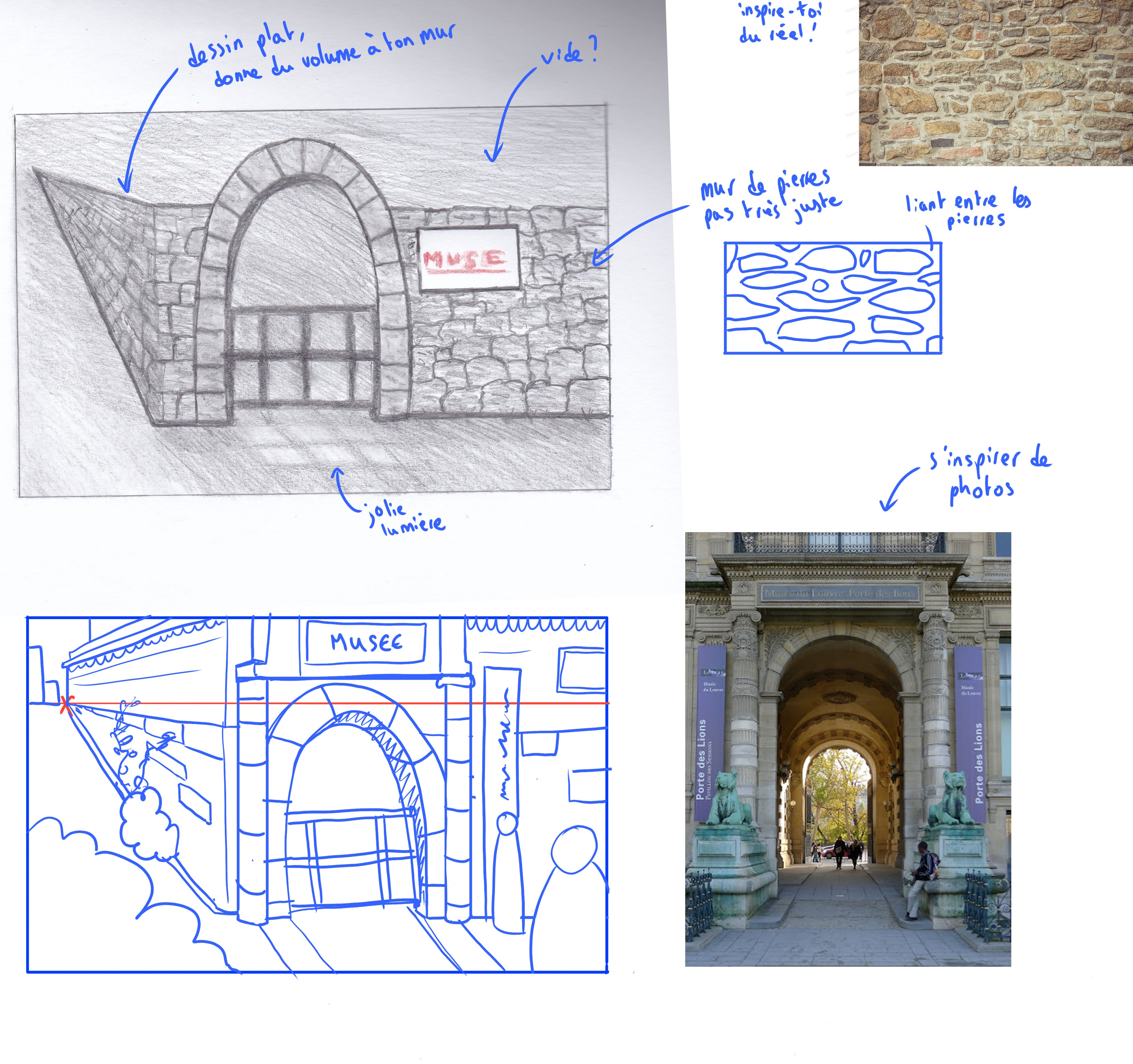 Bravo für Ihre Leistung, Ihre Zeichnung nimmt jedoch nicht die gleiche Perspektive wie auf dem Foto!