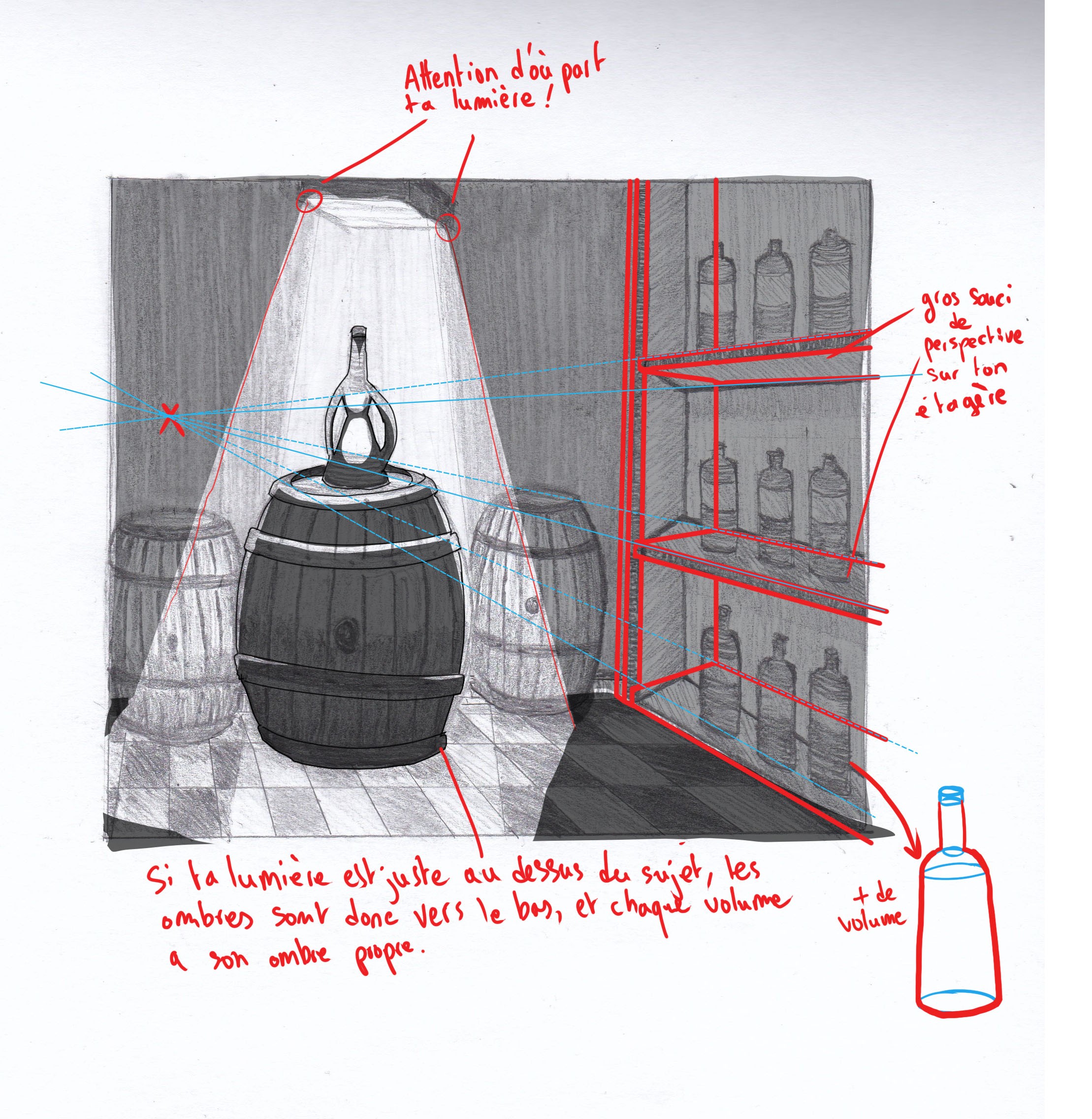 Tu as de gros soucis de perspective sur ton étagère, n'hésite pas à construire avec un point de fuite pour t'aider.