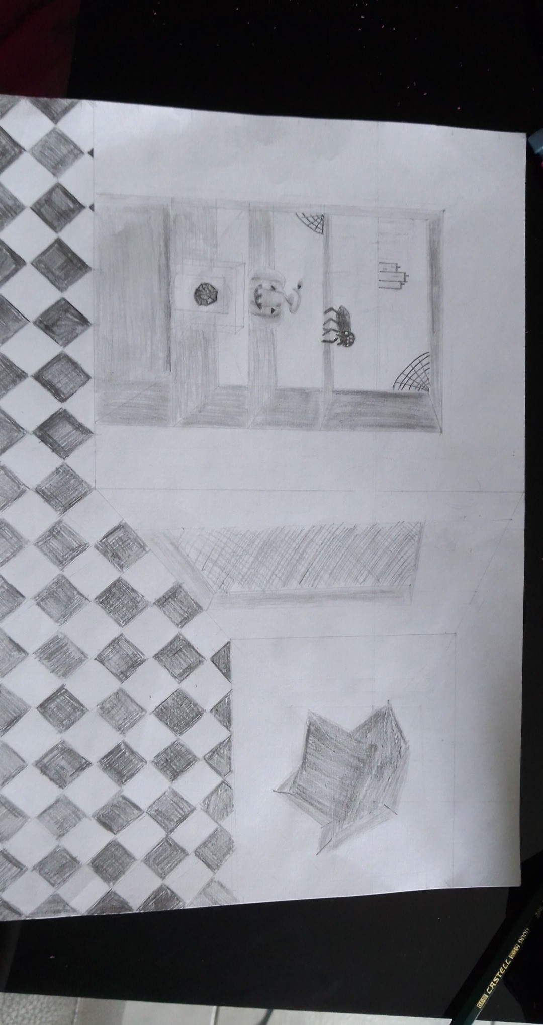 Für diese Zeichnung haben Sie viele Perspektivprobleme, die Auswahl eines karierten Bodens ist überhaupt nicht einfach!