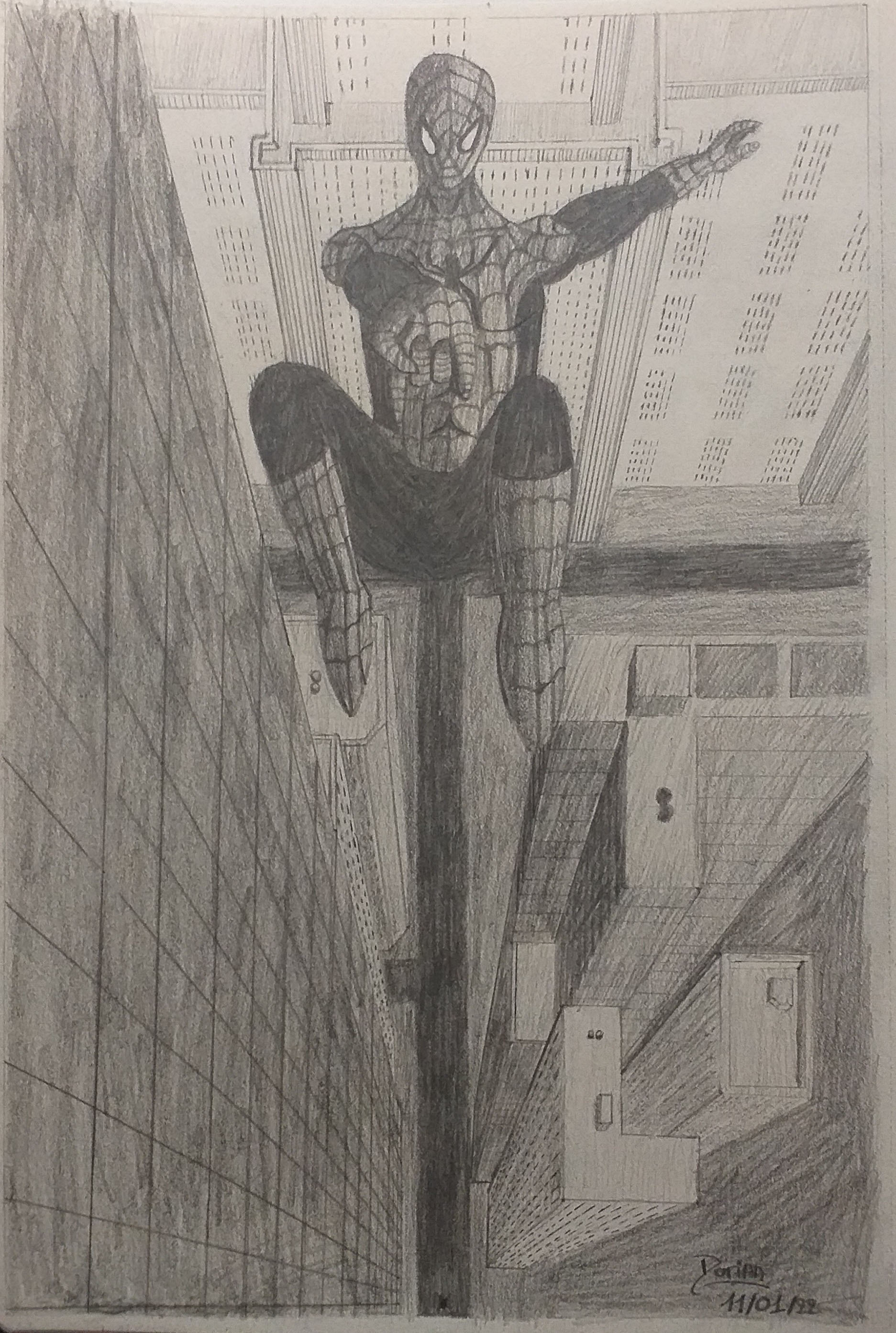 Pour cette exercice j'ai essayé d'appliquer différents cours. Les valeurs de traits, mais lors du remplissage je me suis rendu compte qu'on ne voyait plus les nuances 😟. La perspective bien évidemment, les bonnes proportions des personnages, les nuances de gris qui, je trouve, sont assez ratés, et enfin la mise en scène. L'idée était d'avoir un personnage en haut de page qui attire immédiatement l'oeil, pour ensuite descendre sur le reste du dessin. Spider-man étant sombre j'ai décidé de le mettre derrière un batiment blanc pour bien le constraster avec le décor. J'ai également vaguement tenté de rajouter un effet de lumière pour nuancer les couleurs du costumes afin de mieux le démarquer du reste. Ensuite les traits liés à la perspectives nous font naturellement descendre vers le bas de l'image. Je pense avoir plutôt bien réussi la mise en scène, en revanche pour les autres cours abordés je pense être à la ramasse. Tout semble grisatre et, malgré quelques heures passé dessus, coloriés à la va-vite. Voilà j'ai hâte de savoir ce que vous en pensez 🙂