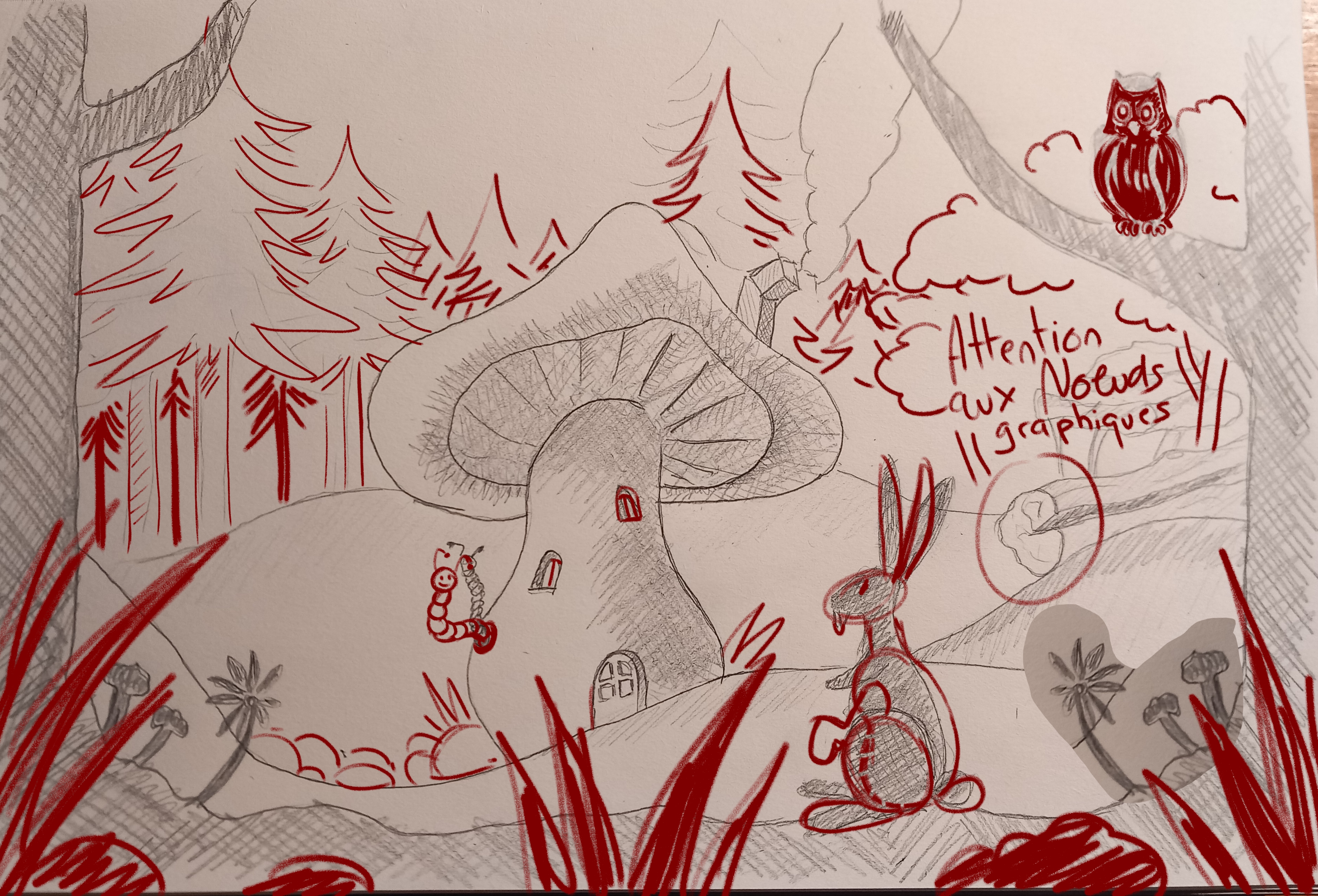 Guten Abend Yves61, Entschuldigung für das Warten ... wirklich toll in dieser Zeichnung! Wenn Sie einige zusätzliche Elemente in Ihre Komposition und in den verschiedenen Ebenen hinzufügen, gibt es eine Möglichkeit, Ihre Illustration erneut zu erhöhen! In solchen solchen Sätzen, ein wenig magisch, können Sie Vegetation, verrückte Kräuter, Felsen usw. machen. Der Wurm, der aus dem Haus kommt, fehlt ein wenig, Sie können ihm ein wenig mehr Dynamik geben, indem Sie ihm eine sehr gekrümmte und wellige Position geben. Achten Sie auf Ihren Hintergrund, der nicht vorhanden ist, es ist sehr verblasst. Es besteht auch ein wenig Sorge um Grafikknoten mit dem Zweig am Recht Ihrer Zeichnung und versuchen Sie, die Elemente so zu positionieren, dass sie sich zwischen den verschiedenen Plänen nicht gegenseitig essen. Auf jeden Fall ist es ein guter Job!