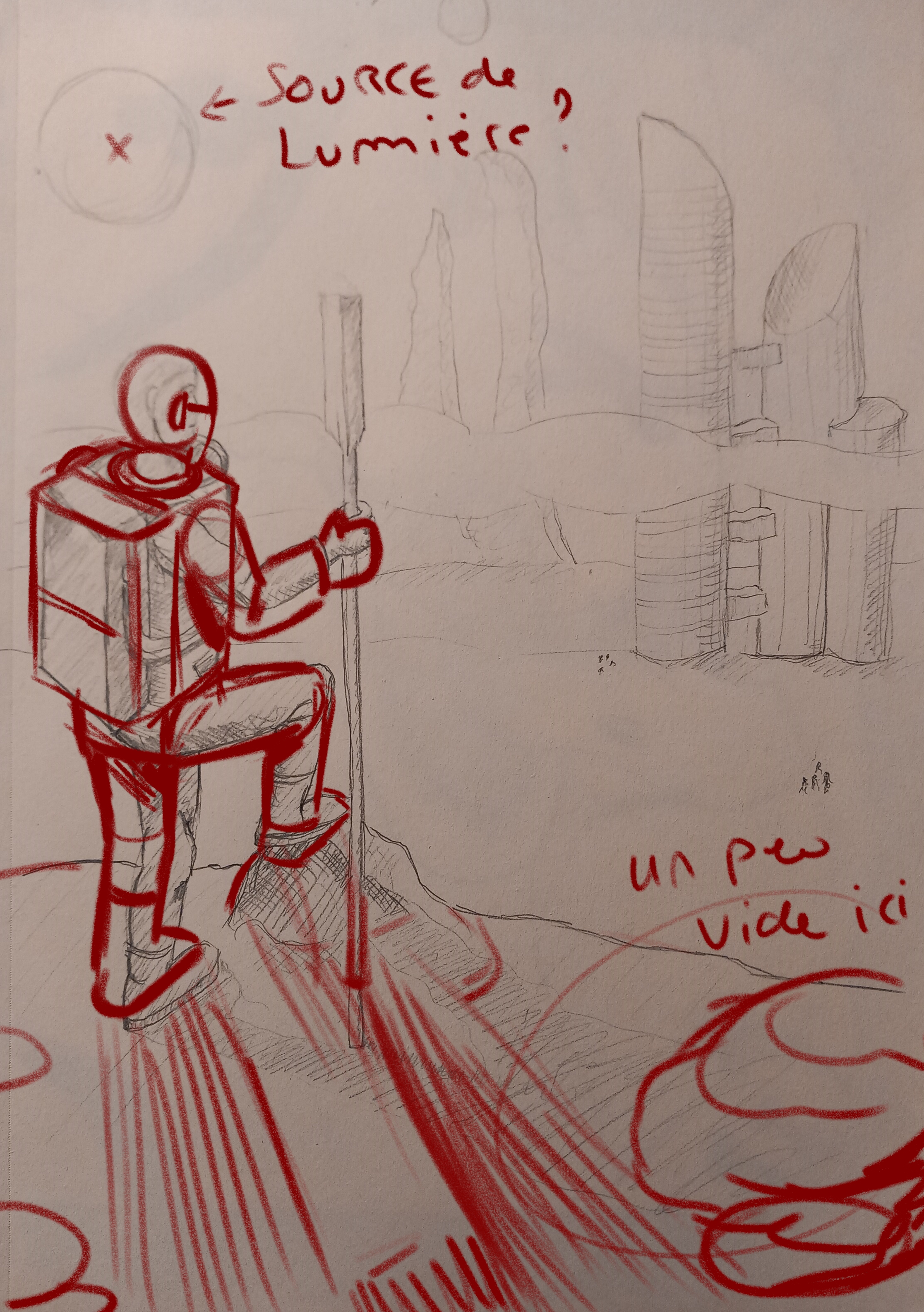 Wirklich toll! Ich liebe den Winkel und die Komposition! Hüten Sie sich vor der Konstruktion Ihres Charakters mit dieser Art von starker markierter Perspektive! Der auf dem Boden getragene Schatten ergibt eindeutig eine Atmosphäre, versucht jedoch, die Lichtquelle gut zu definieren, um sie gut zu projizieren. Gute Arbeit!