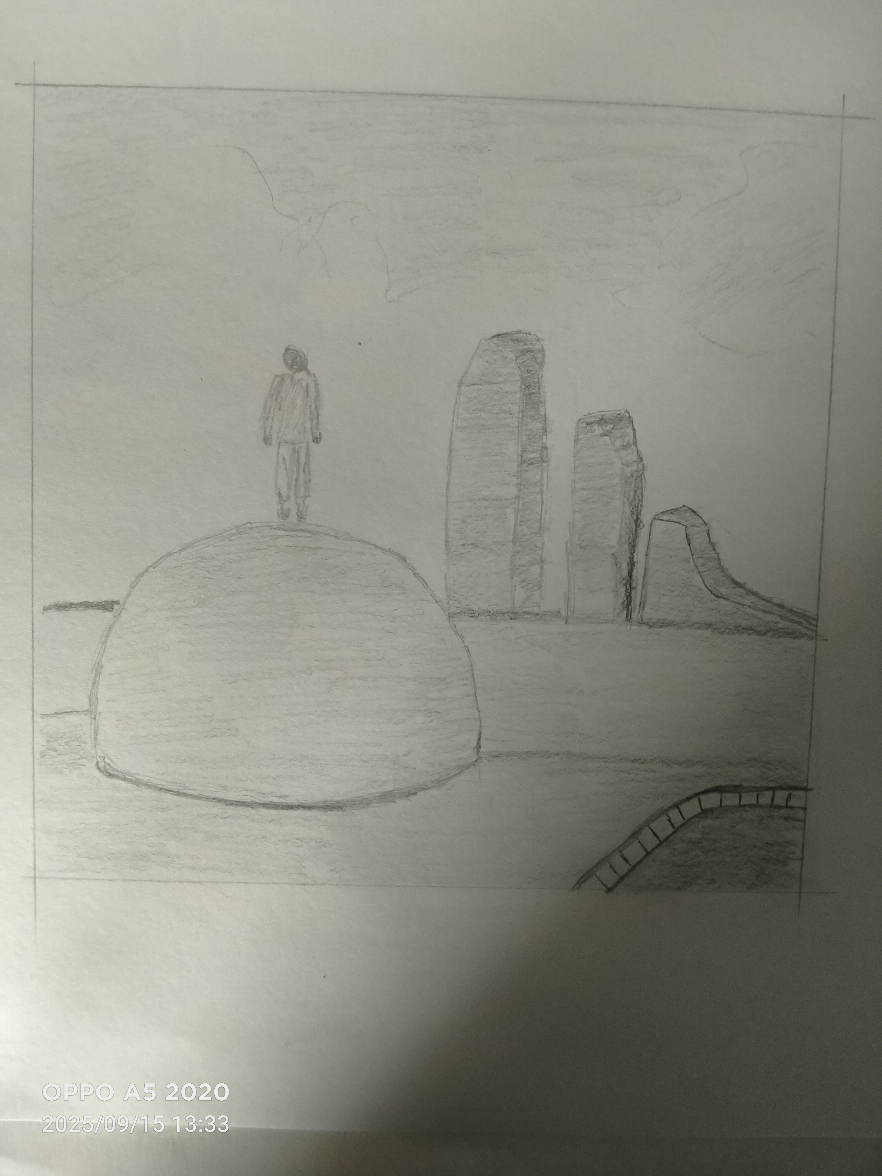 Votre composition semble très intéressante, il a des airs métaphysiques qui invitent la réflexion; En général, les poids visuels sont bien distribués, bien que la figure qui apparaît dans le coin inférieur ne soit pas complètement claire. Je recommande cette proposition à un format plus large pour pouvoir travailler davantage, le résultat pourrait être prometteur.