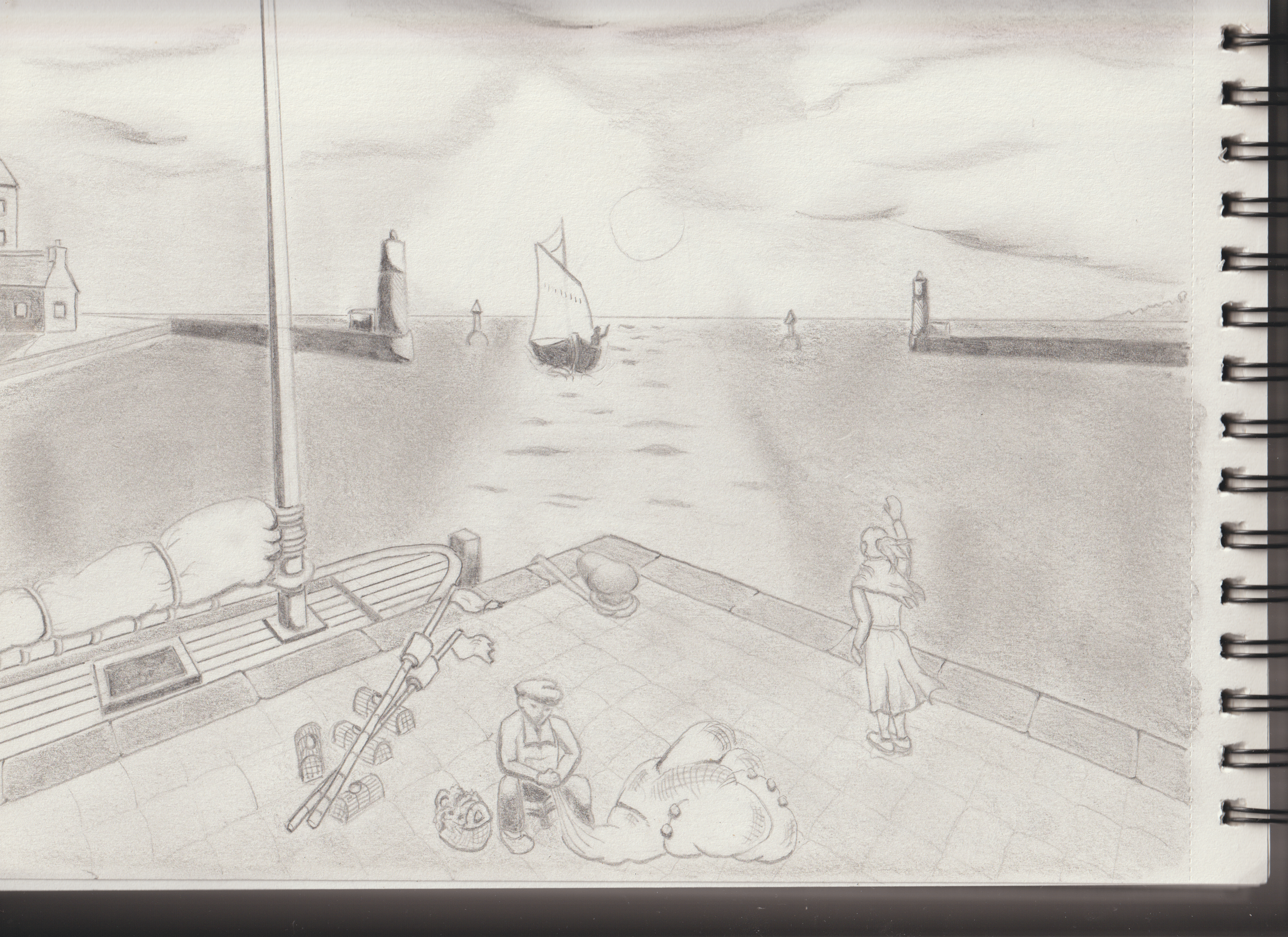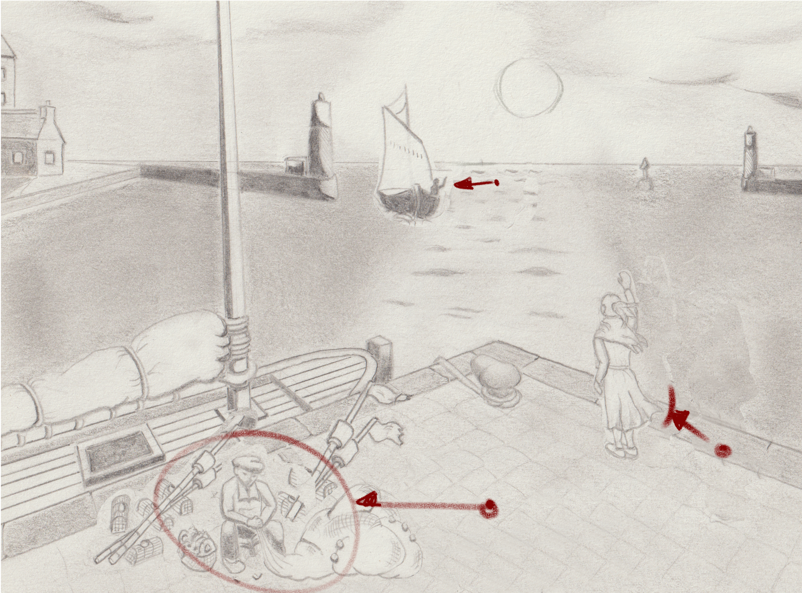 Bonsoir Joquer, désolé, je pensais avoir corrigé ton illustration... C'est du bon noulot, super rendu! Par contre la perspective à deux points de fuite déforme beaucoup tes éléments de premier plan, et ajoute à ça que tous les éléments de ta composition sont placé au centre de l'image, ça créé une surcharge au milieu et du vide sur les côtés... Aussi pour éviter une trop forte déformation dûe à la perspective, il suffit de recadrer un peu ton image et de resserrer ta mise en scène. S'il n'y a pas d'éléments important sur les bords de ta composition alors ça ne pose pas de problème. Tu peux également déplacer les éléments de ta composition pour rééquilibrer ton illustration. Ici j'ai décalé le pêcheur pour qu'il soit moins au milieu et le rapprocher du bateau à quai. J'ai approché la jeune femme du quai et légèrement décalé le bateau sur l'eau... Après c'est à titre d'exemple, tu peux gérer ta composition autrement.