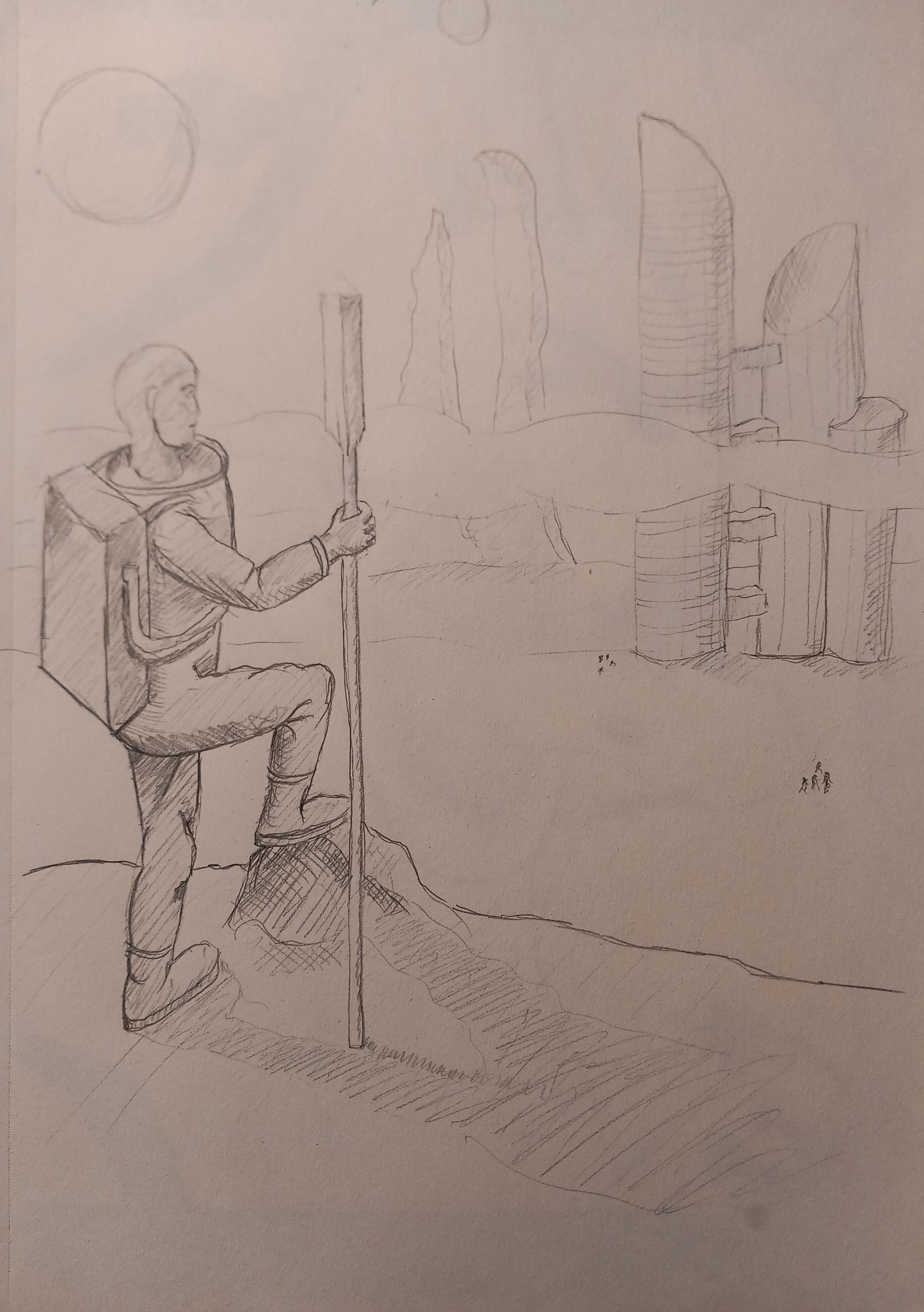 Vraiment super! J'adore l'angle et la composition! Attention quand même à la construction de ton personnage avec ce genre de perspective fort marquée! L'ombre portée au sol donne clairement une ambiance, mais essaie de bien définir la source lumineuse pour bien la projeter. Bon boulot!