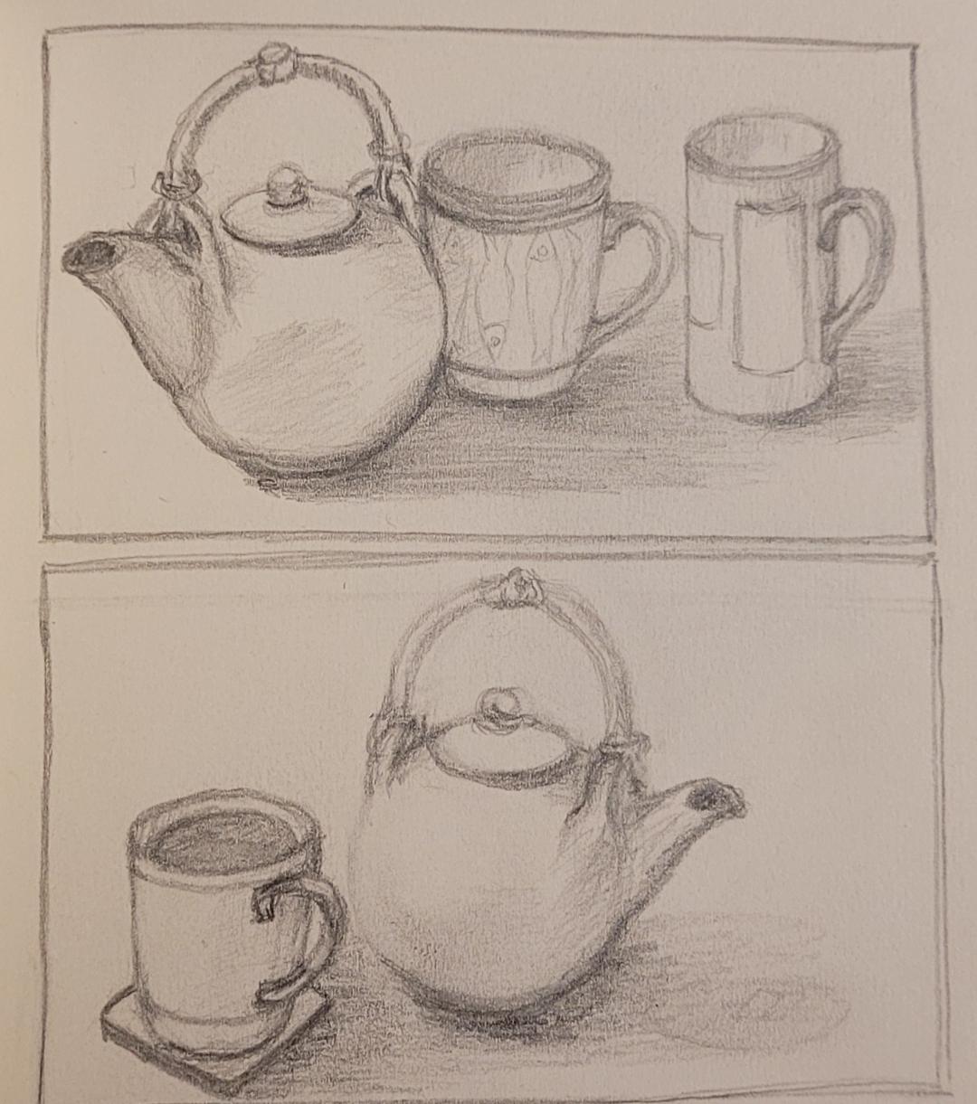 Schön, dass es auf diesen stillen Lebensen wiedergegeben wird, ist es immer eine gute Beobachtungsübung, aber auch für die Platzierung seiner Objekte für seine Zusammensetzung. Zögern Sie nicht, andere Objekte zu verschiedenen Formen und Funktionen hinzuzufügen, um eine kleine Monotonie zu brechen, dass ähnliche Objekte Ihre Komposition (hier, eine Teekanne und Tassen) geben könnten. ;)