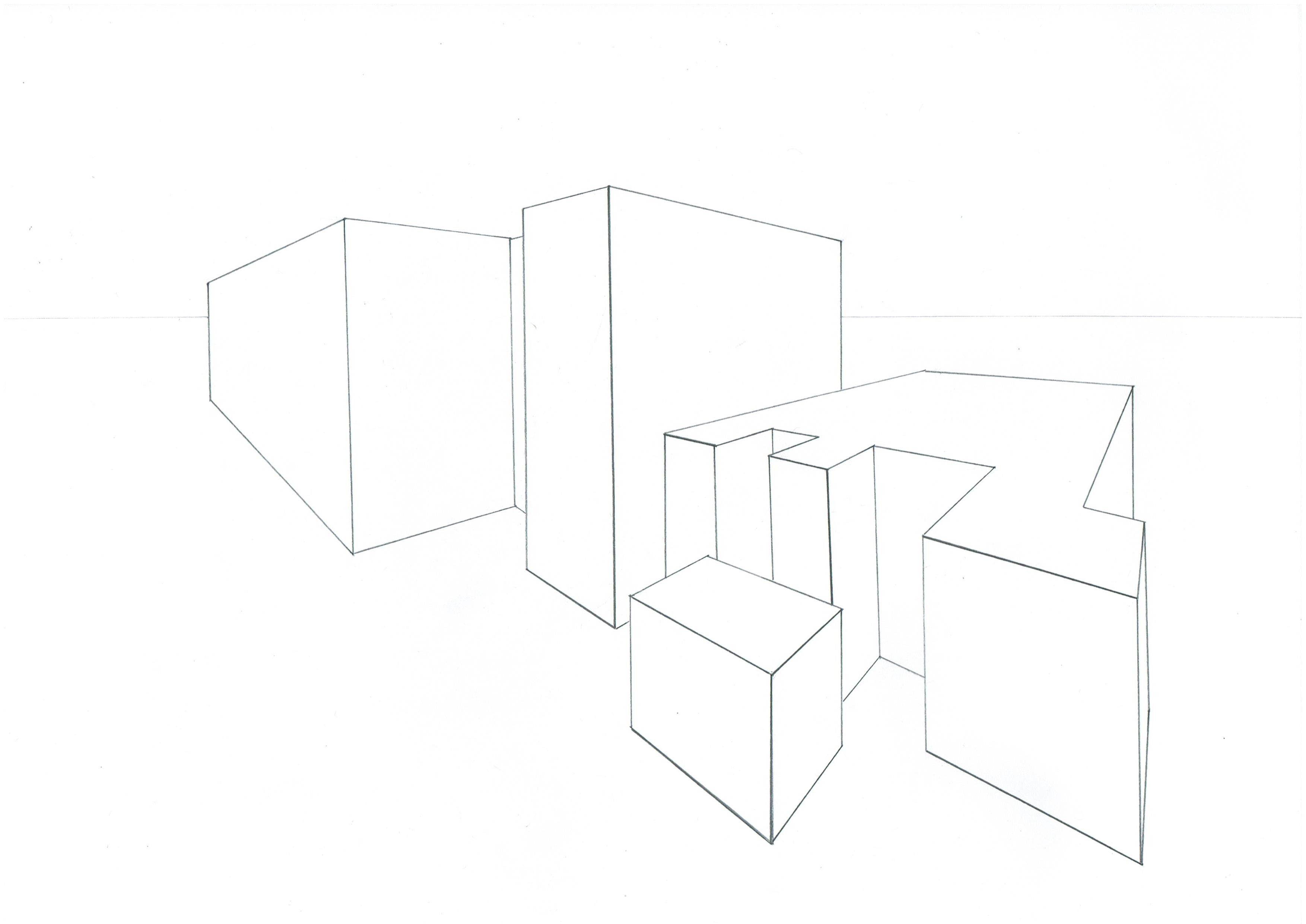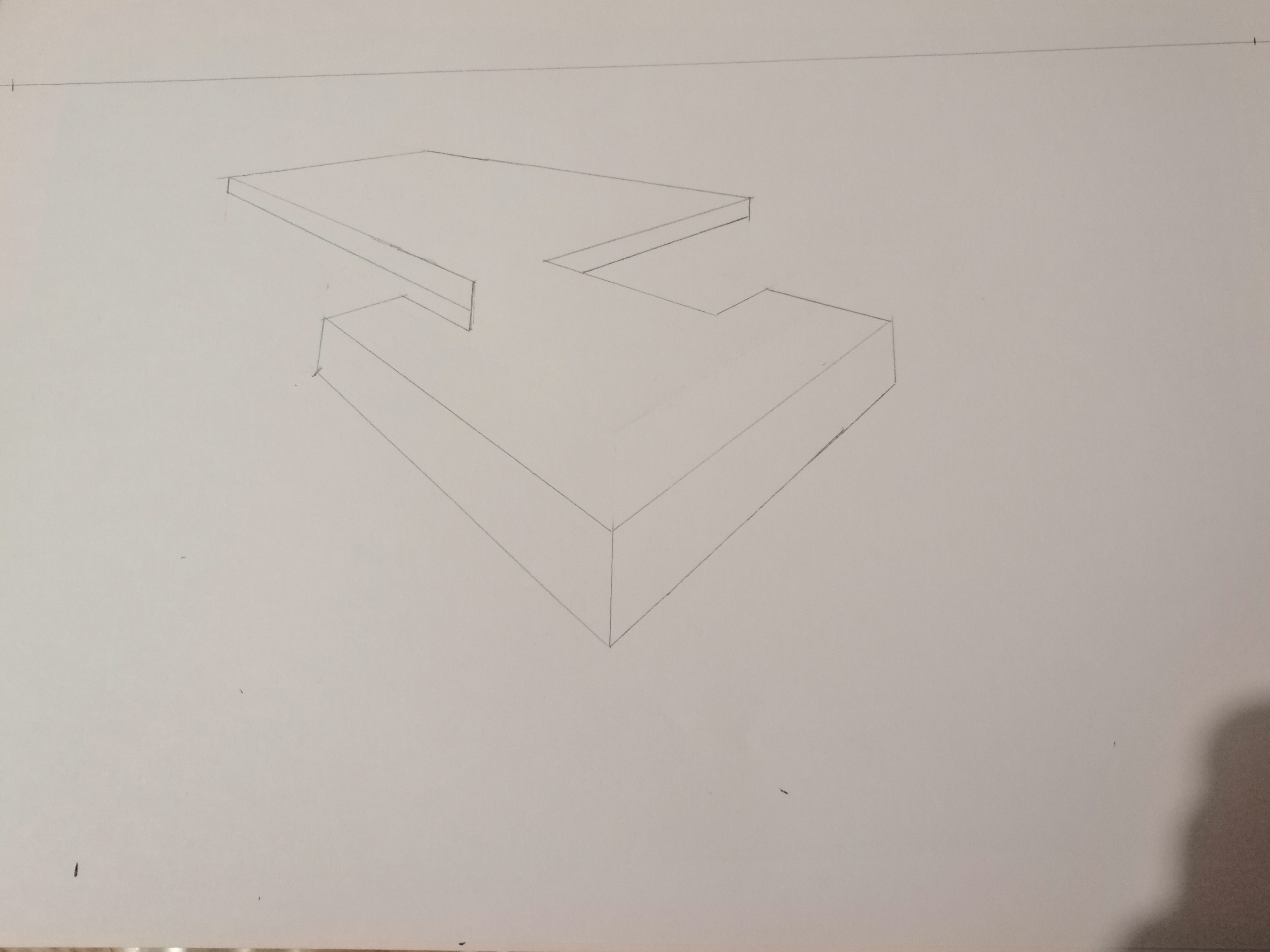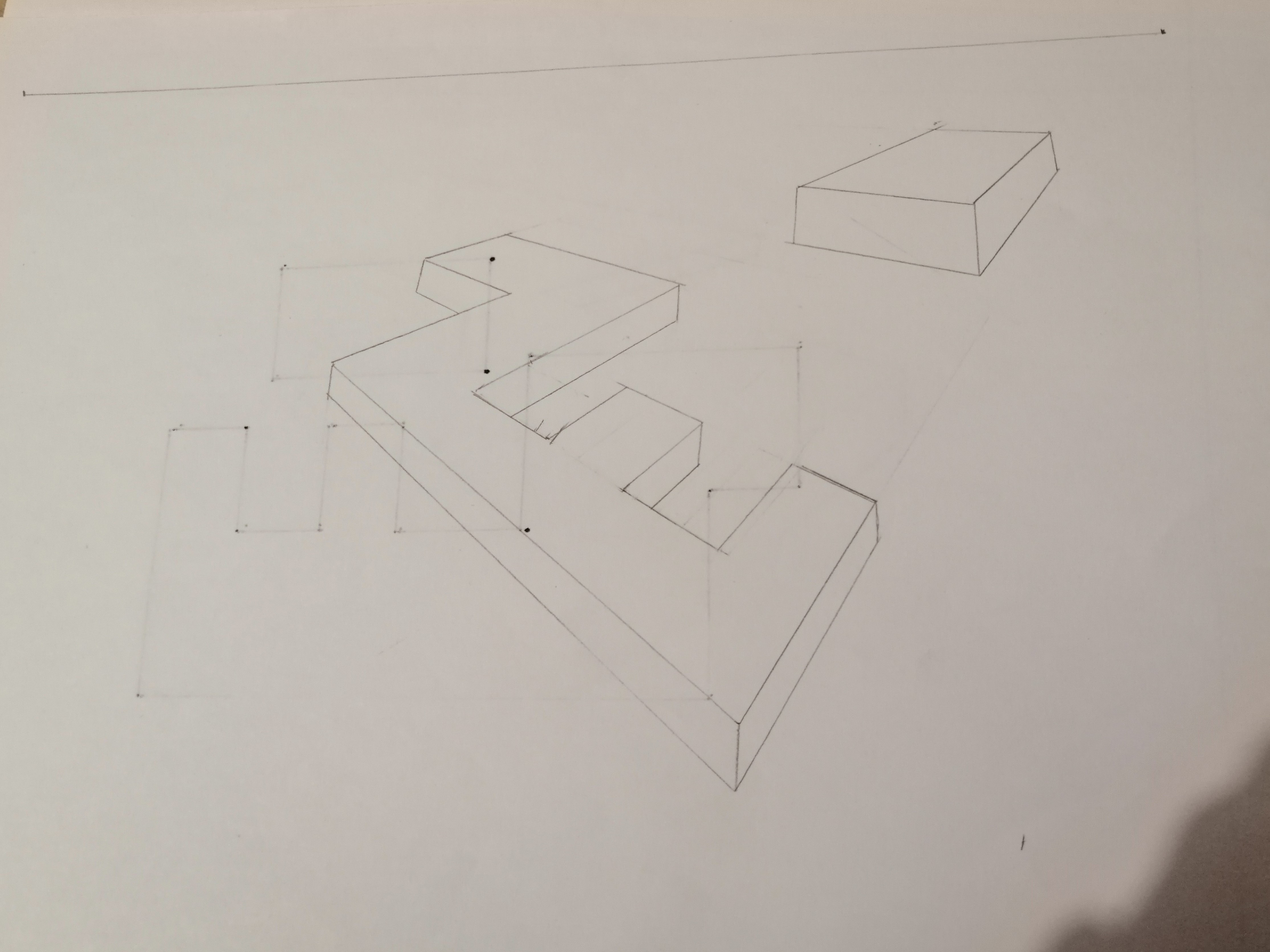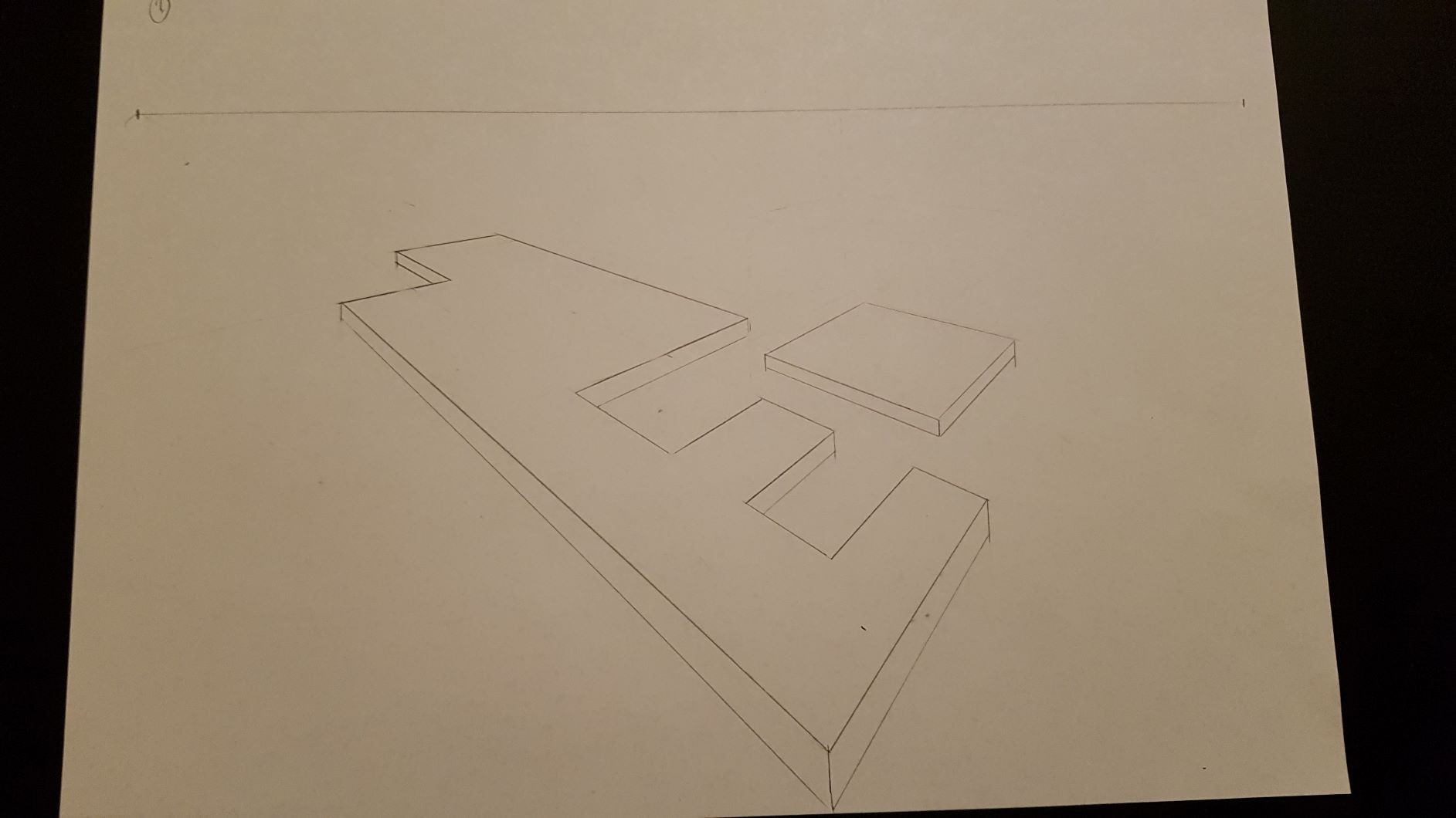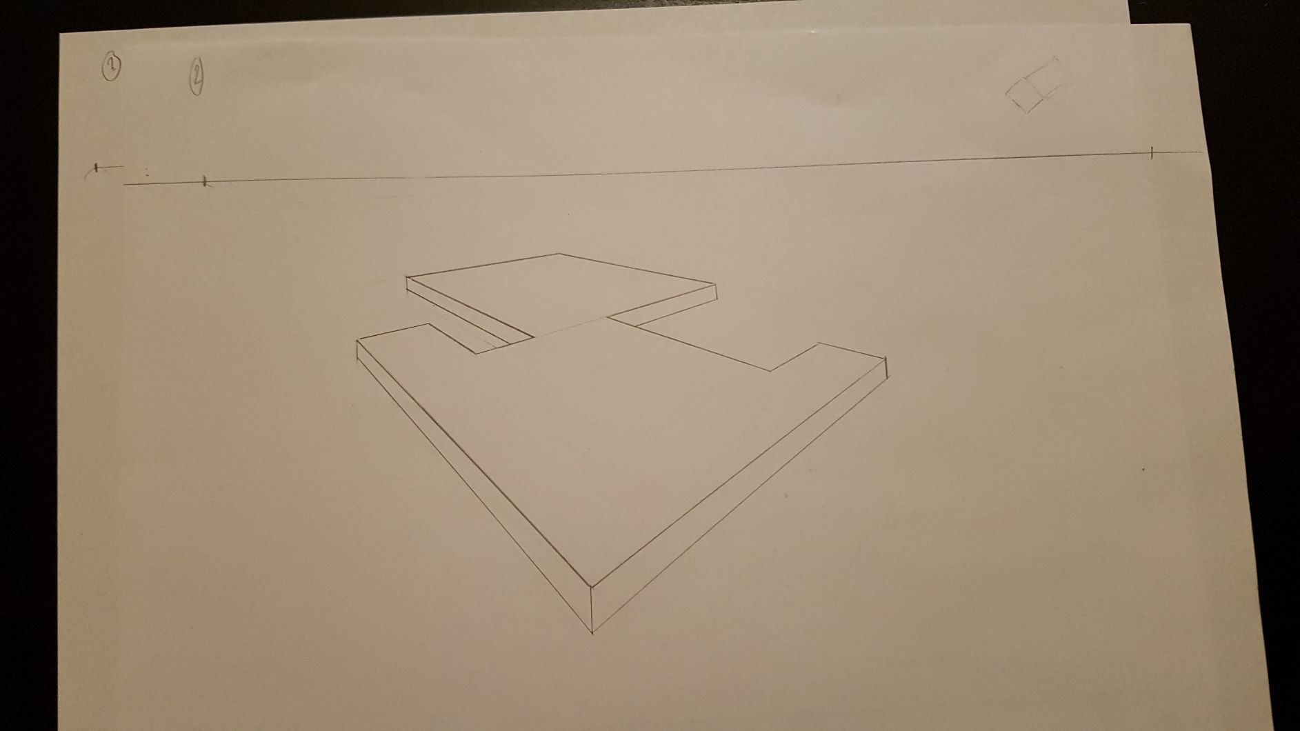Nun, ich frage mich, wie Sie Ihr L mit diesem dritten Fluchtpunkt des Schlags gebaut haben. Normalerweise ist es das gleiche Prinzip wie bei den Flugpunkten, die an der Horizontlinie platziert sind: Sie wählen, wo sie sind, und Sie schrecken die entsprechenden Linien zu ihnen.