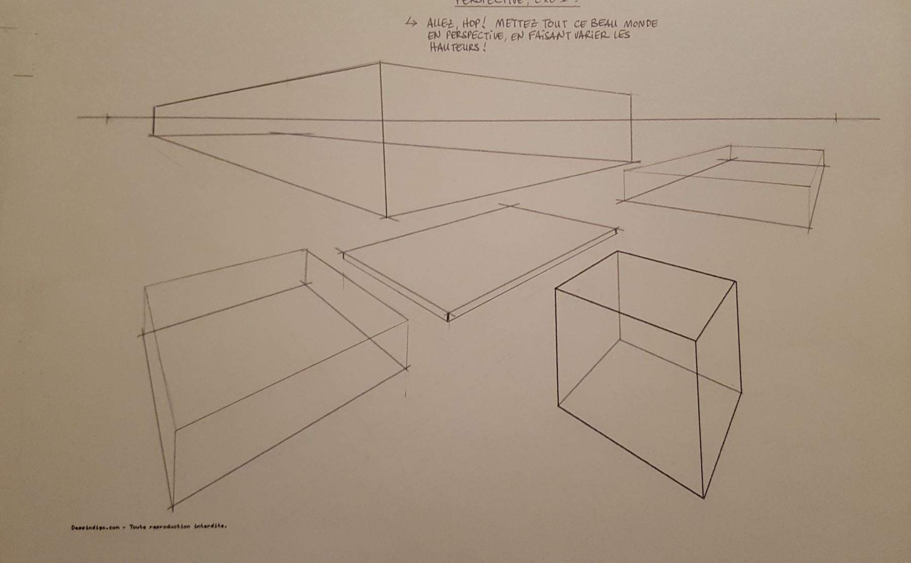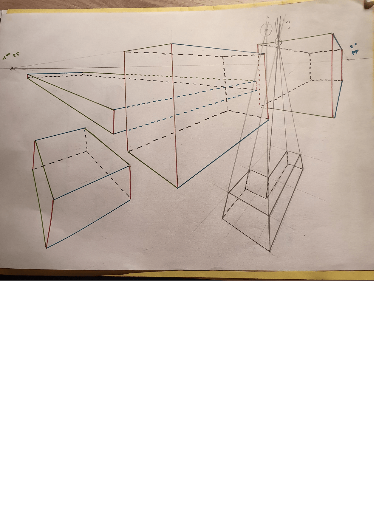 Merci pour votre reponse, j'ai compris que c'est possible d'avoir des points de fuite differents (mais toujours sur la meme ligne d'horizon) pour des objects qui ne sont pas parallele entre eux. Petit a petit ca va rentrer :)