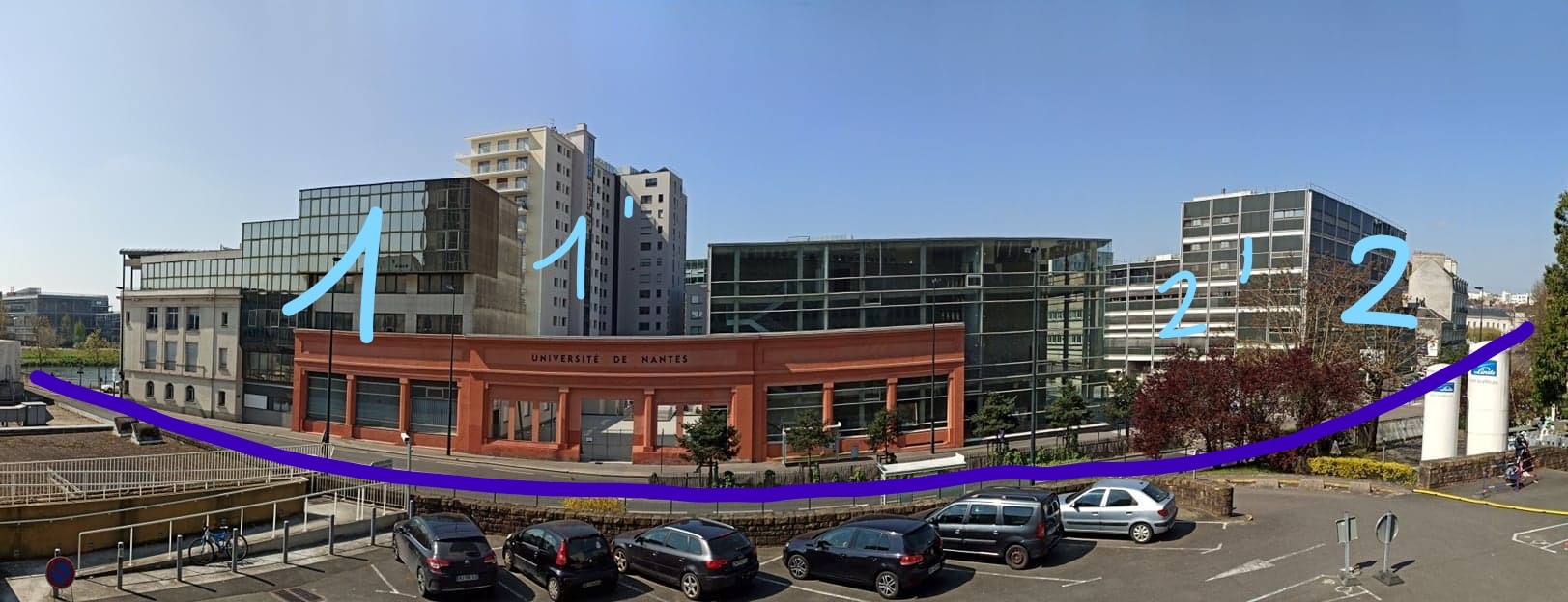 - Les faces 1 et 2 des bâtiments sont parallèles en réalité mais elles n'ont pas le même point de fuite, j'ai donc fais correspondre les points de fuite de 1 avec 2' et de 2 avec 1' mais est-ce correct ?