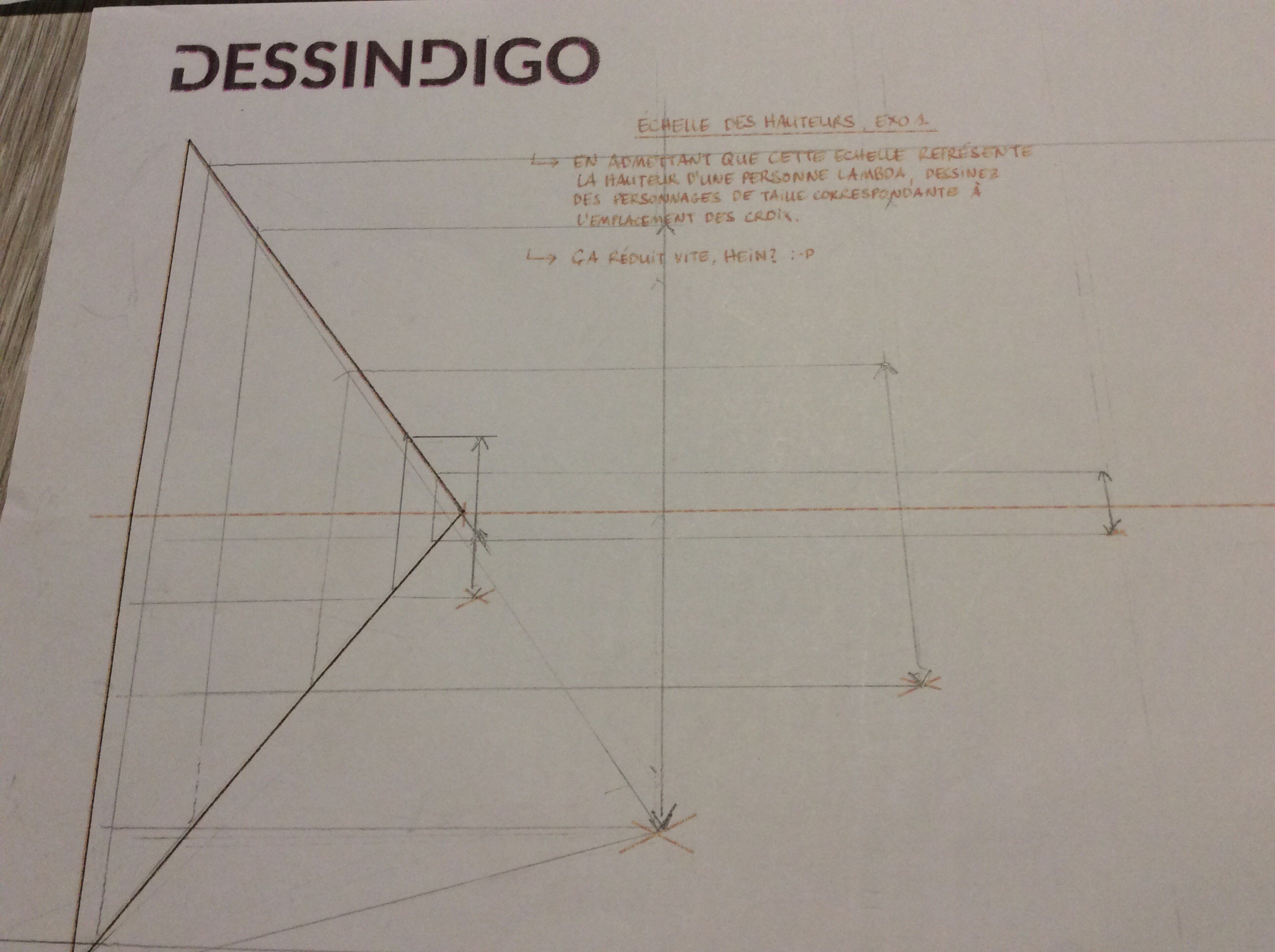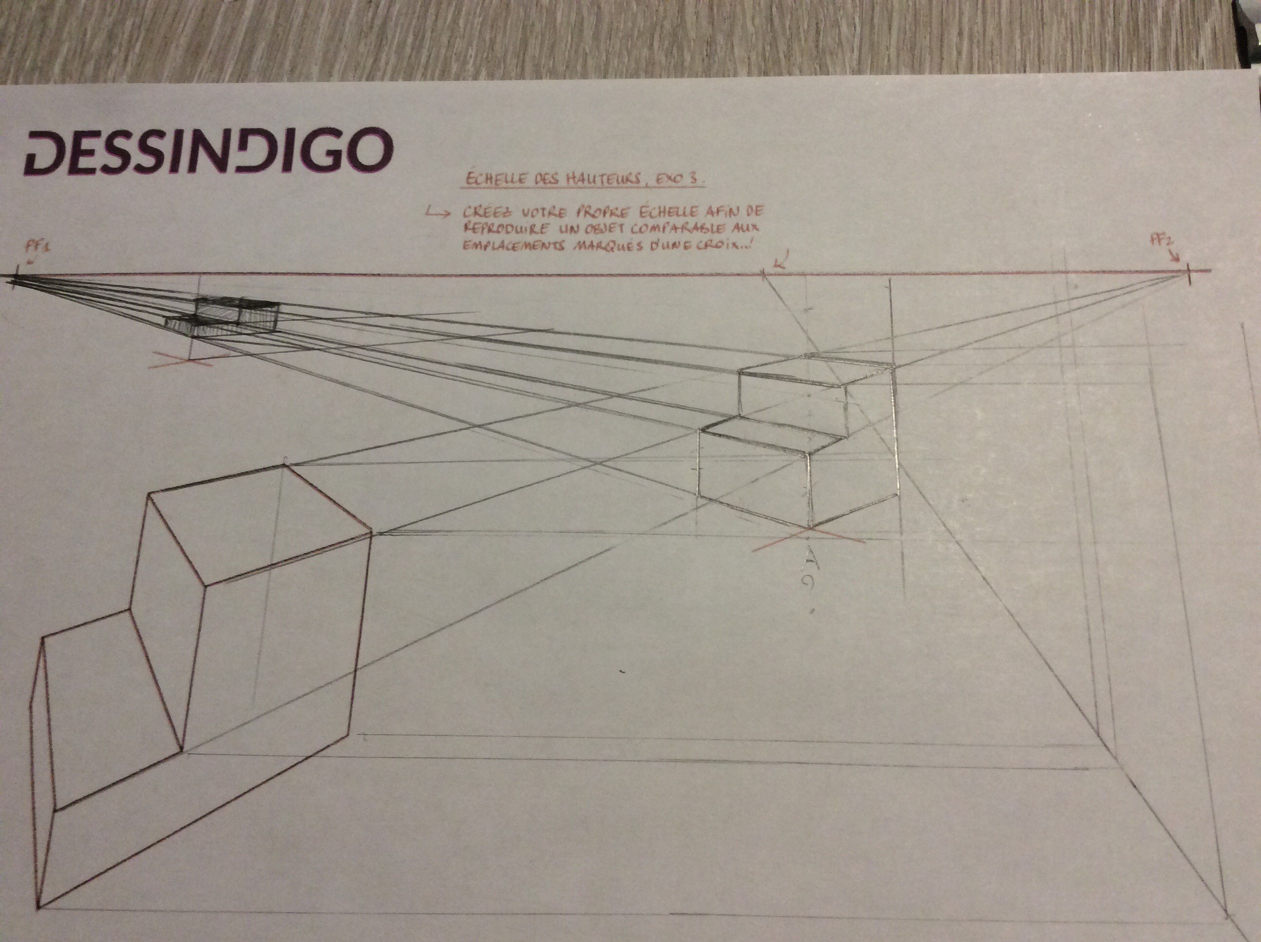 Diese Technik stellt sich als kostbar heraus, sobald wir eine Zeichnung mit mehreren Plänen ziehen werden. Also habe ich versucht, die Höhen zu respektieren. Für den Beginn der Treppe von EX 3 glaube ich, dass mir die Strenge fehlte, weil ich die Höhe des Gehens 1 im Vergleich zu Gehen 2 nicht wirklich berücksichtigt habe. Ich war mit der Gesamthöhe der 2 Stufen zufrieden. Es muss gesagt werden, dass ich ein wenig mit der Perspektive besorgt war. Kurz gesagt, es gibt ein kleines Pifometer im Test 😉. Ich hoffe, es funktioniert grob.
