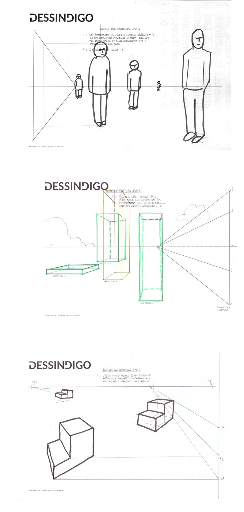 Cette technique se révèle précieuse dès qu'on va faire un dessin avec plusieurs plans. J'ai donc tenté de respecter les hauteurs. Pour le début d'escalier de l'ex 3, je crois que j'ai manqué de rigueur car je n'ai pas vraiment tenu compte de la hauteur de la marche 1 par rapport à la marche 2. Je me suis contenté de la hauteur globale des 2 marches. Il faut dire que j'étais un peu préoccupé par la perspective. Bref, il y a un peu de pifomètre dans l'essai 😉. J'espère que ça fonctionne à peu près.