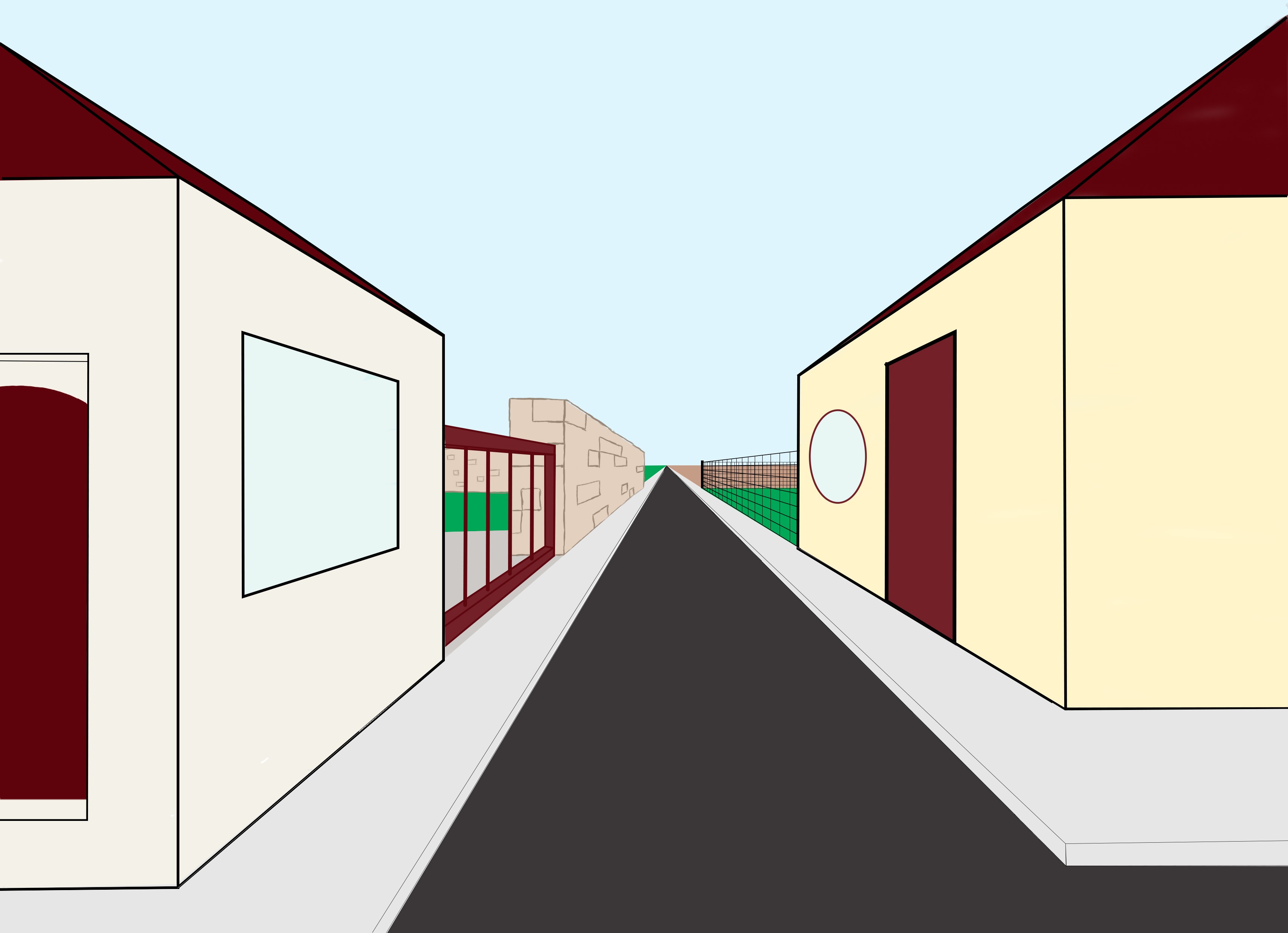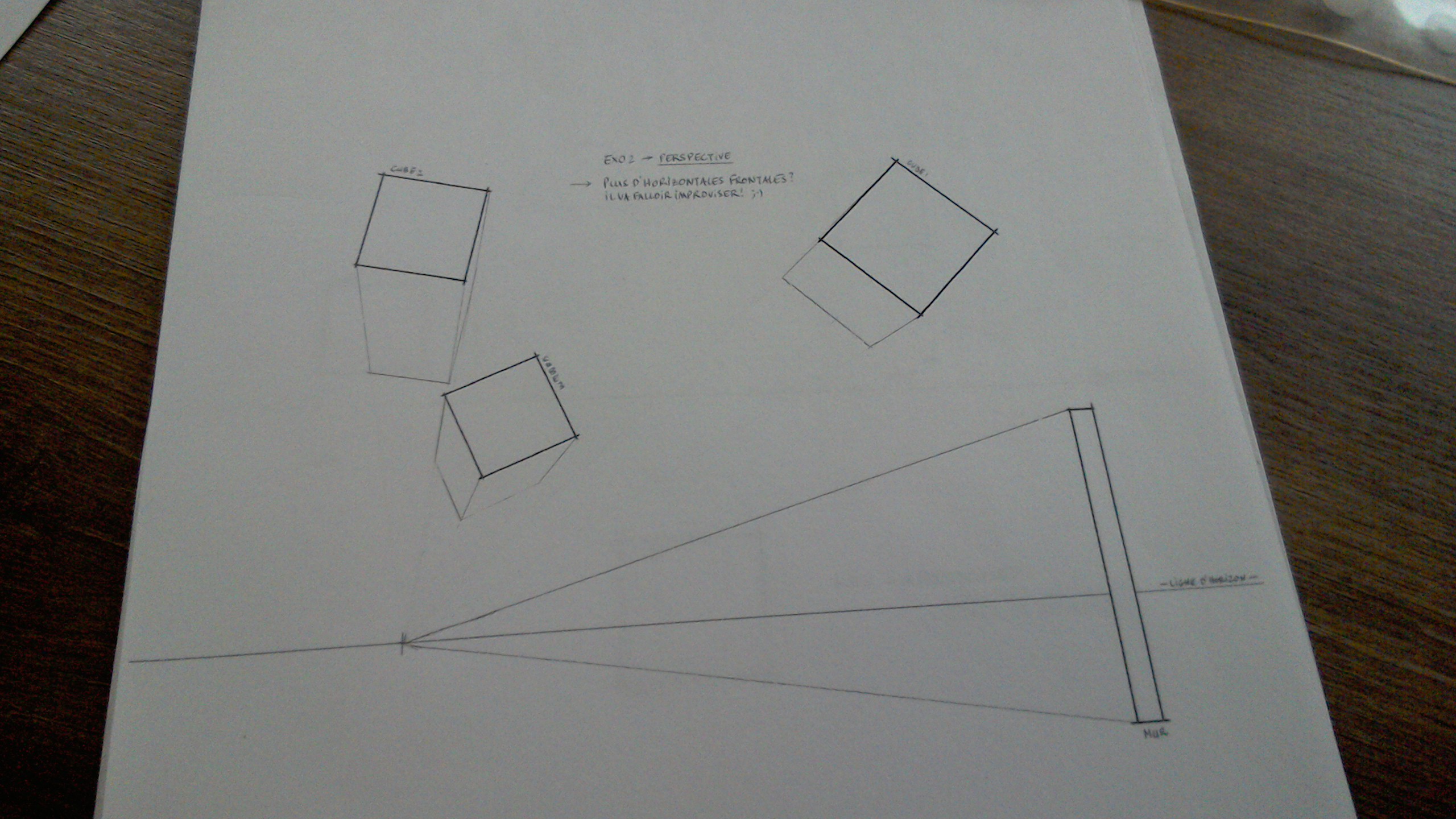 Du coup, je suis très excitée de voir la suite, pleins de perspectives s'ouvrent enfin, je me suis un peu amusé sur photoshop du coup a essayé avec 1 point de fuite simple pour bien encrer le concept avant de passer à la suite.