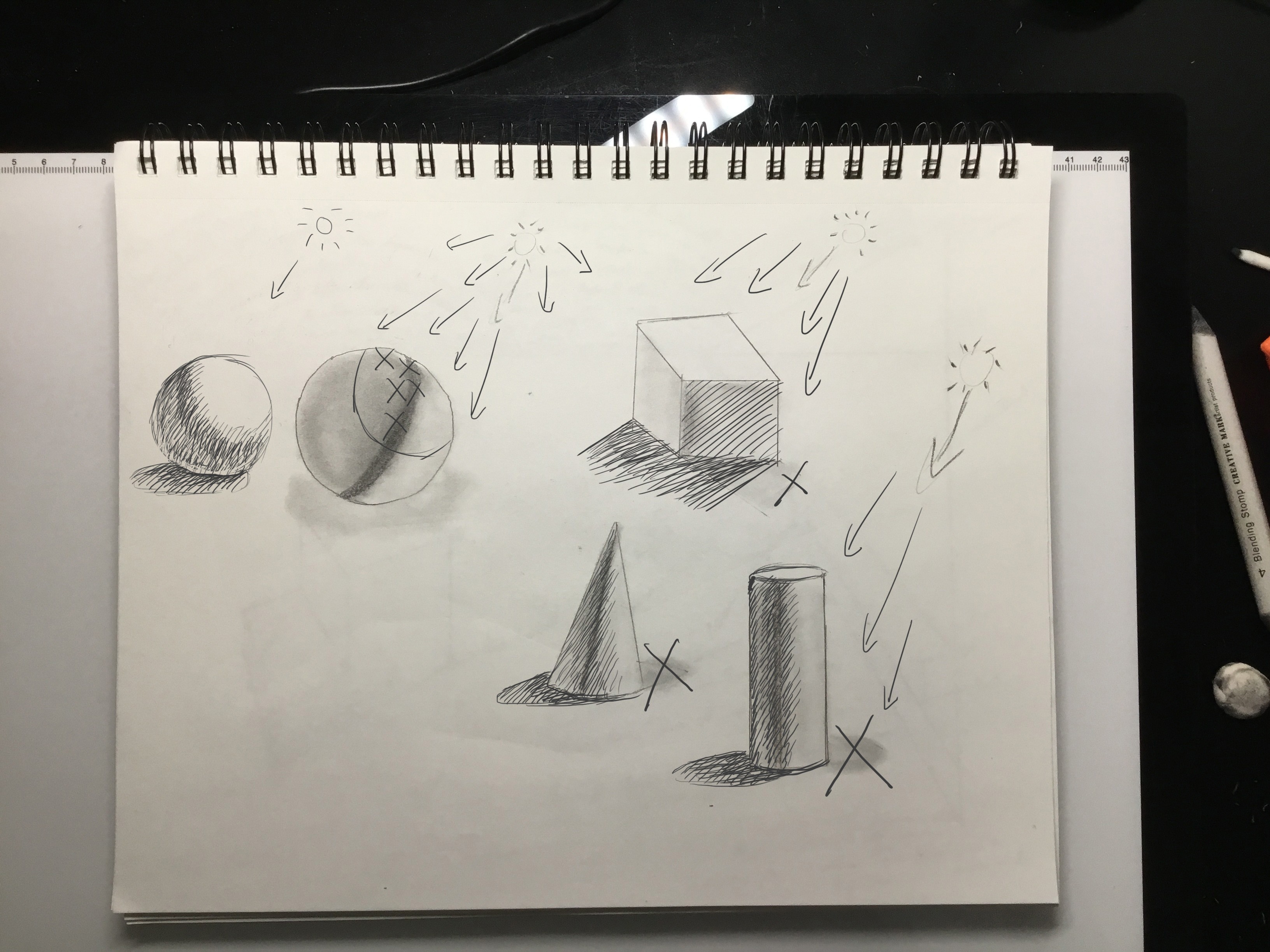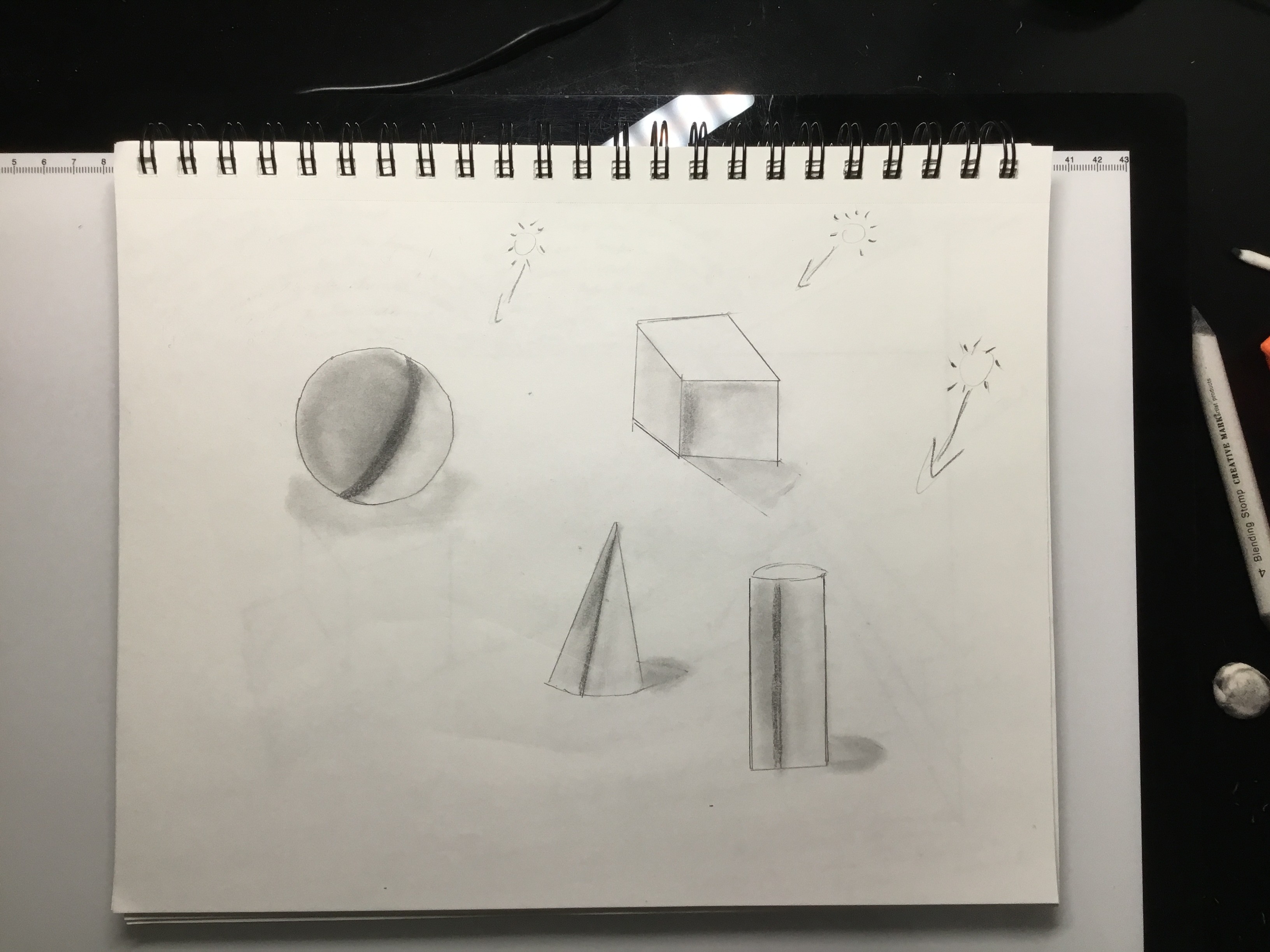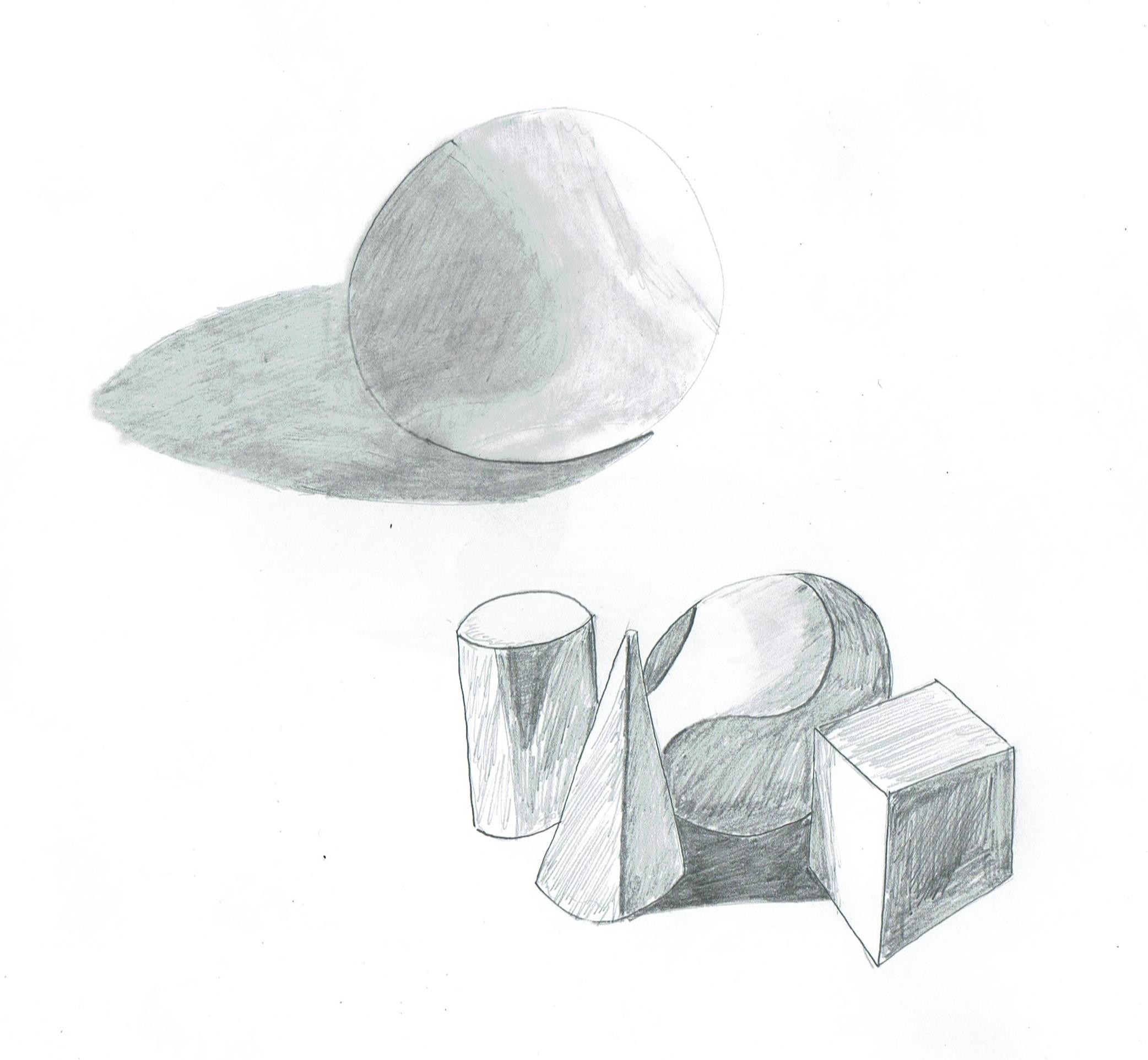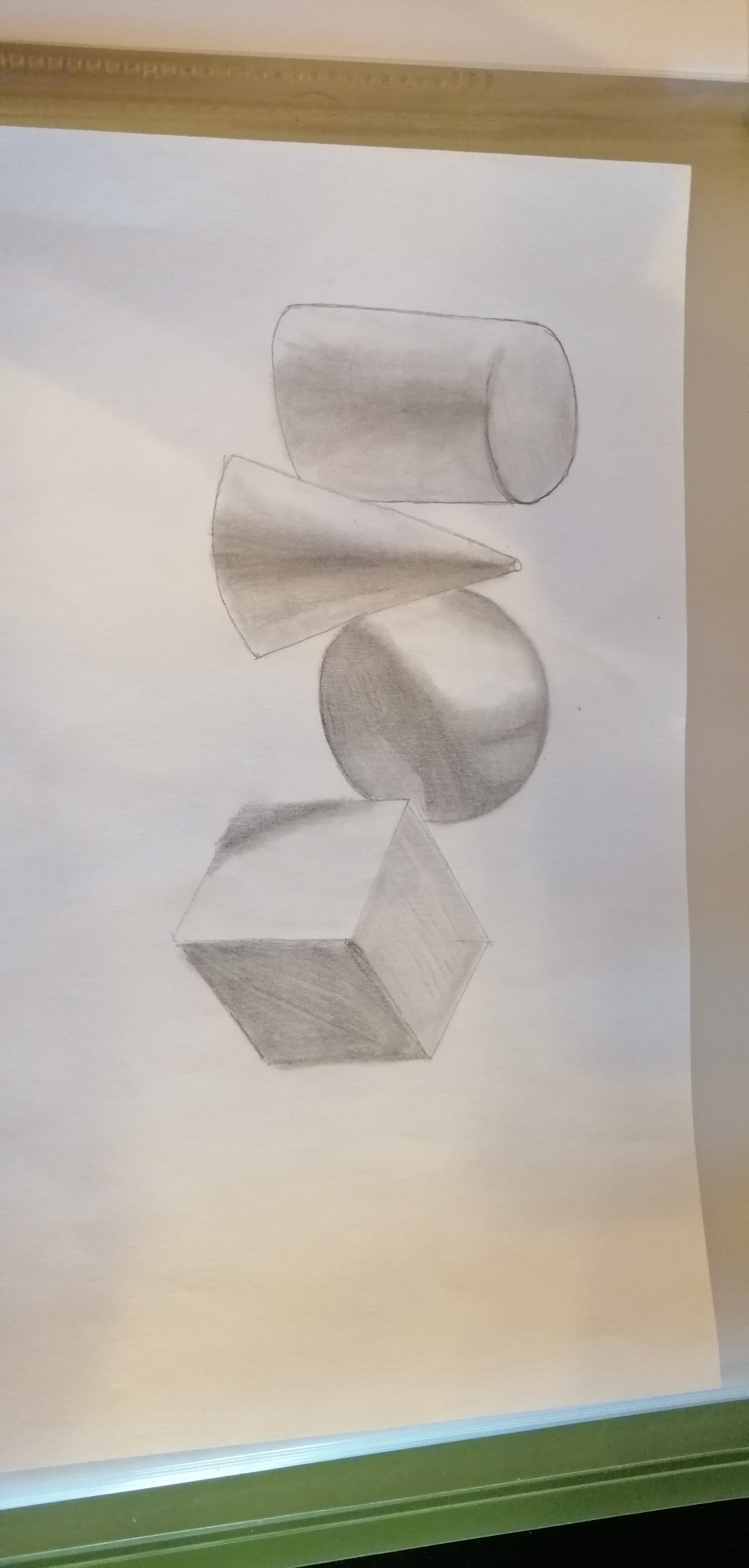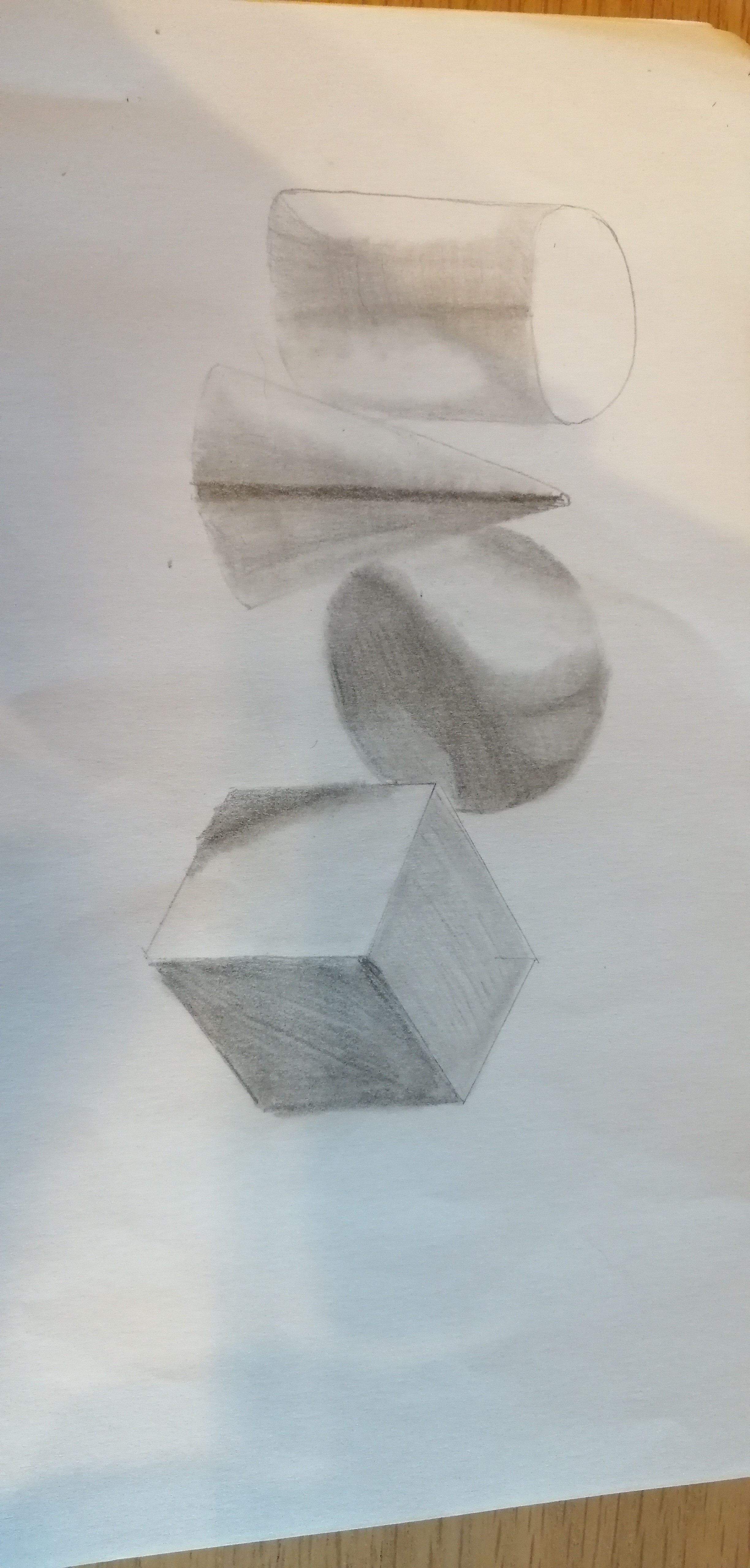 Cylindre et cube impeccables. Pour la sphère, l'ombre est beaucoup trop tranchée. Elle devrait être plus diffuse. Attention à la position de ta source de lumière. Ton cube et ton cylindre ont la même. Mais ton cône et ta sphère non. De ce que j'en vois, la lumière vient de la position du spectateur, un peu en haut à gauche.